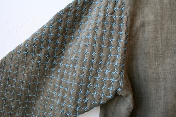 We are sharing more photos here of the Tanno coats mentioned below. Designed and made by Don Kimon Lightner, these are very special pieces that we are honored to have in our shop. The craftsmanship, the vintage fabrics used, the buttons, the sashiko... all these elements makes these coats so beautiful. Each one is one of a kind. This one shown in the photos above is made of a vintage khaki cotton with an Indian cotton plaid lining. The stitching is all by hand- including the designer's sashiko stitching all along the sleeves and pockets. It has antique buttons and hand stitched button holes. It's a stunning piece and looks great on. There is a photo of Heather wearing it in the previous post.