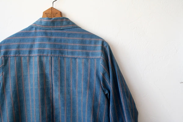 The coat above is made of vintage striped cotton, Indian chambray lining, and a beautiful plaid detailing for the inside pocket and sleeve lining. This has a lovely Peter Pan collar like the one above it. This piece, like all of them is hand stitched and has antique buttons. We love this worn with other stripes like in the photos below.