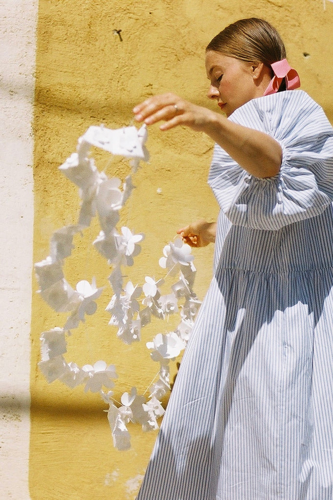 Heather, wearing our Bon Puff Dress in ticking stripe and holding paper garlands we made for decoration <3