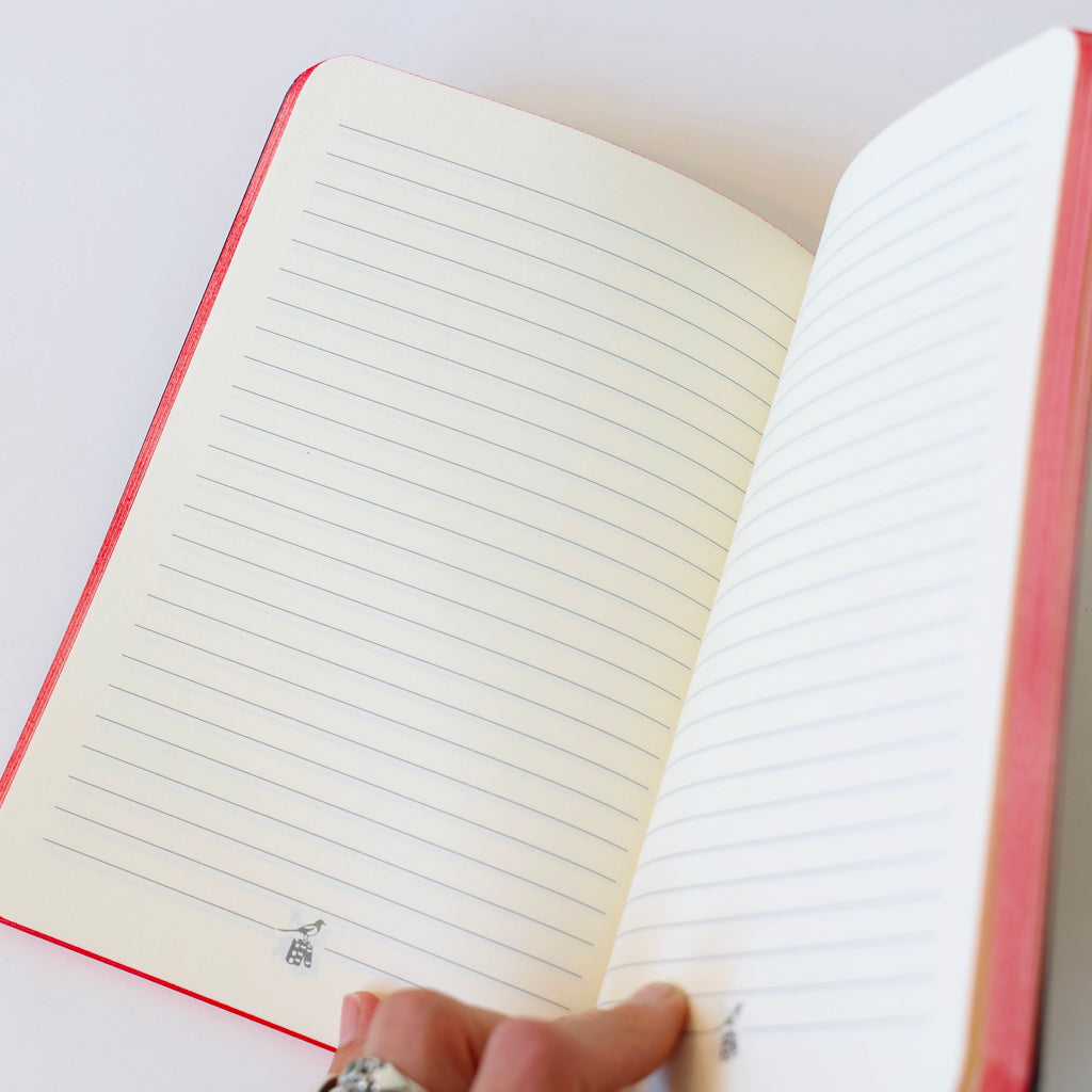 Beautiful notebooks made in Italy by an old-school stationery maker. These have soft covers and are hand bound. The red edged paper is applied by finger dabbing the color bit by bit. The bird on the cover is gold embossed and the feel of the soft cover has a leather like quality, but is made of paper. These are fantastic and they come in 4 sizes - 3 blank options and one lined option. The options are the following -
