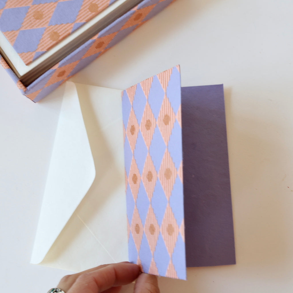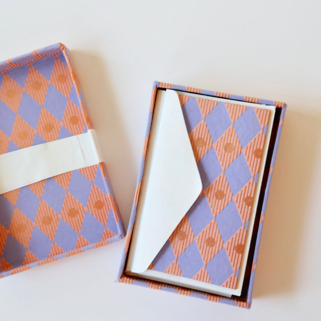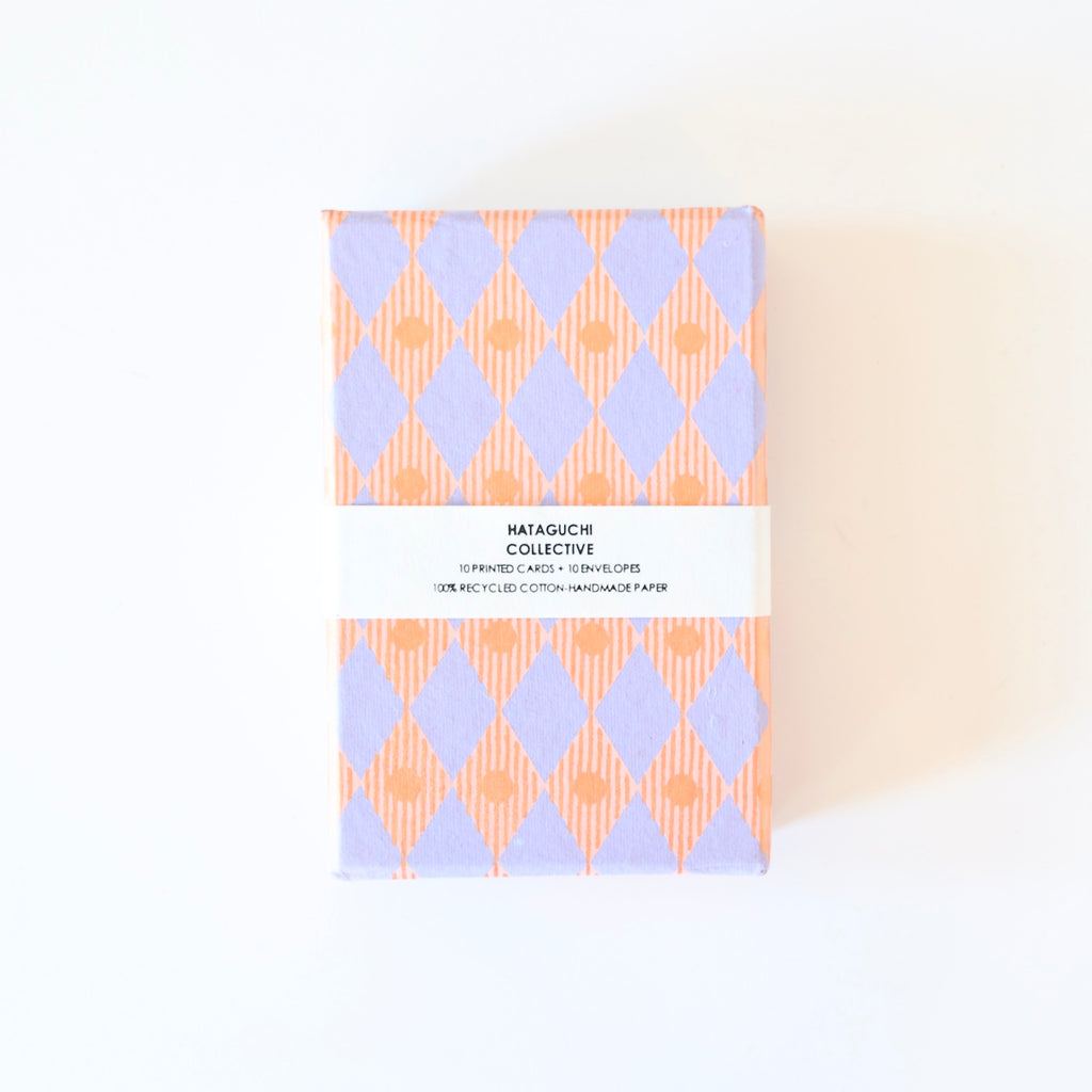 A beautiful set of 10 cards and envelopes made of handmade and handprinted paper. The cards have a tall shape, measuring 3.5" wide by 5.5" tall. These are wonderful to have on hand for your writing needs! The box is beautiful on its own and can be saved and used for other things after the cards have all been used.