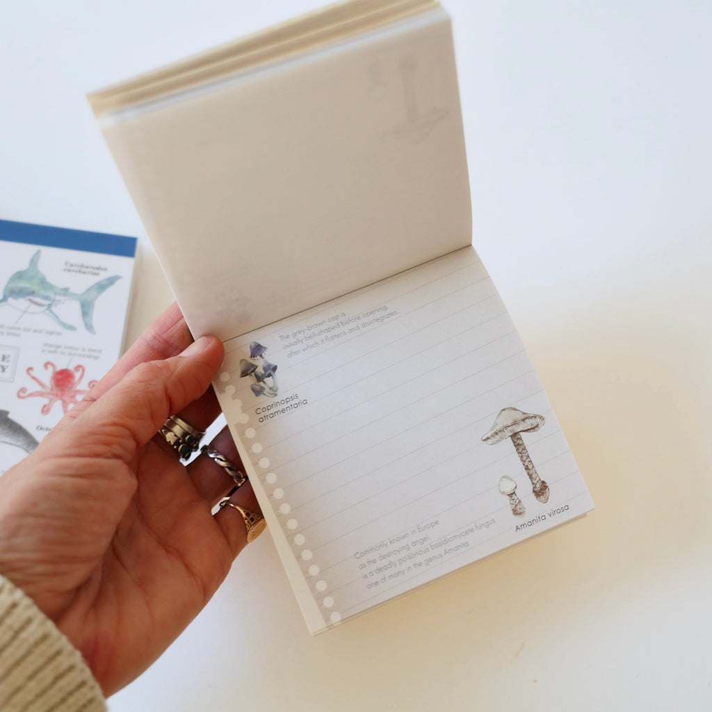 Wonderful little notepads with different illustrated themes. choose from Planetary Science, Mycology and Marine Bilogy. The paper inside has a variety of softly colored illustrations - any notes made on the paper are easily visible. These are fun to give as a gift!