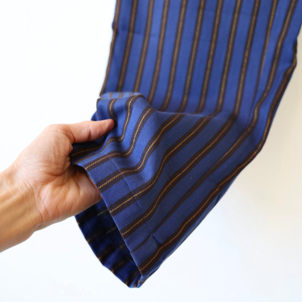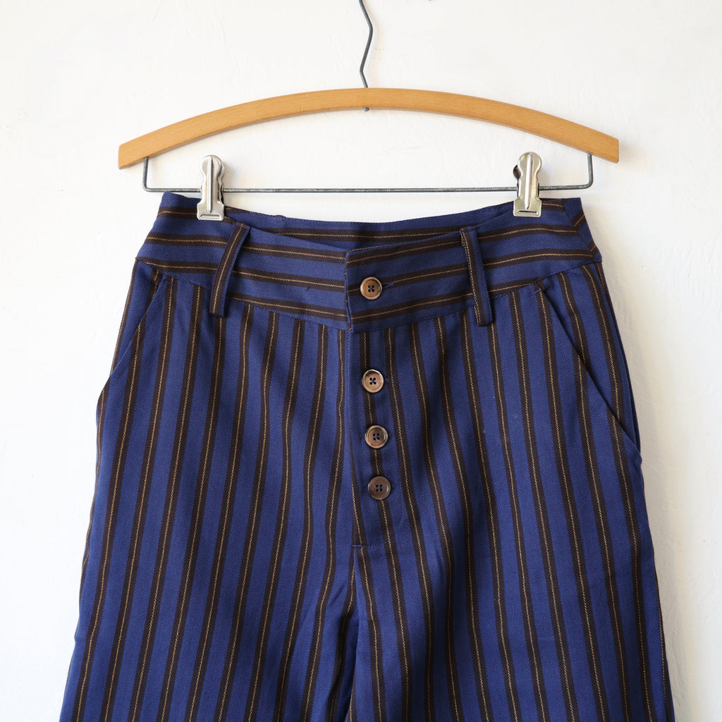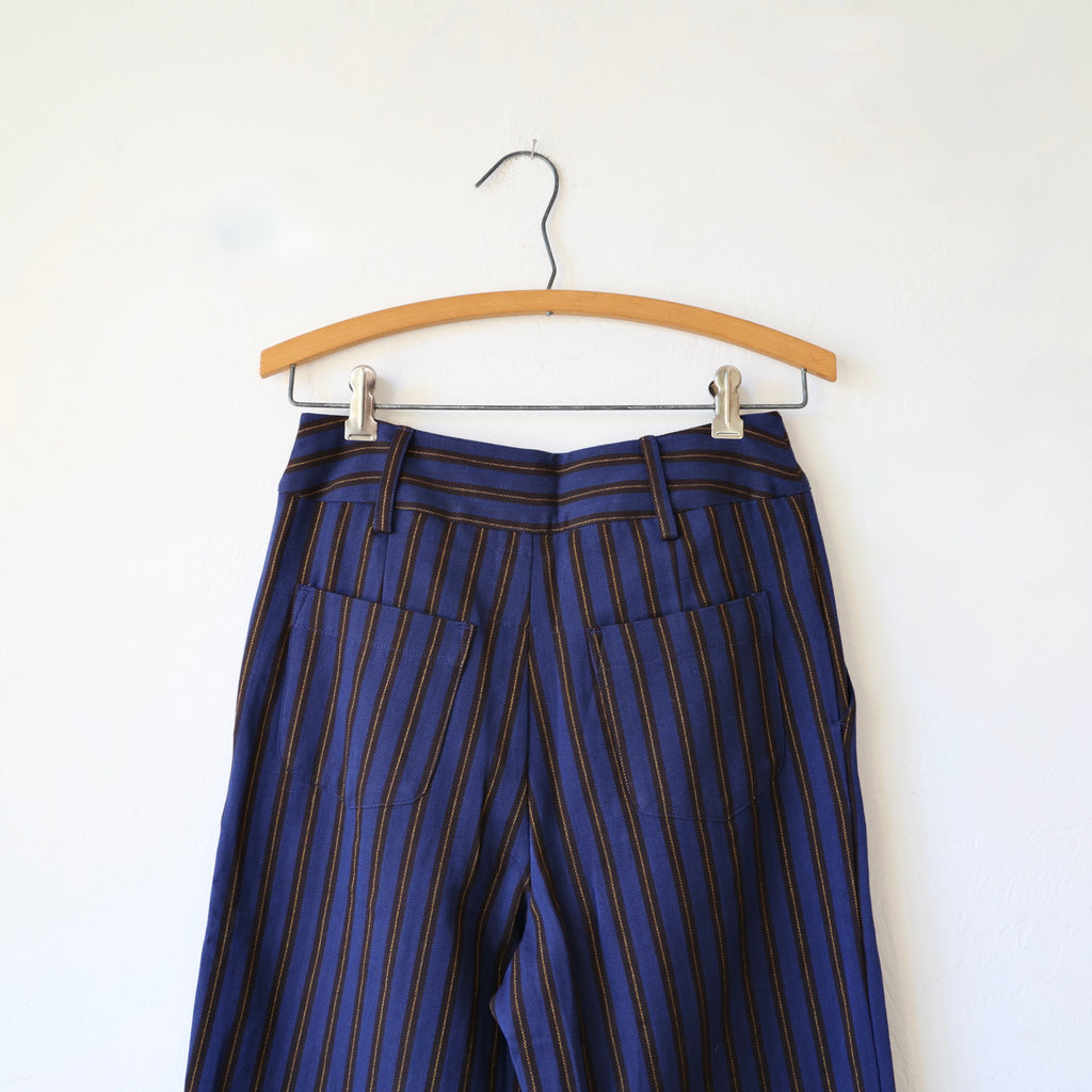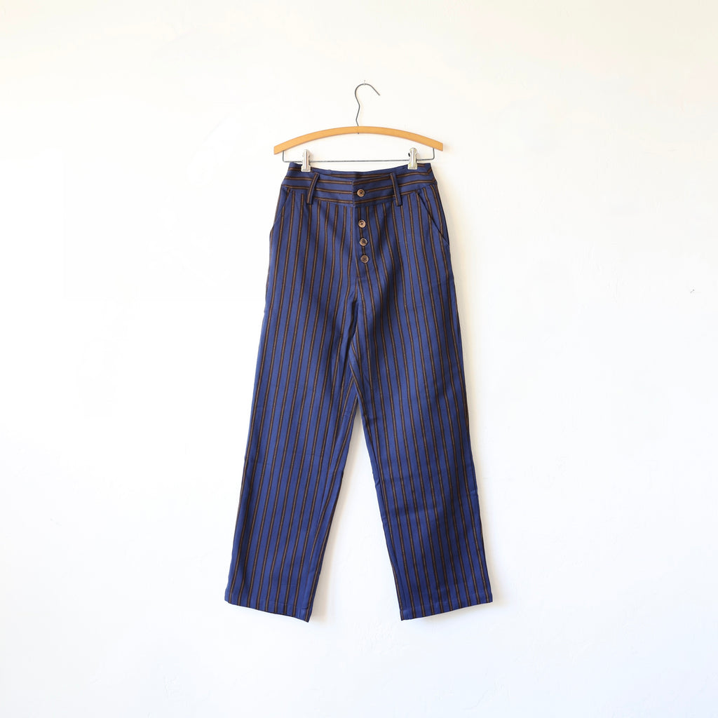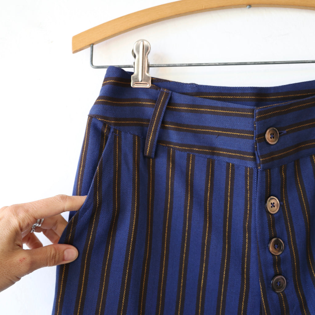 Gorgeous pants made of a cotton herringbone with a brushed finish on the inside. The stripes are navy, mocha and metallic gold. These have a visible button closure at the front, side pockets and back patch pockets. They have a straight cut. P. Le Moult typically makes pajamas, but these are great for wearing out of the house!