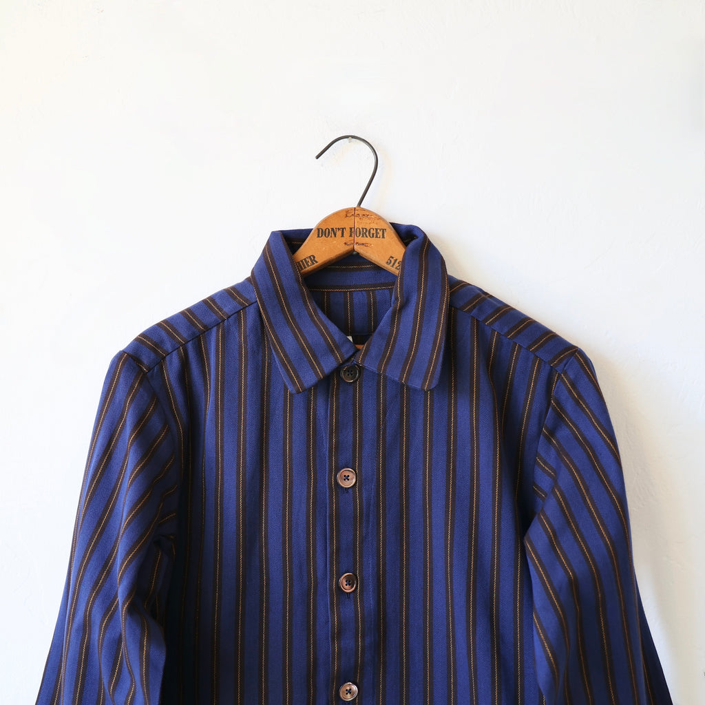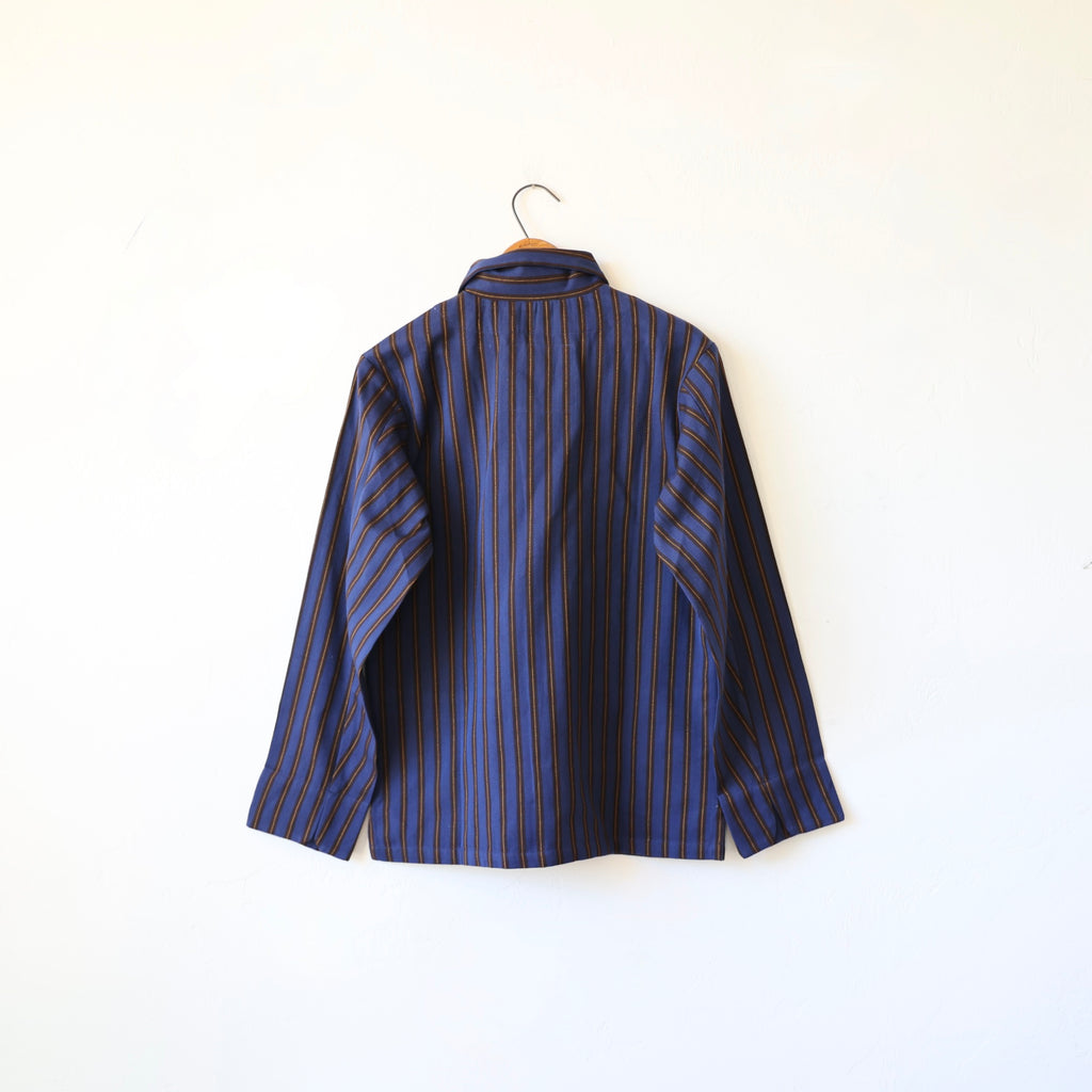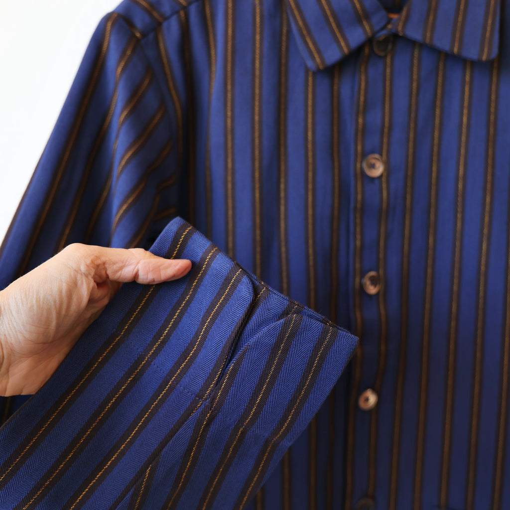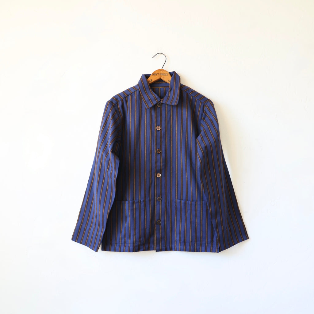 We are over the moon for this piece! It's a jacket or shirt jacket made of a beautiful cotton herringbone that's brushed on the inside. The brushed interior feels like flannel. It has a medium weight with the perfect amount of structure. P. Le Moult typically makes pajamas, but this can also be worn out of the house! The colors are a navy/mocha/metallic gold stripe. There are two front patch pockets and a slightly rounded collar. The style is just wonderful!