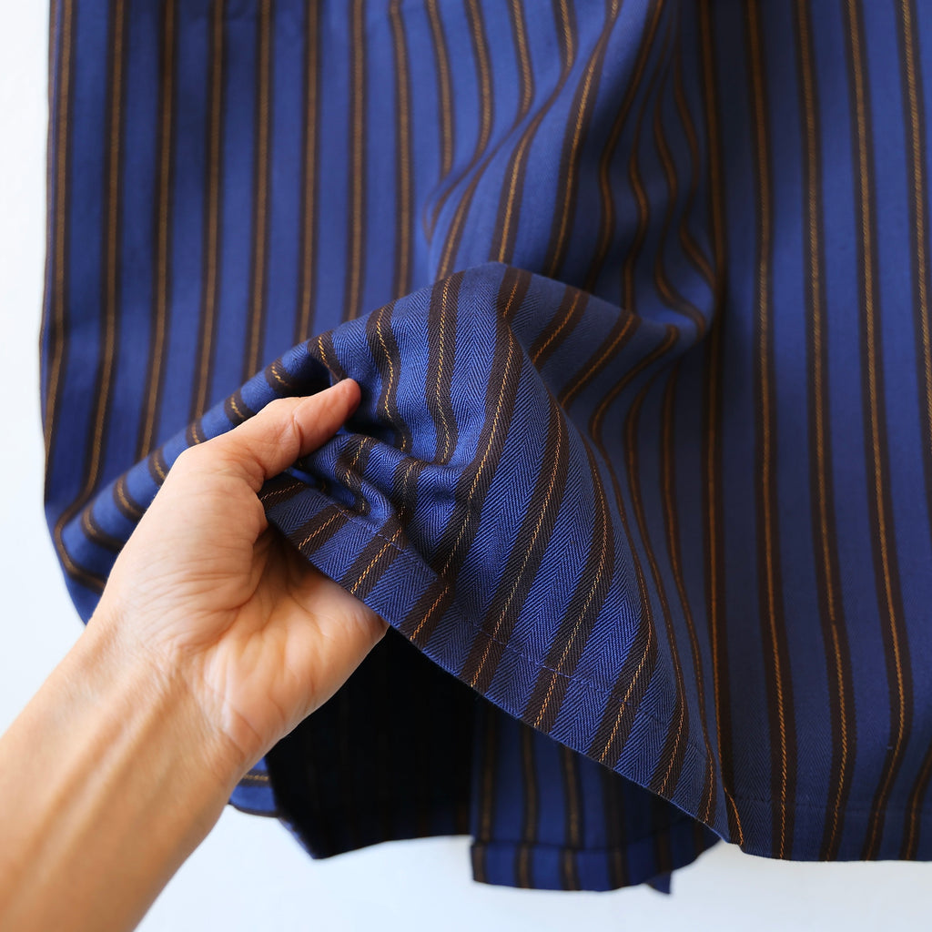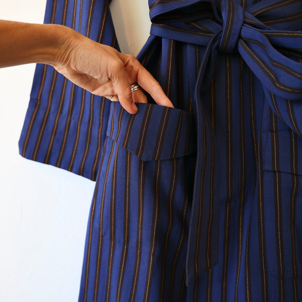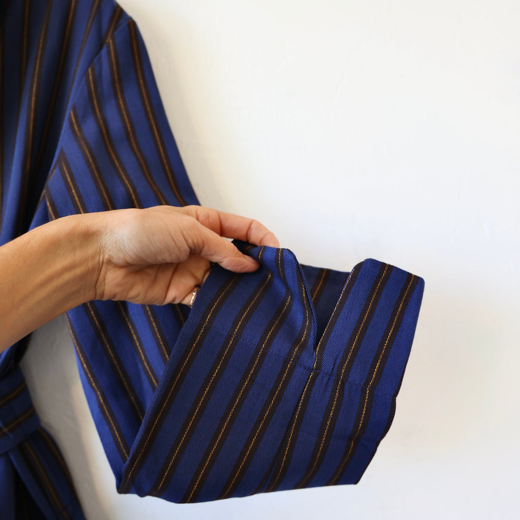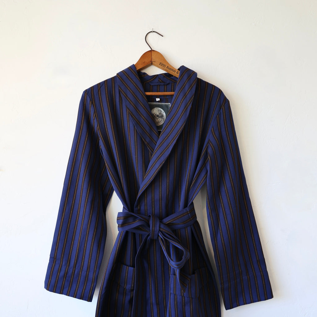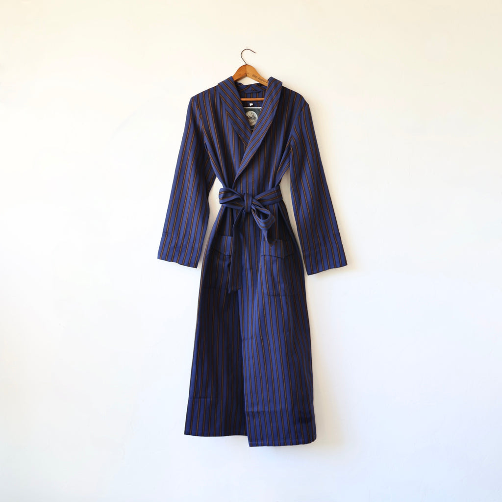 A beautiful dressing gown by P. Le Moult in a substantial weight herringbone cotton with a brushed flannel interior. The colors are a navy/mocha//metallic gold stripe. It has a beautiful fit with front pockets and a tie at the waist. It has a full length - hitting just above the ankle. This makes a beautiful gift!
