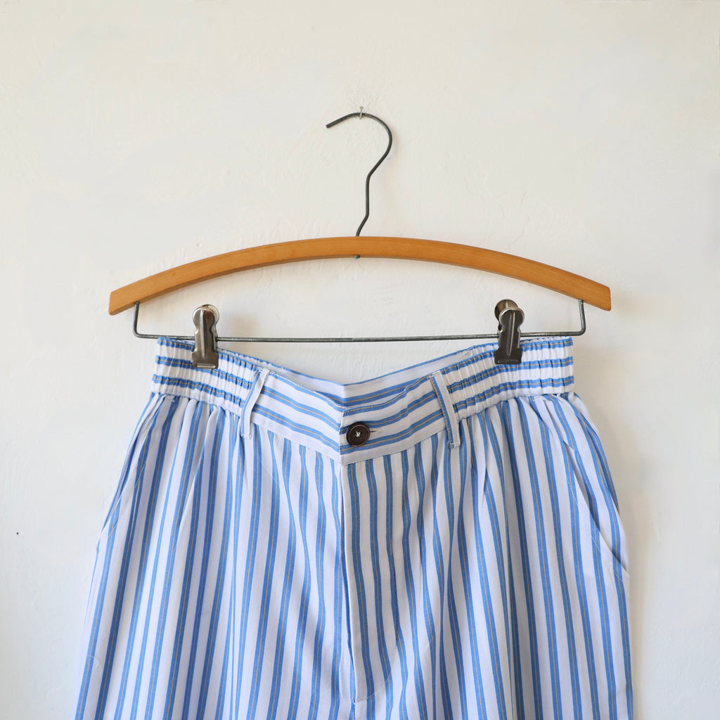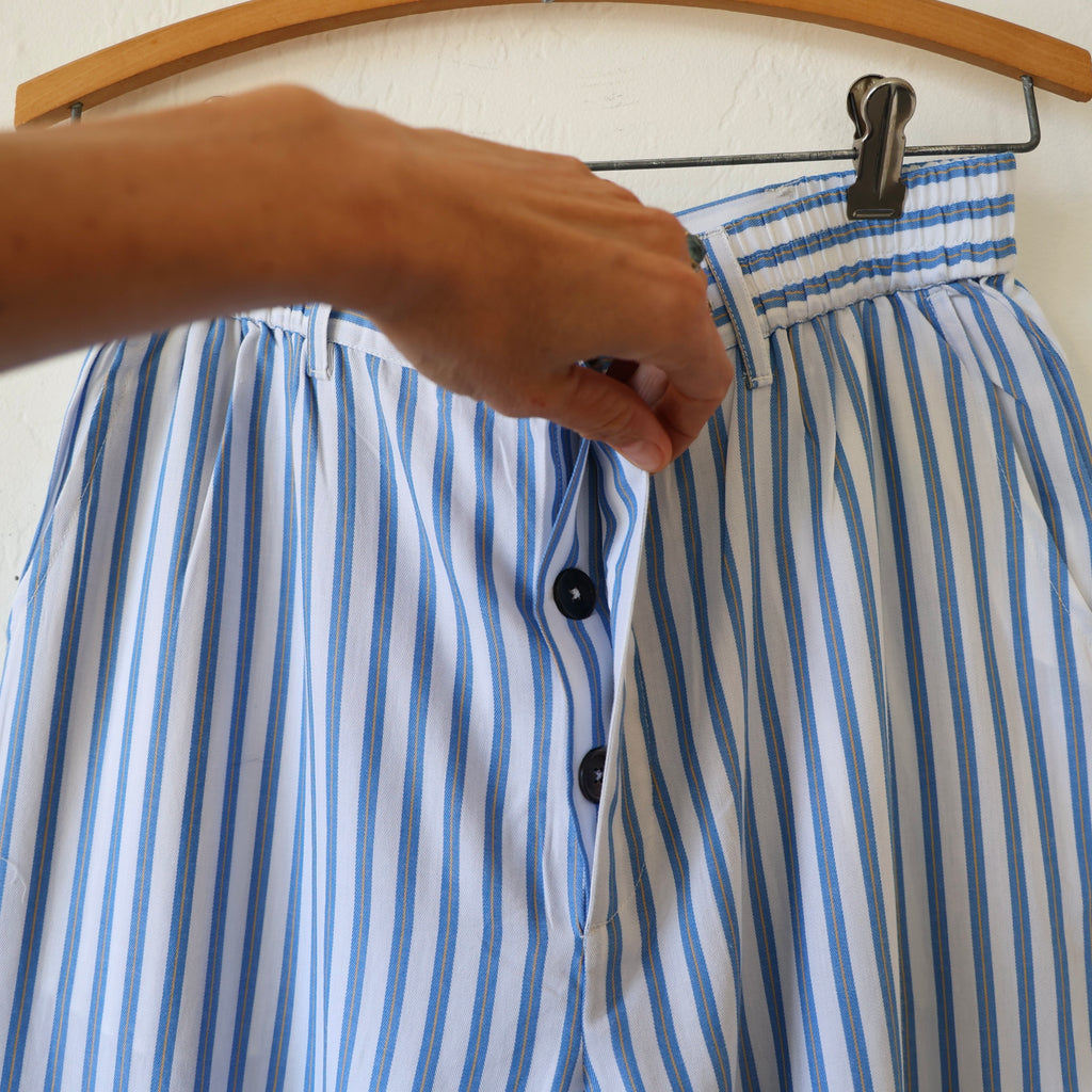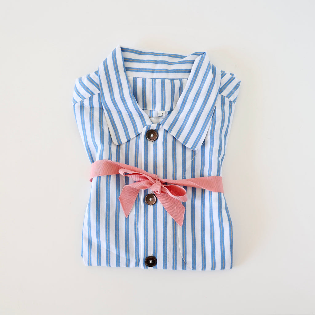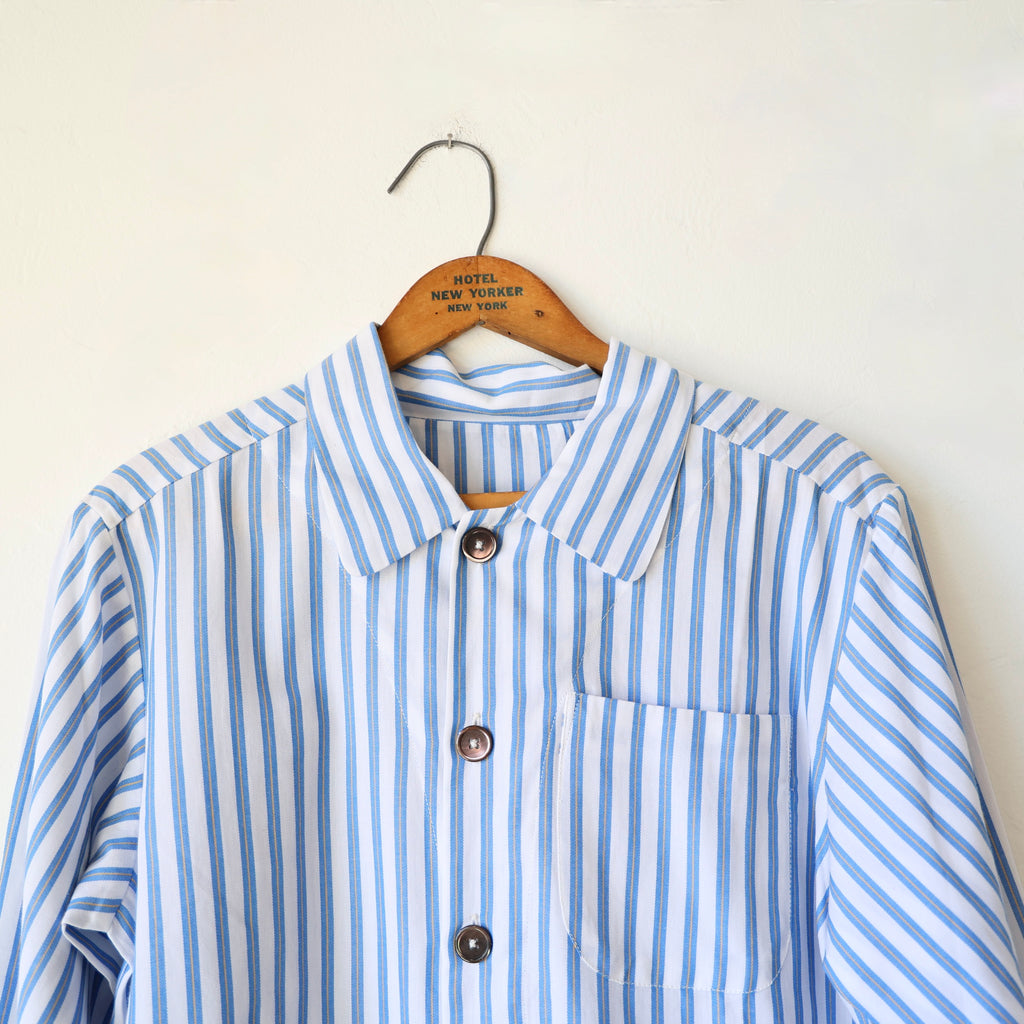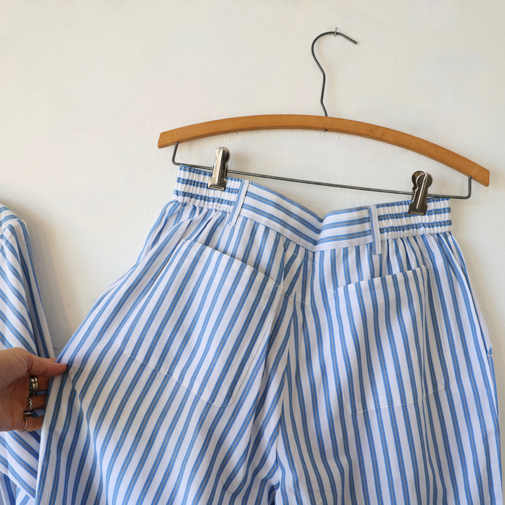 A beautiful pajama set by P. Le Moult in a lightweight herringbone cotton in white with blue stripes. The style is inspired by a pattern from the early 1900's. The pants have elastic on the sides with a flat waistband in the back and in the front with a button closure at the front. There are side pockets and back patch pockets on the pants. The top has chest pocket and a nice slightly rounded collar. These are a great weight to sleep in - the lightness keeps you from getting too hot!