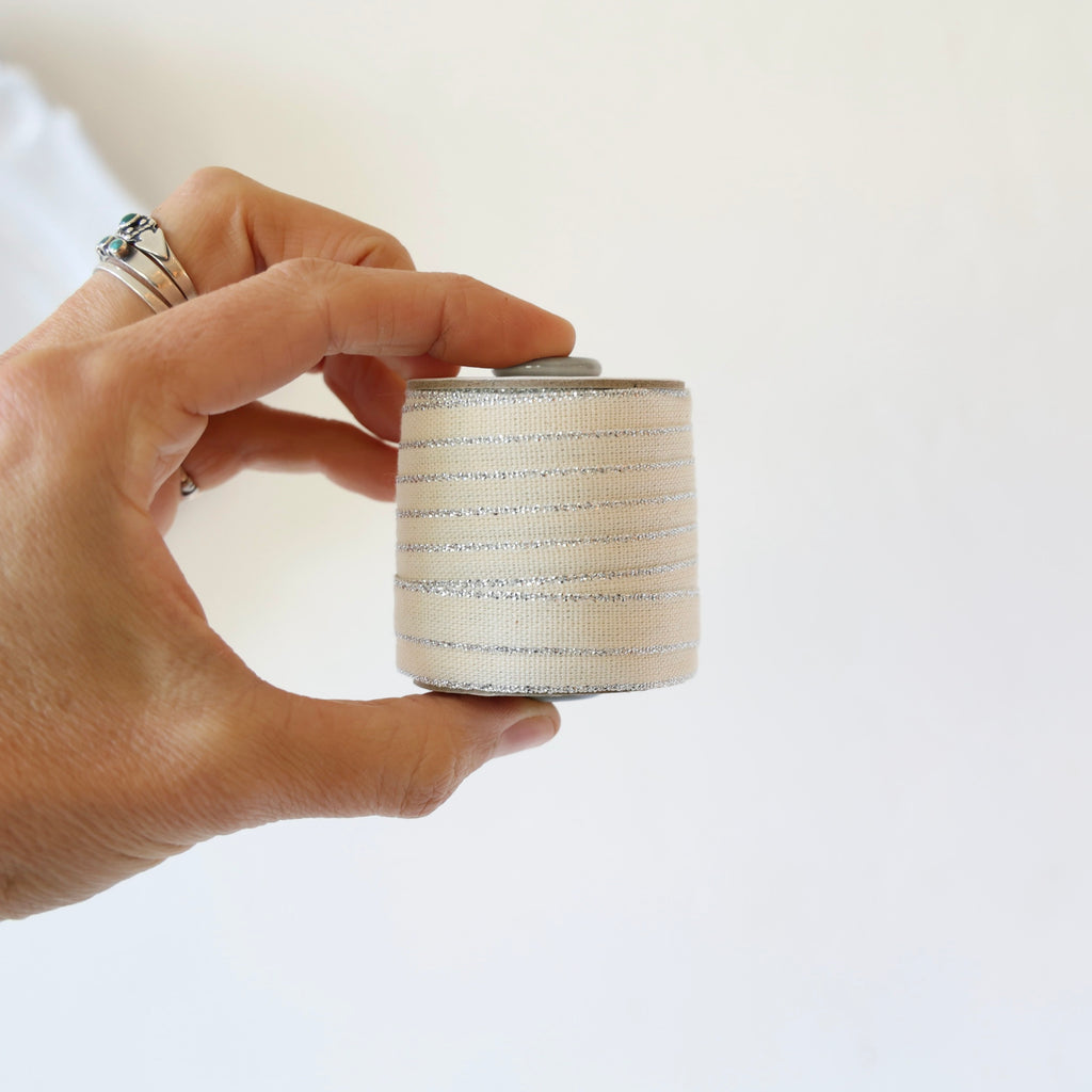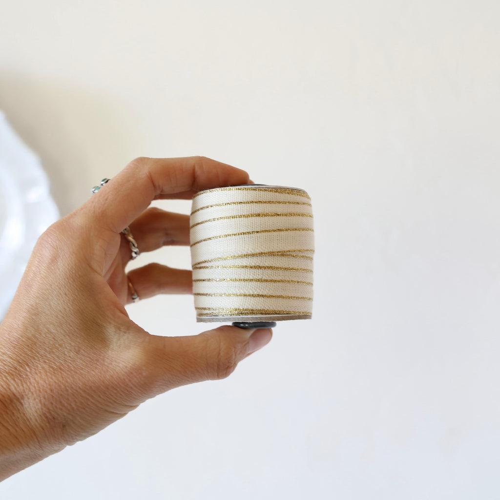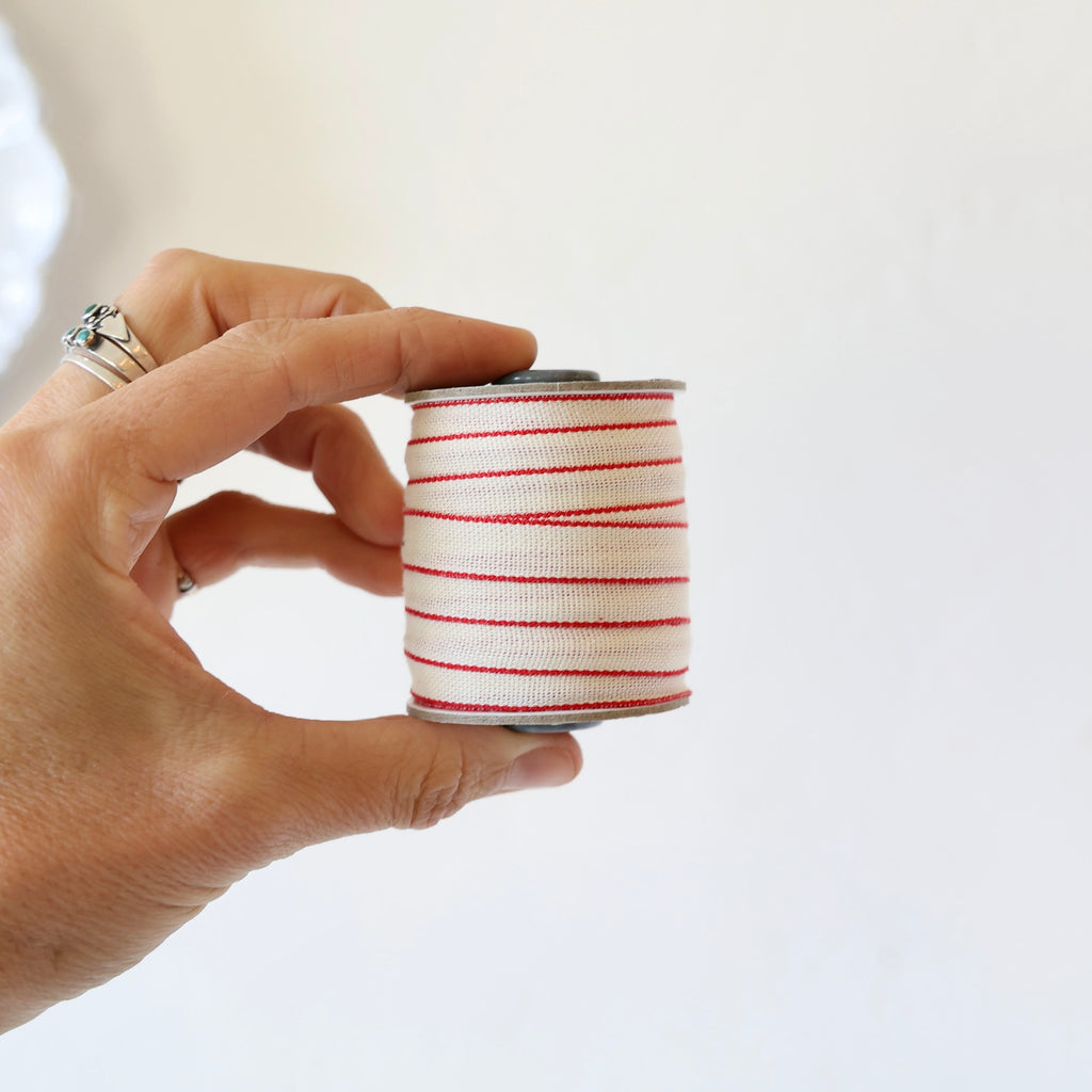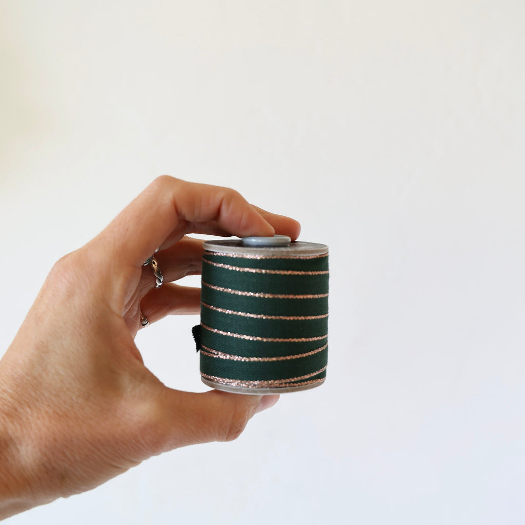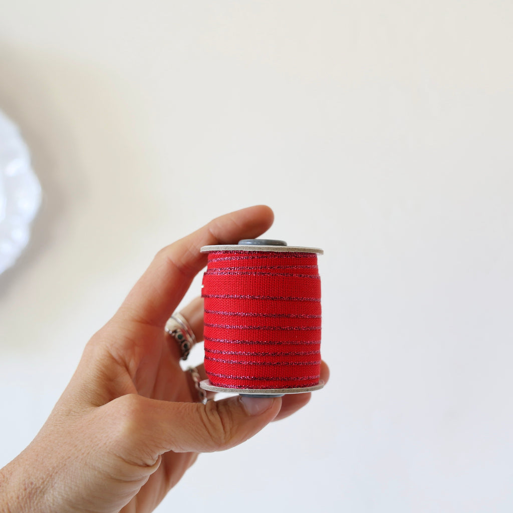 Beautiful cotton ribbon edged in contrasting colors. Many of them have a metallic contrasting edge - the color listing will indicate if the edging is metallic. Choose from an assortment of 5 different holiday colors.