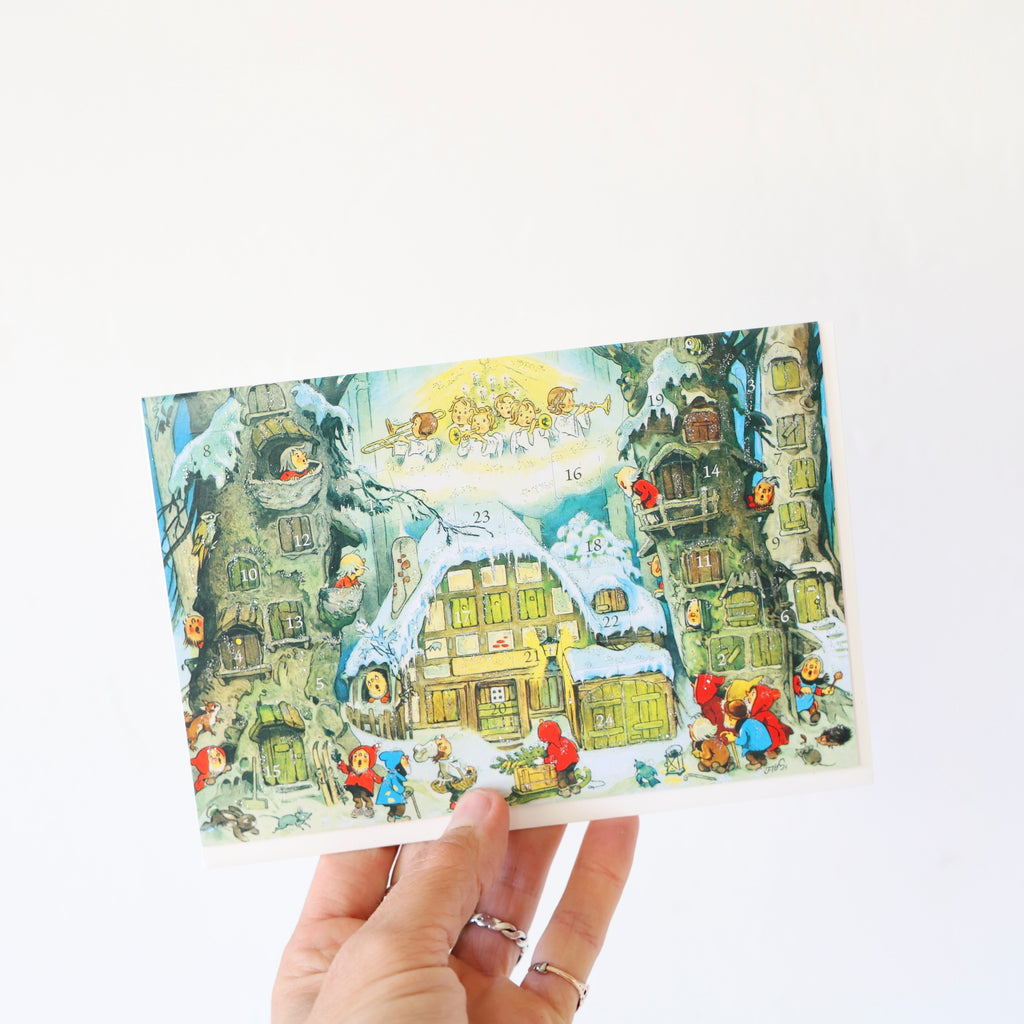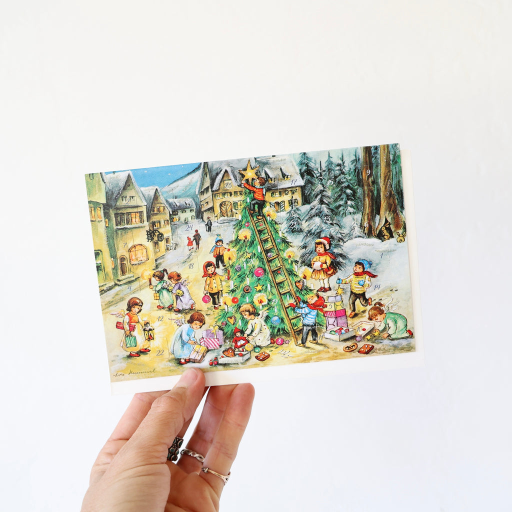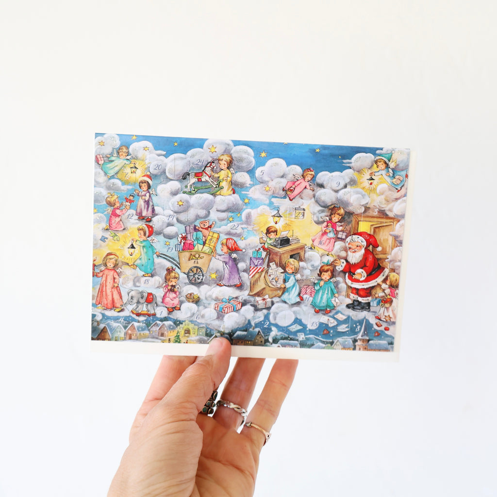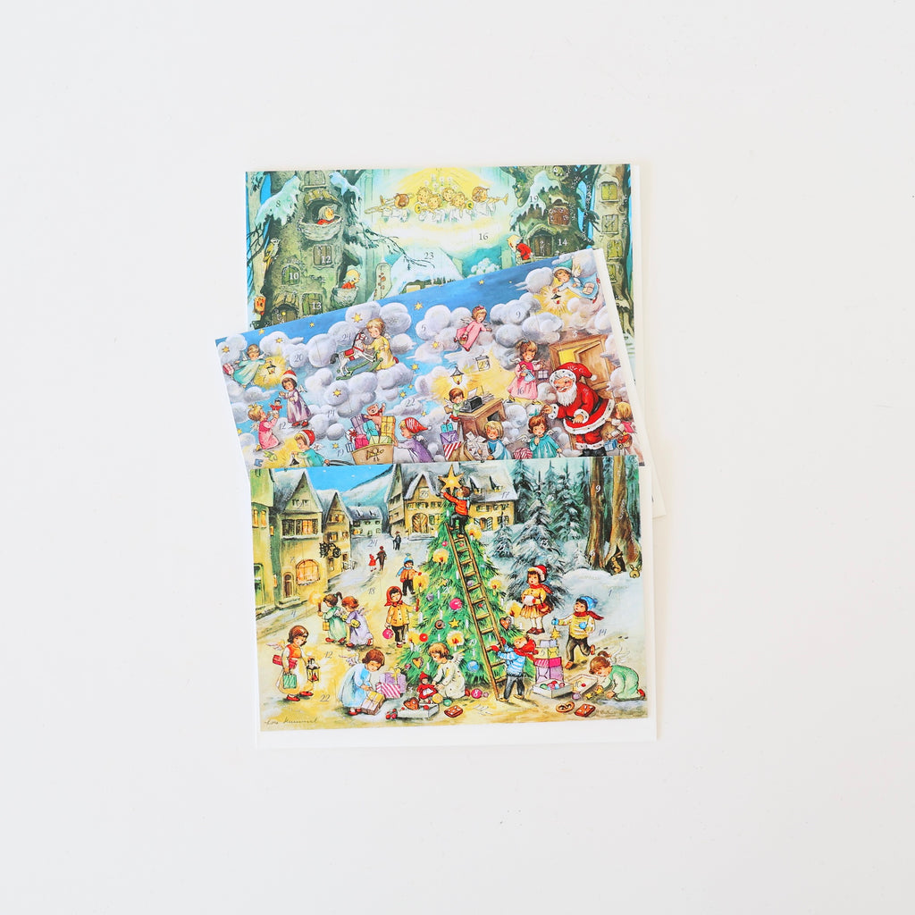 Glittered Advent Calendar Cards - 3 Options $ 6.00 Description Advent calendar cards for counting down the days until Christmas! Find the date and open the window for a beautiful hidden picture. Each card is hand glittered and comes with a recycled paper envelope. Choose from 3 different designs. design wintery house in the woods - $ 6.00 celestial scene with Santa and angels - $ 6.00 Christmas tree village scene - $ 6.00