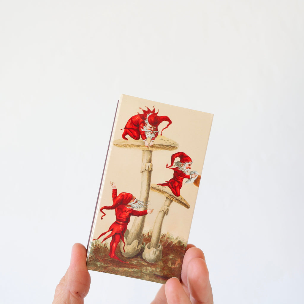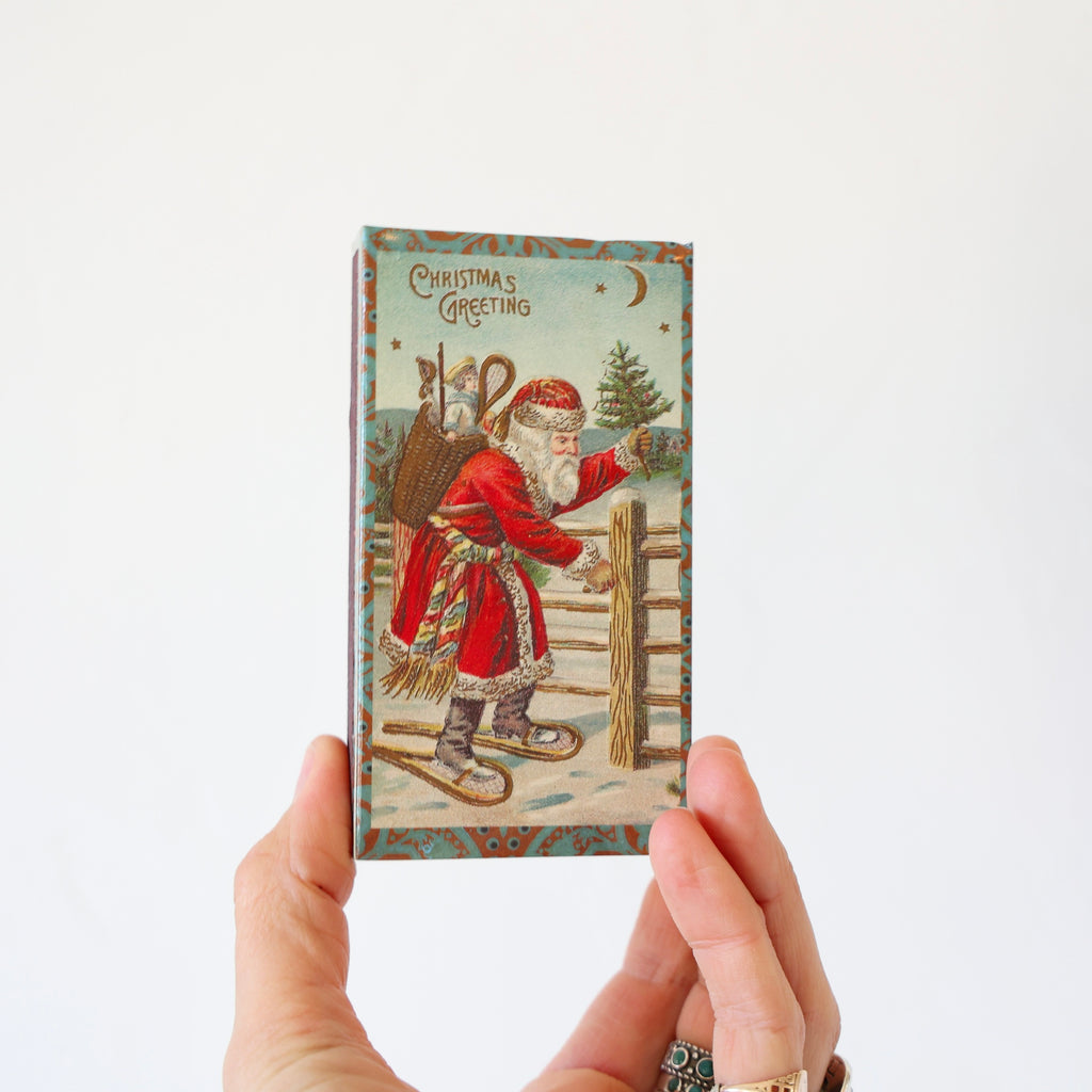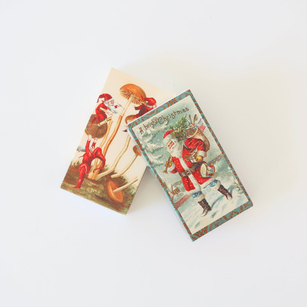 Holiday Matchboxes - 2 Options $ 4.50 Description Holiday matchboxes filled with long matches. These make wonderful gifts along with a candle or other holiday goodies. Choose from a scene of Santa gnomes and mushrooms, and a victorian Santa with his sac of gifts. 4.5" x 2.5" x .75" style gnomes and mushrooms - $ 4.50 victorian santa - $ 4.50