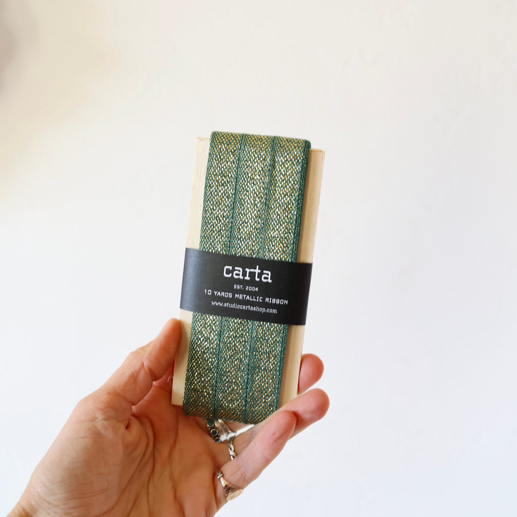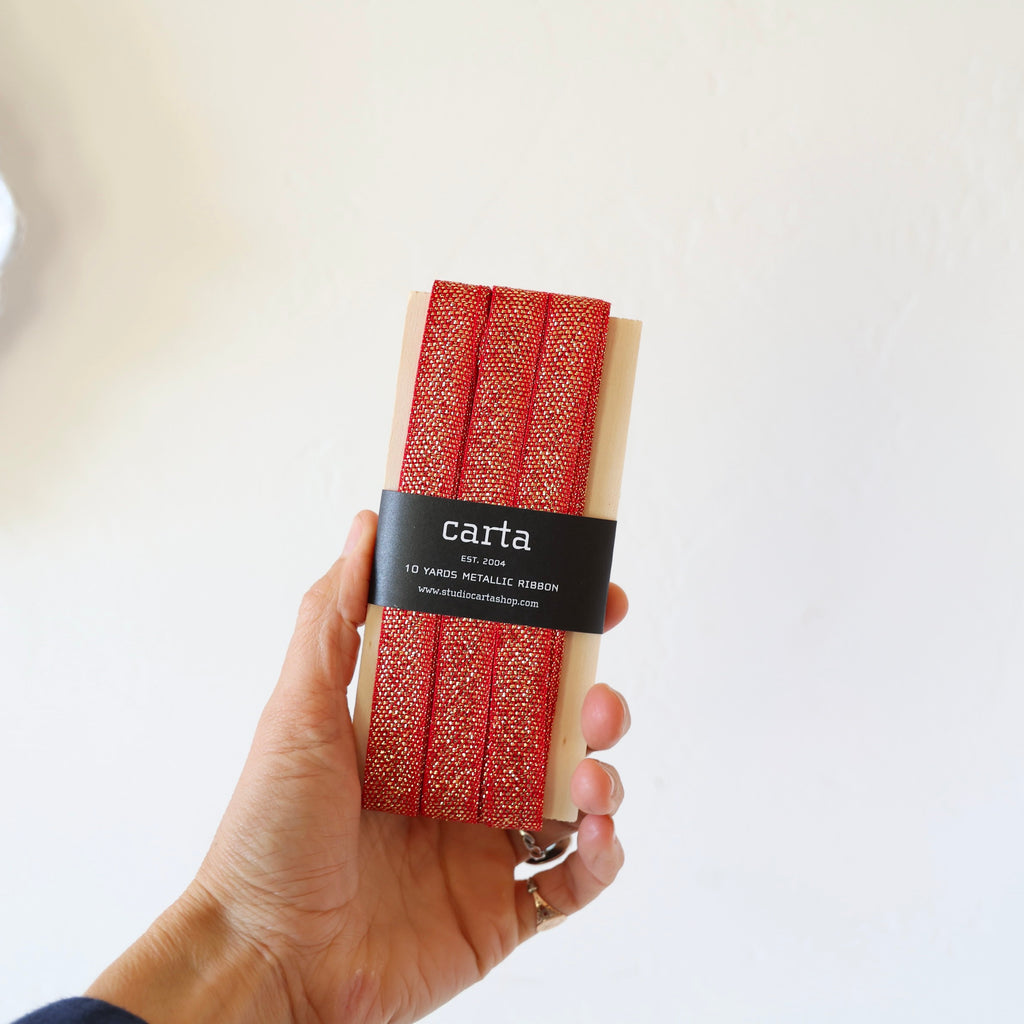 Loose Weave Metallic Cotton Ribbon - 2 Colors $ 25.00 Description Solid colored ribbon with a metallic finish in a loose weave cotton. This has a sturdy feel to it - it makes a nice bow. Choose from 2 colors. Width - 1/2", 10 yards Designed by Angela Liguori, made in Italy color red with metallic gold finish - $ 25.00 forest green with metalllic gold finish - $ 25.00