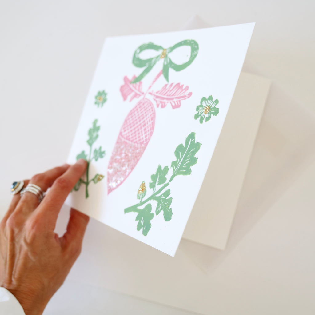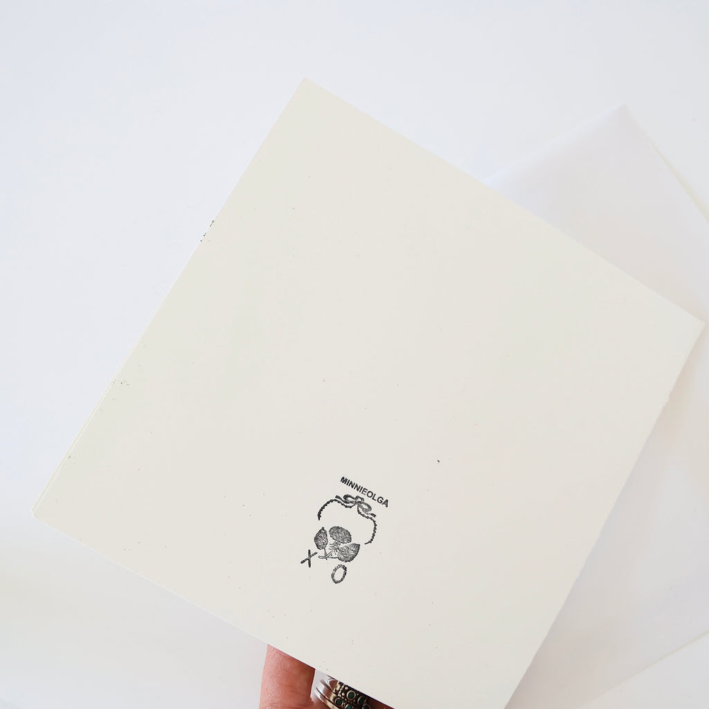 A fantastic handprinted card on artist grade paper. This has a large acorn with mica glitter and oak branch details around the edges. This comes with a vellum envelope.