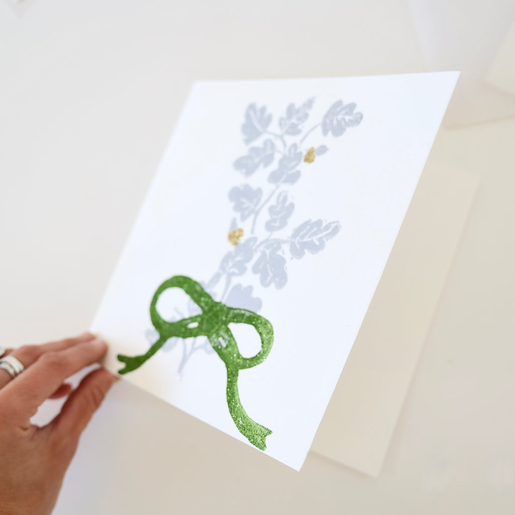 A fantastic handprinted card on artist grade paper. This beautiful oak branch has acorns adorned with glitter and a green glitter bow as well. This comes with a vellum envelope.
