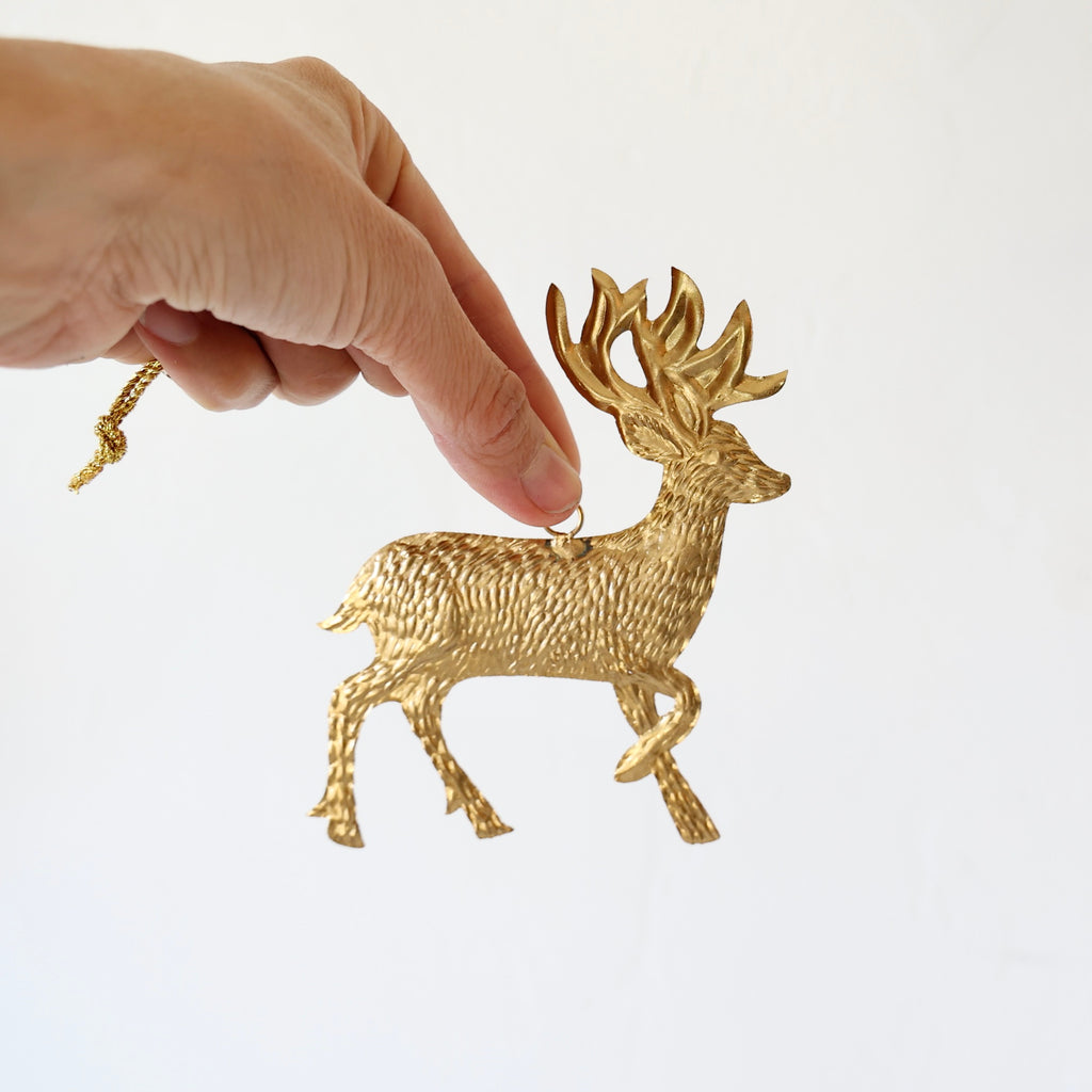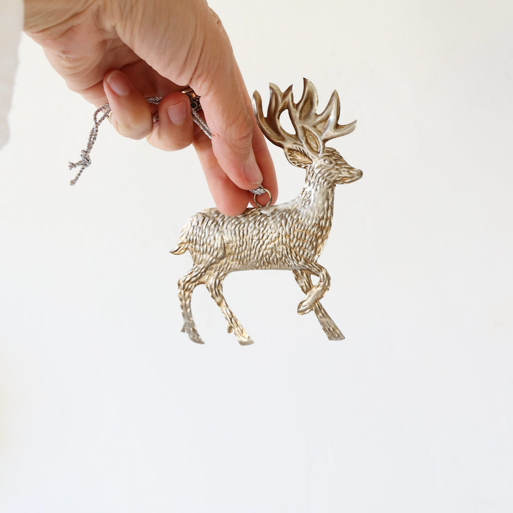 Punched Tin Reindeer - 2 Options $ 25.00 Description Wonderful reindeer ornaments or gift tie-ons made of punched tin. These are beautiful as decorations on the tree or mantle as well as on top of a gift. Each one comes with a matching cord. Choose from a silver or gold finish. 4" x 5" color gold finish - $ 25.00 silver finish - $ 25.00