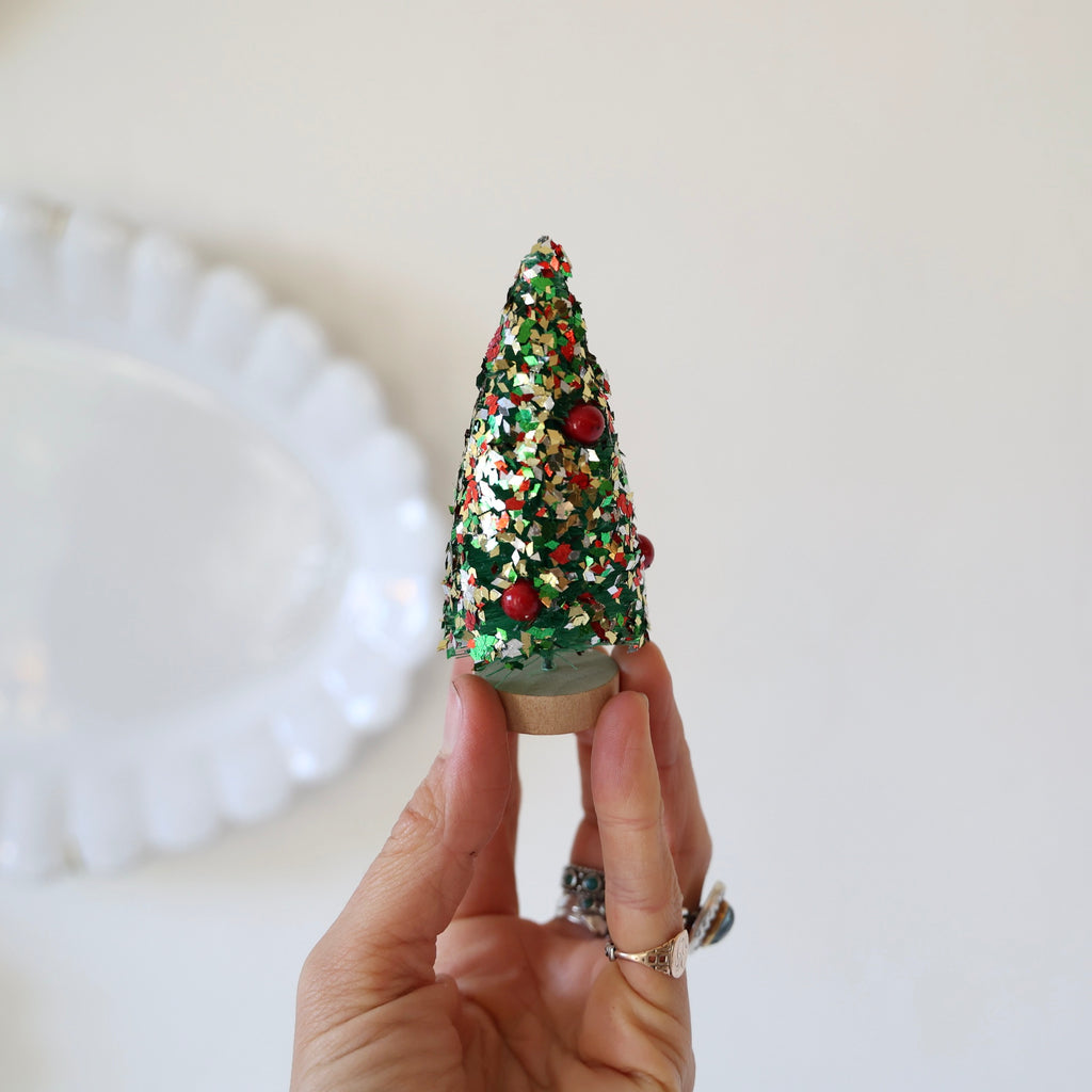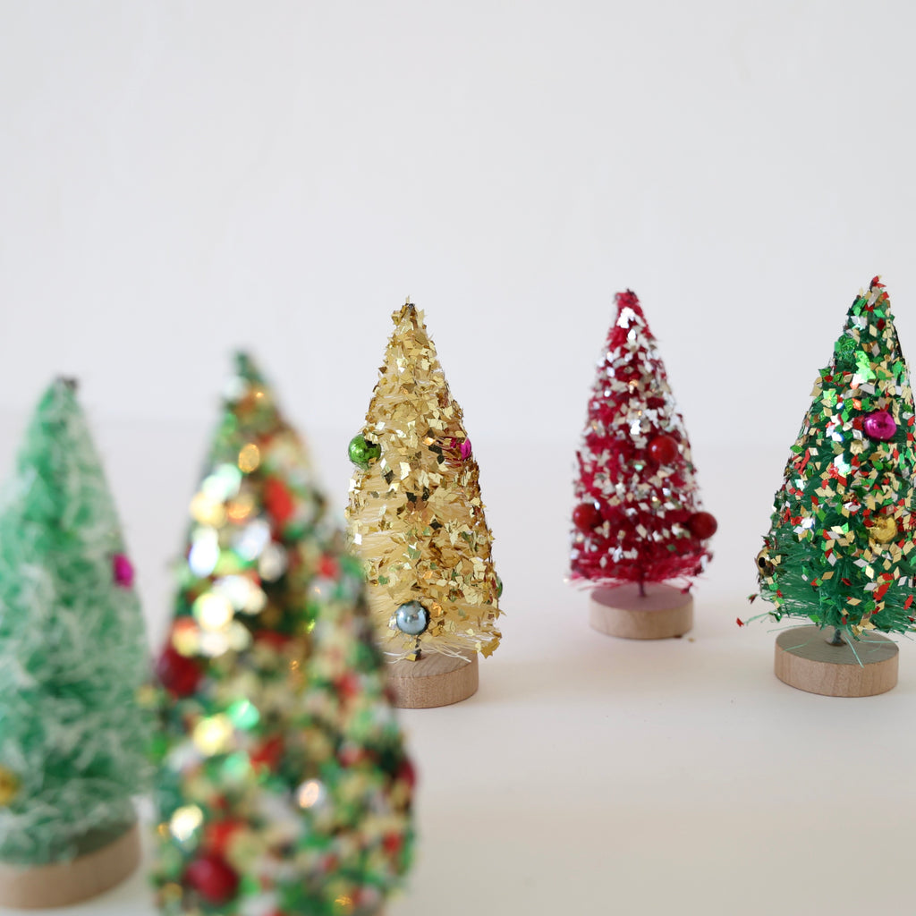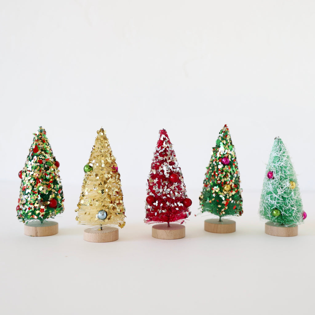 A wonderful set of 5 bottlebrush trees with chunky glitter and baubles. We love the chunkiness of the glitter with the ball decorations. The colors are so fun as well! These make a sweet holiday display as well as a wonderful gift. Each tree measures approximately 4" tall.