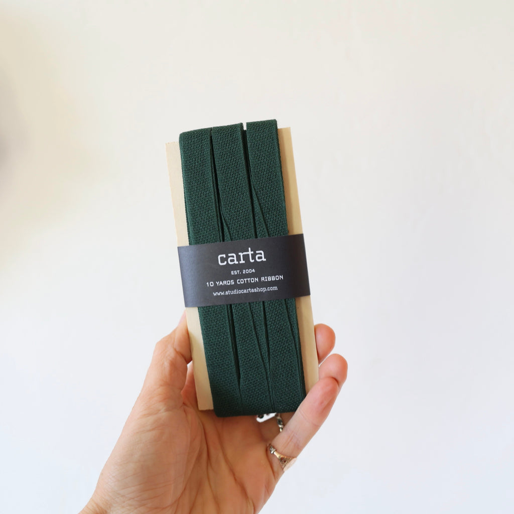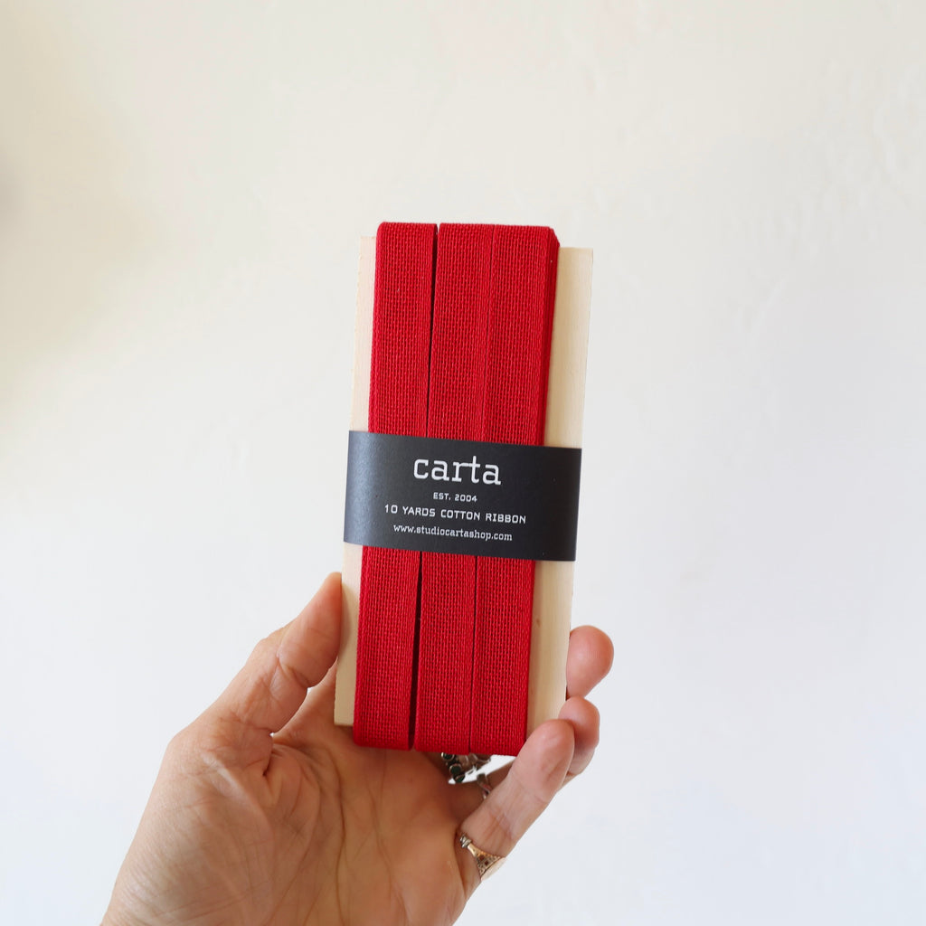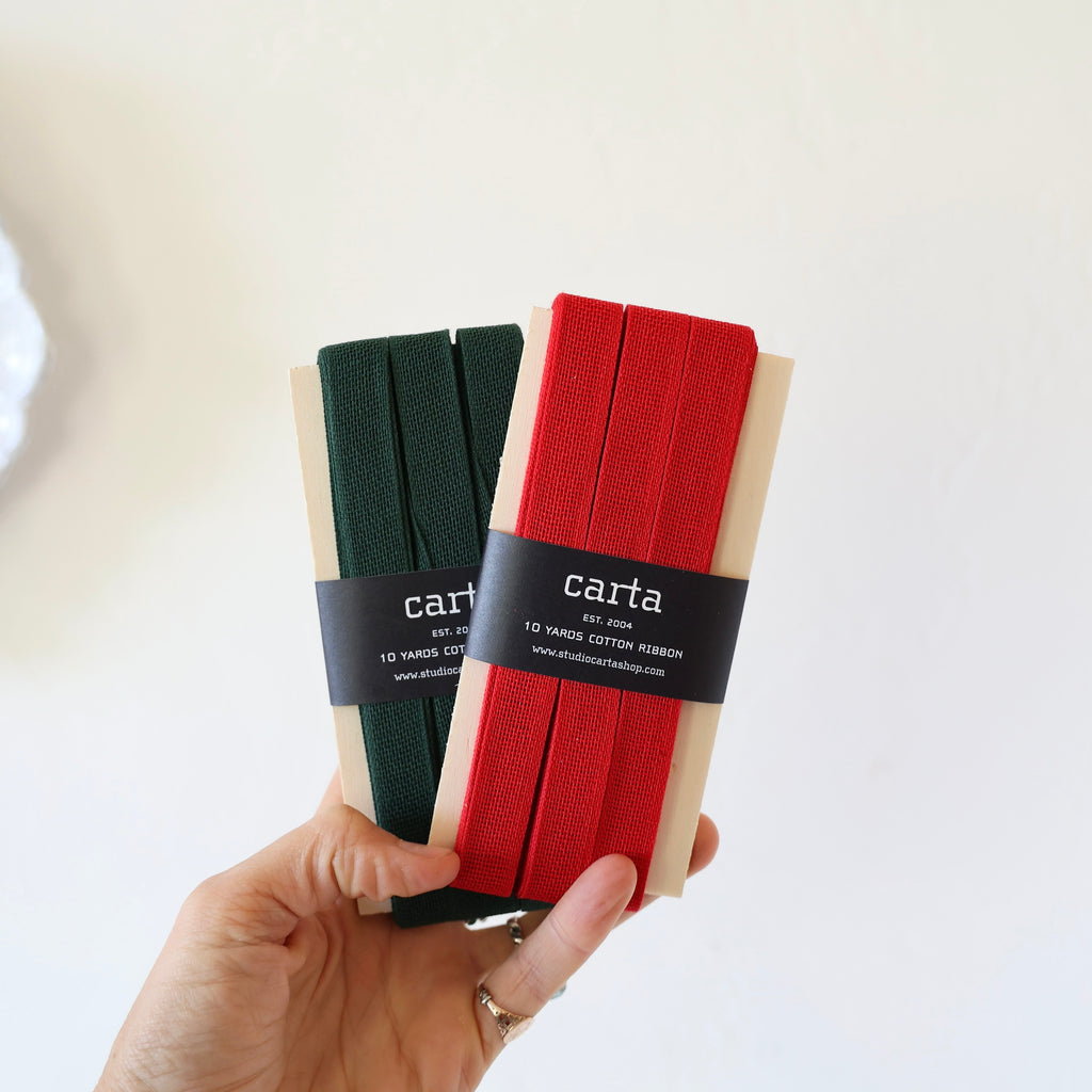 Loose Weave Cotton Ribbon - 2 Colors $ 22.00 Description Solid colored ribbon in a loose weave cotton. This has a sturdy feel to it - it makes a nice bow. Choose from 2 colors. Width - 1/2", 10 yards Designed by Angela Liguori, made in Italy color red - $ 22.00 forest green - $ 22.00