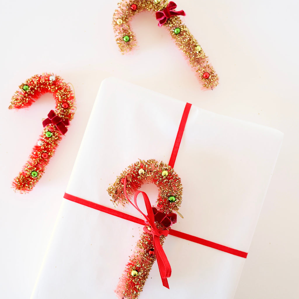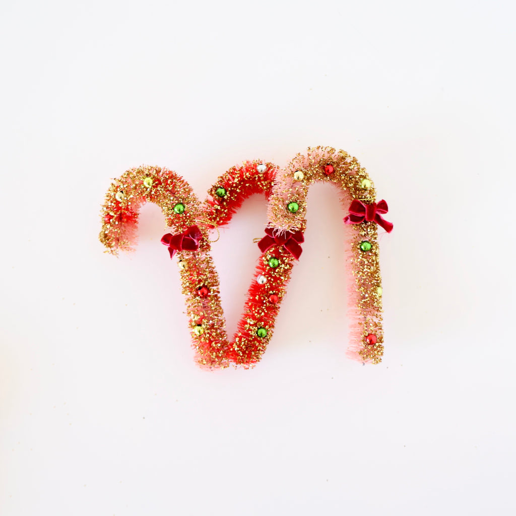 These are so fantastic!! These are medium sized brush candy canes complete with baubles, glitter and a velvet bow. The medium size also has a tie hanger to hang it from the tree if desired. We love these tied on a gift or used as decoration!  They measure 6" tall.
