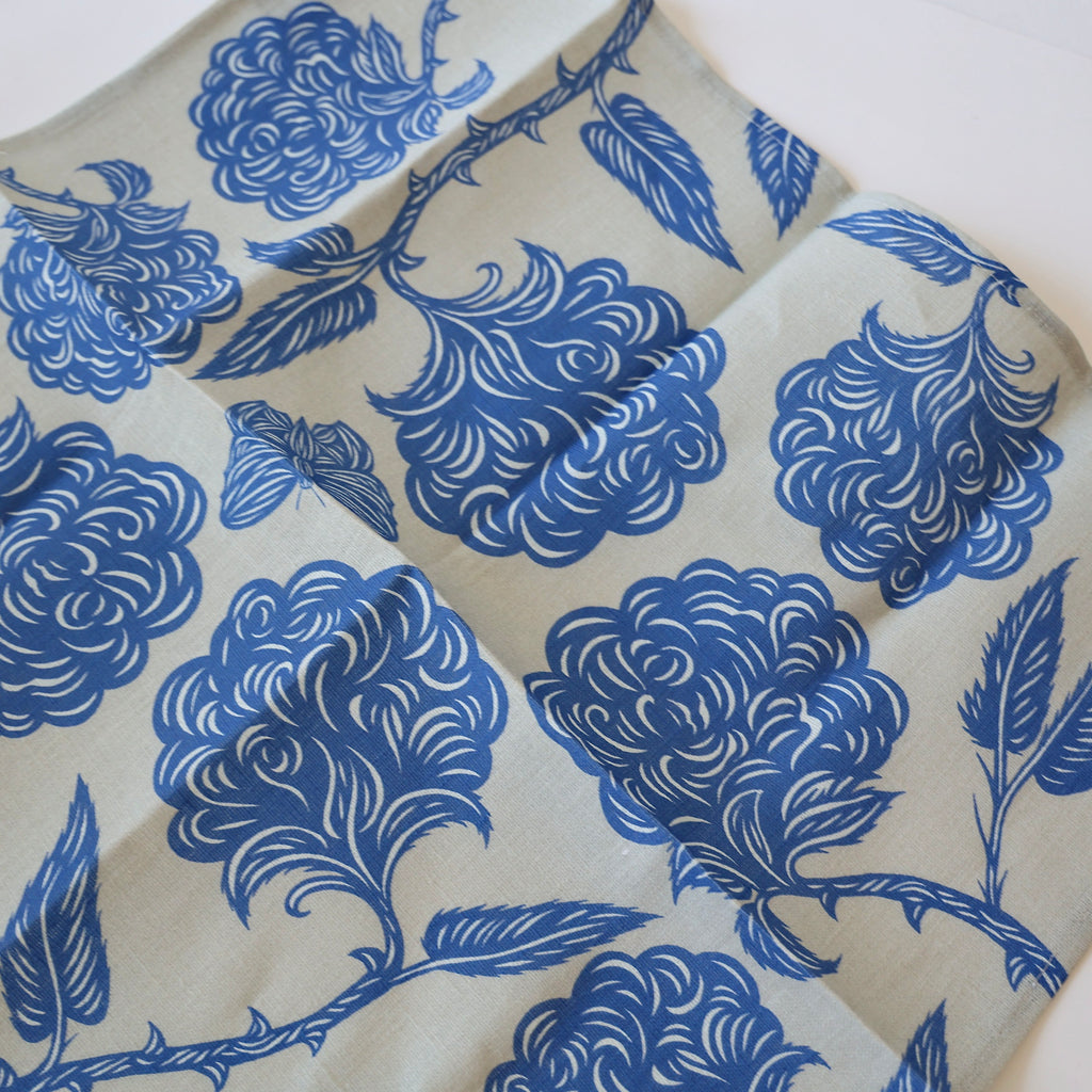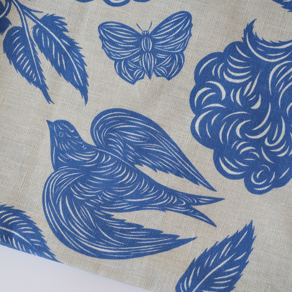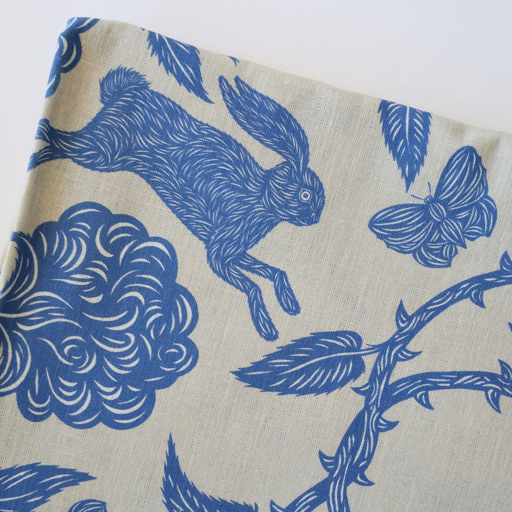 Beautiful tablecloths and napkin sets in a fun hawthorn garden print with rabbits, birds, flora and fauna! These are made of a substantial weight linen and are great for special occasions or every day use. The colors are a soft cornflower blue with white and natural. The tablecloths are made in two useful sizes - 56" by 79" and 56" by 118". The napkins come in a set of 4, each napkin is 18" by 18".