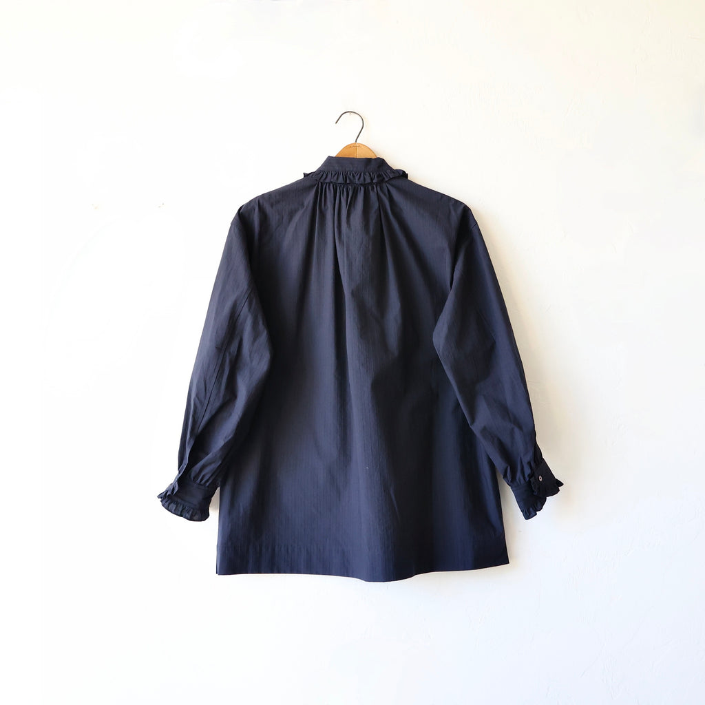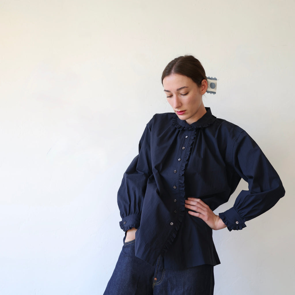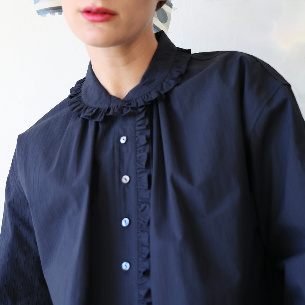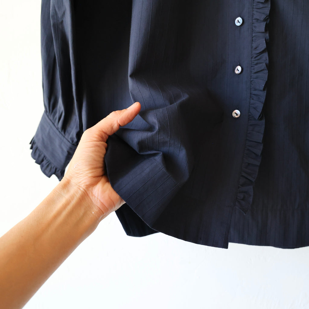 A beautiful blouse made in a crisp midnight cotton/silk with raised stripes. We love the solid color with the whisper of stripes in the texture of the fabric. The cotton/silk has a sturdy structure and a medium weight. The flat felt seams give it durability and longevity - a beautifully made shirt. It has a lovely fold over collar lined with a tiny ruffle that extends down the button placket. It also has the ruffle along the cuffs. It has a nice long length. This looks beautiful layered with the snow goose pullover or on its own! A stunning piece that will stand the test of time!