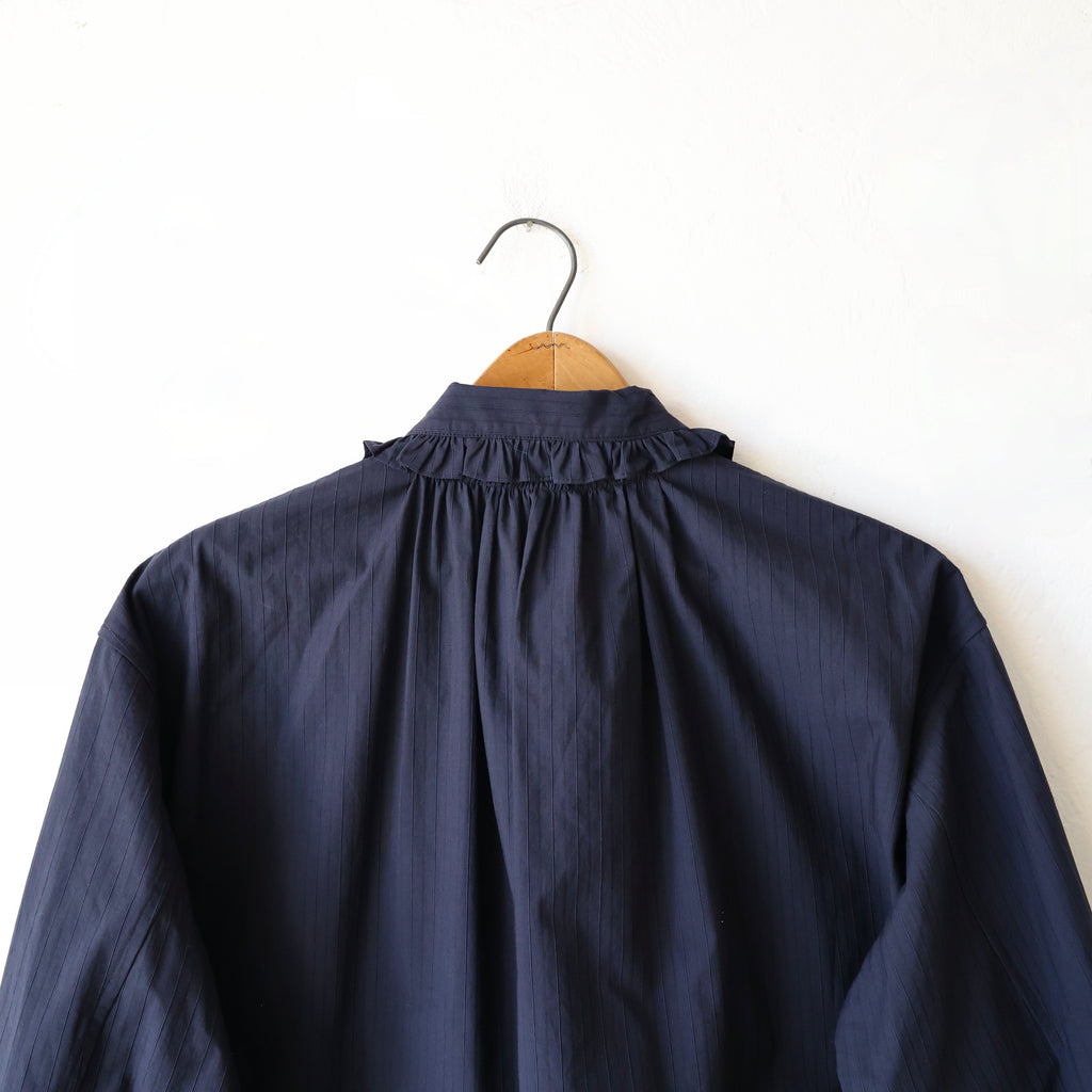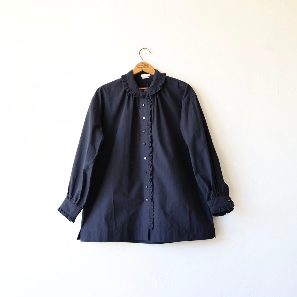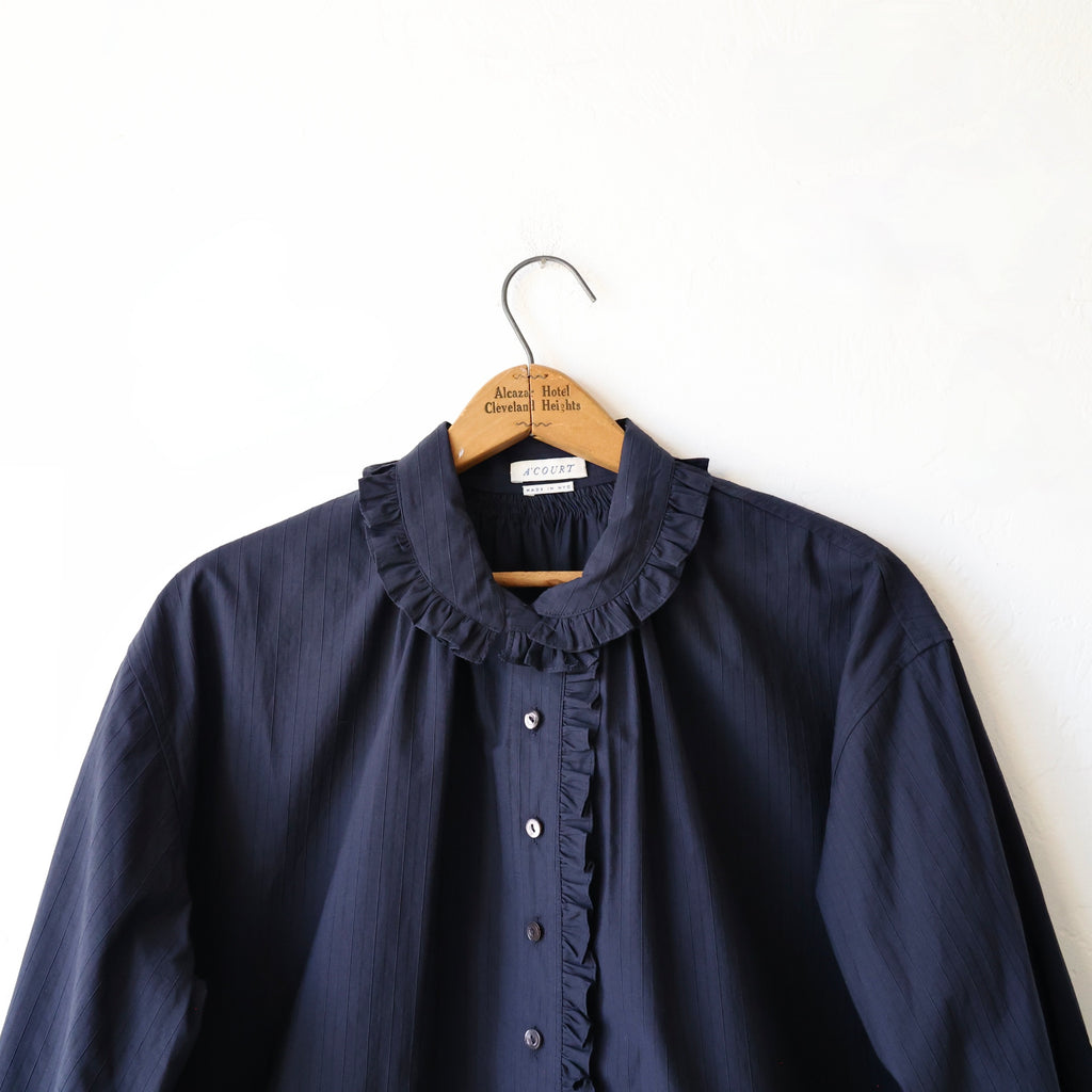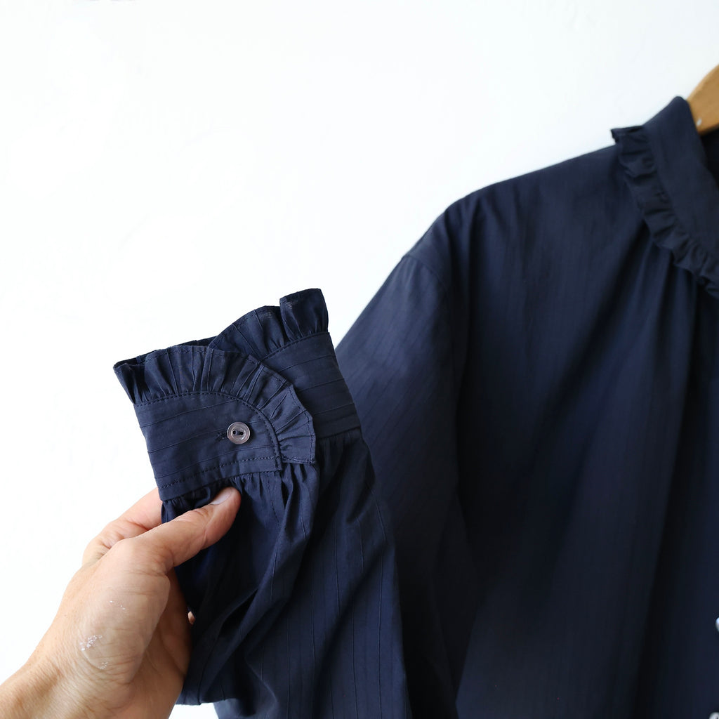 A beautiful blouse made in a crisp midnight cotton/silk with raised stripes. We love the solid color with the whisper of stripes in the texture of the fabric. The cotton/silk has a sturdy structure and a medium weight. The flat felt seams give it durability and longevity - a beautifully made shirt. It has a lovely fold over collar lined with a tiny ruffle that extends down the button placket. It also has the ruffle along the cuffs. It has a nice long length. This looks beautiful layered with the snow goose pullover or on its own! A stunning piece that will stand the test of time!
