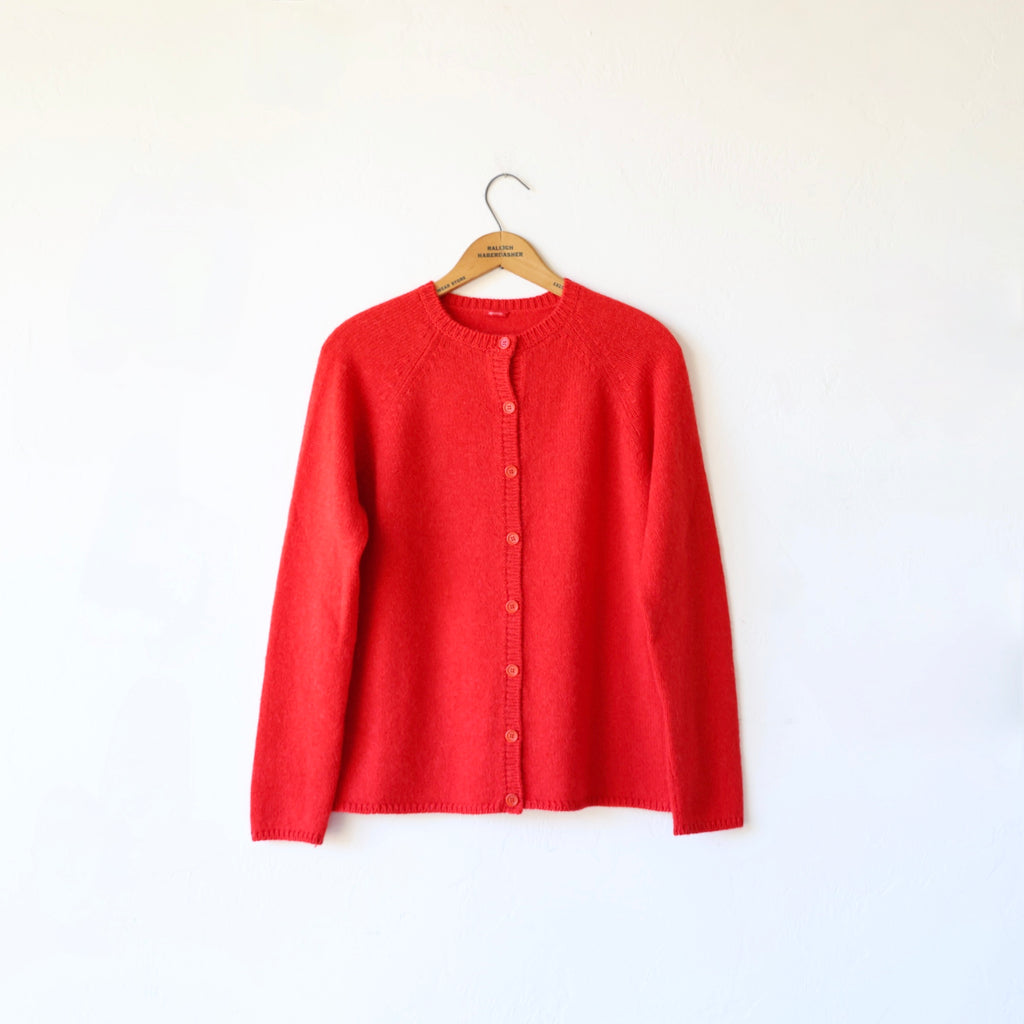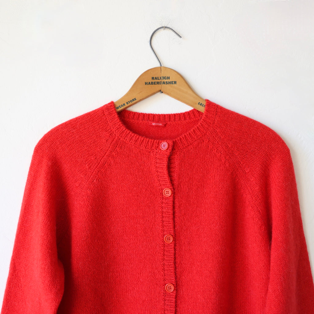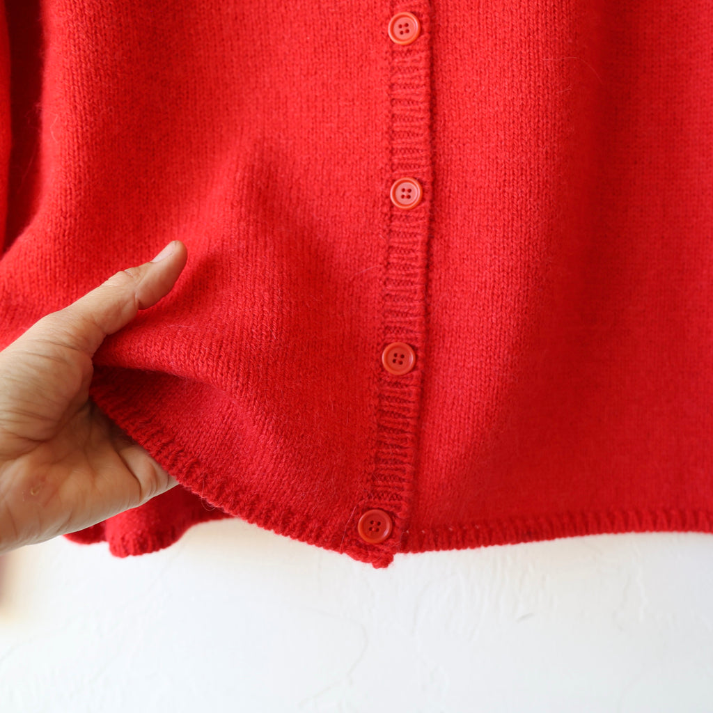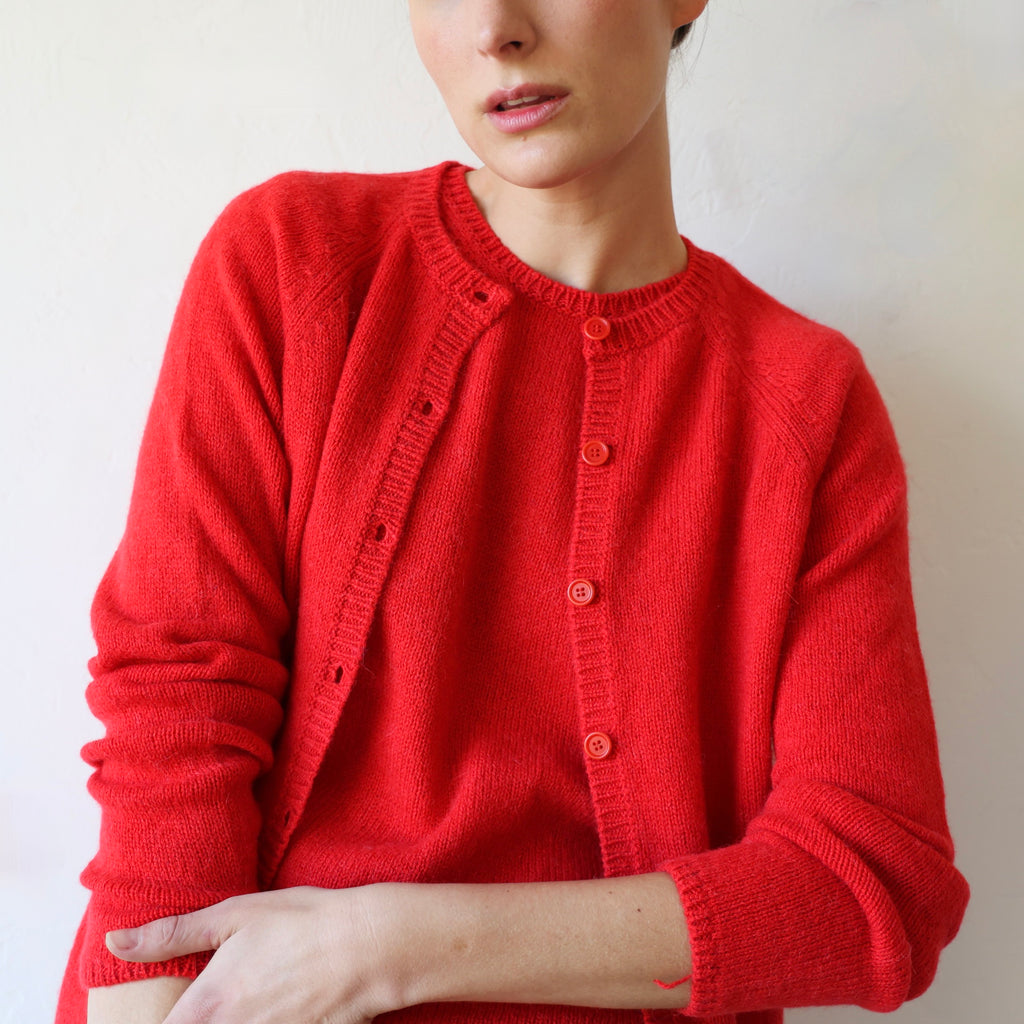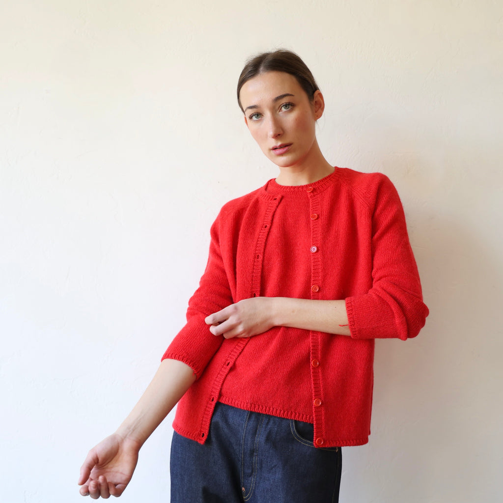 We love this wonderful cardigan in a beautiful soft red. This is knit with a medium gauge yarn - the cashmere & alpaca is super soft and lofty. It has matching red buttons down the front and lovely small ribbing at the neck, cuffs and hem. A delightful piece, and so fun in this color! We love it with its matching vest worn underneath. We also show it with the Apuntob gingham stole and triangle scarf in red.