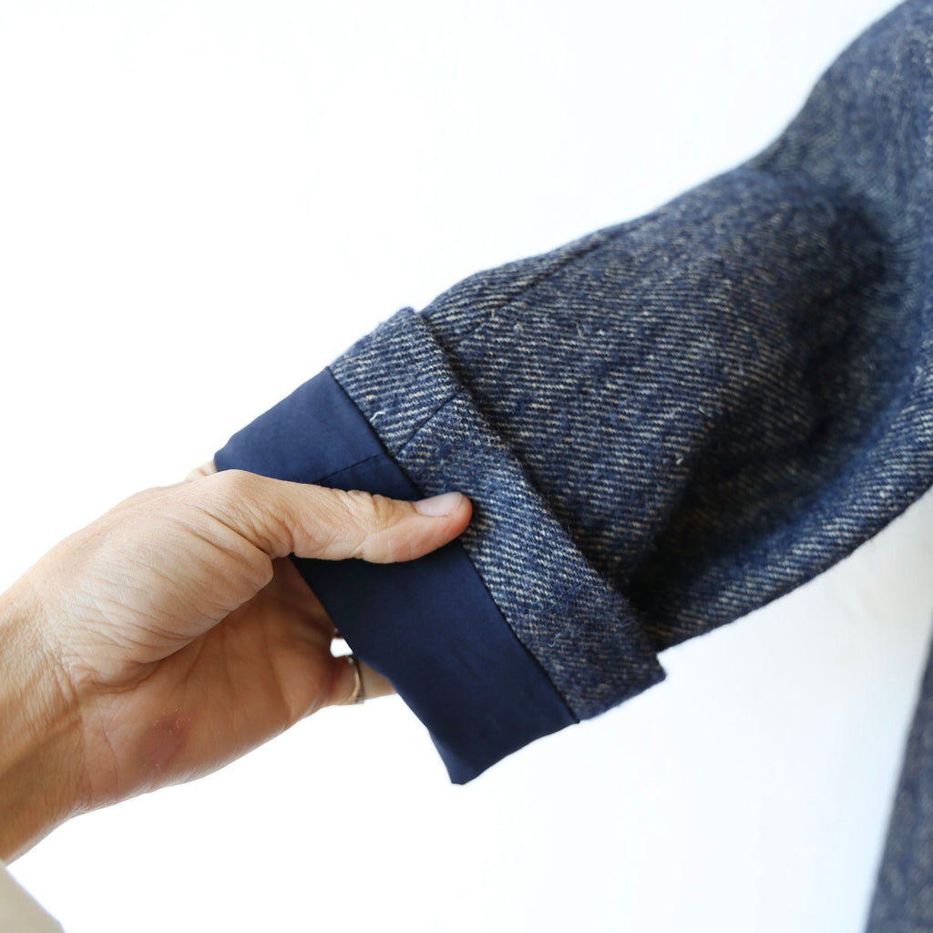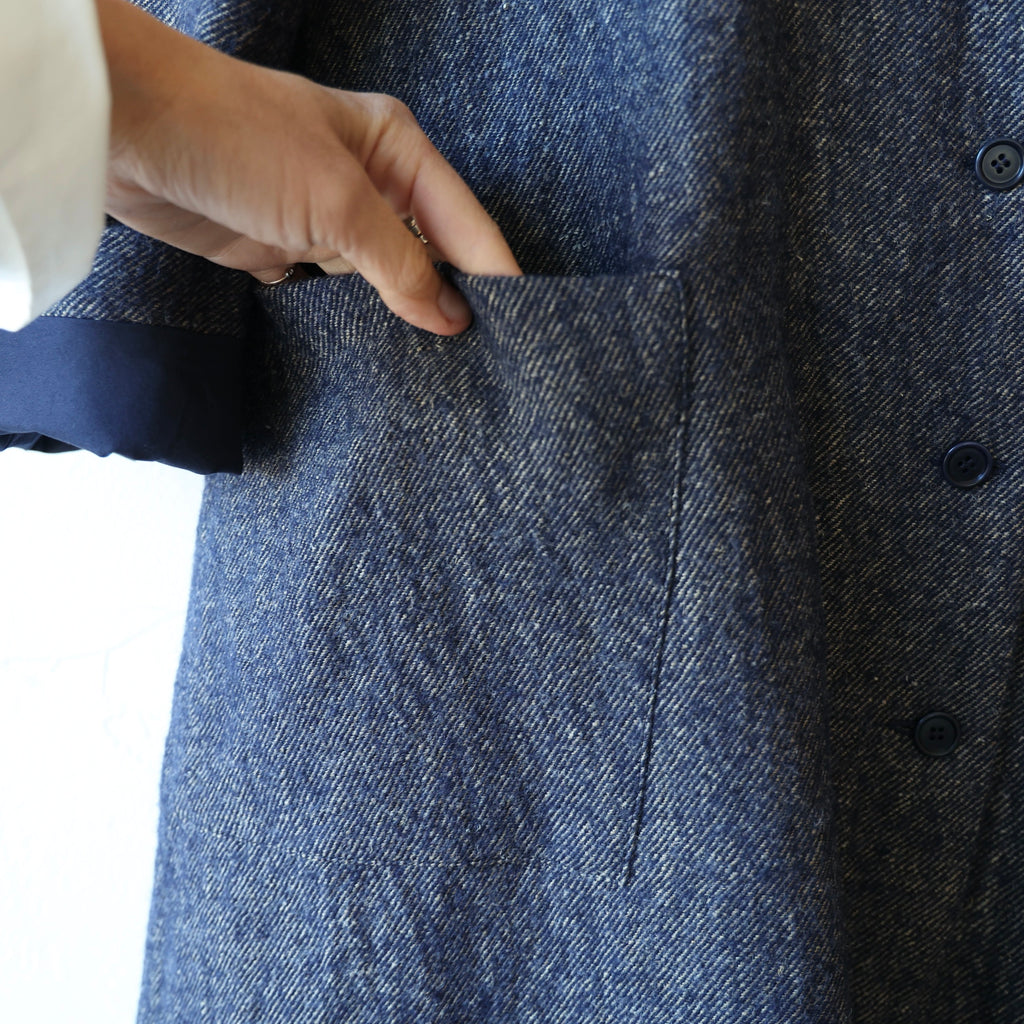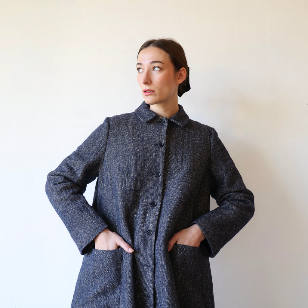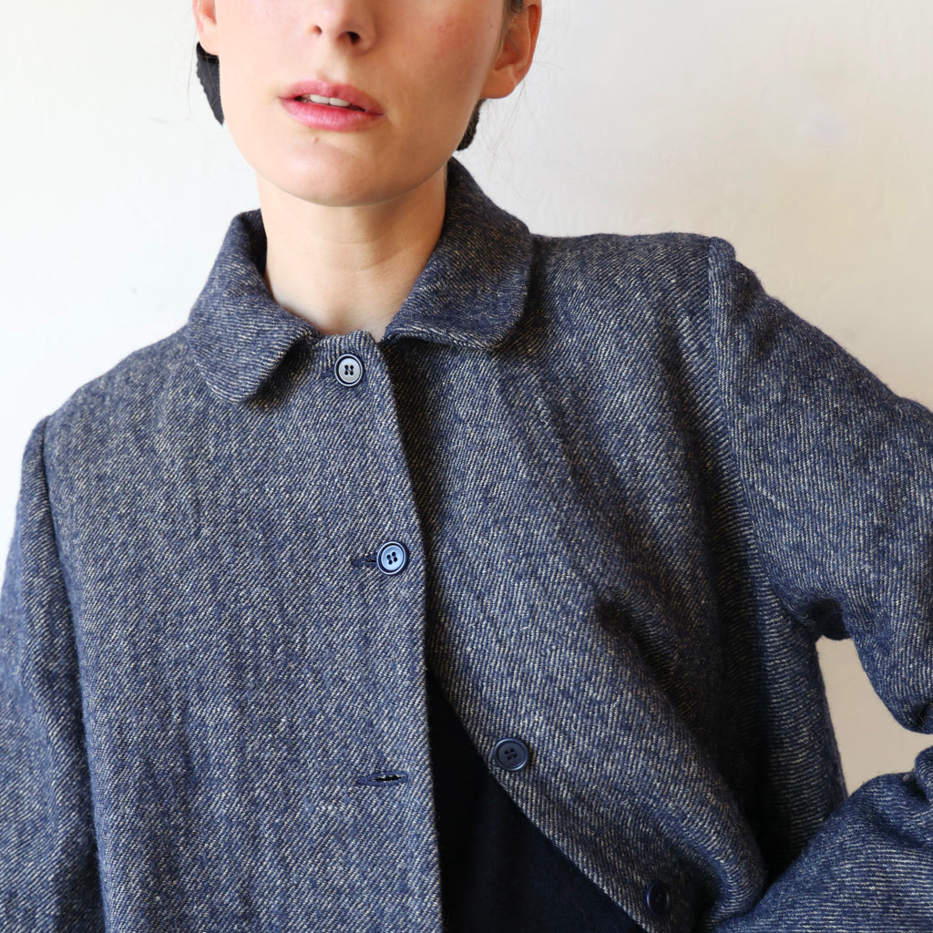 A gorgeous coat, made of a blue/cream variegated hemp & wool blend. The combination of the cream and navy gives it a really wonderful organic feel. It has a beautiful fit and a sophisticated feel while also being an easy, every day piece! This has a slightly rounded collar, buttons down the front, and a center back seam with a vent. There are two front patch pockets... so handy for your keys, phone, you name it! It's lined with a solid navy light cotton. It's also fun to wear this with the sleeves folded up to show the lining a bit. This is quite the beauty, and this hemp/wool combination feels so special and unique.
