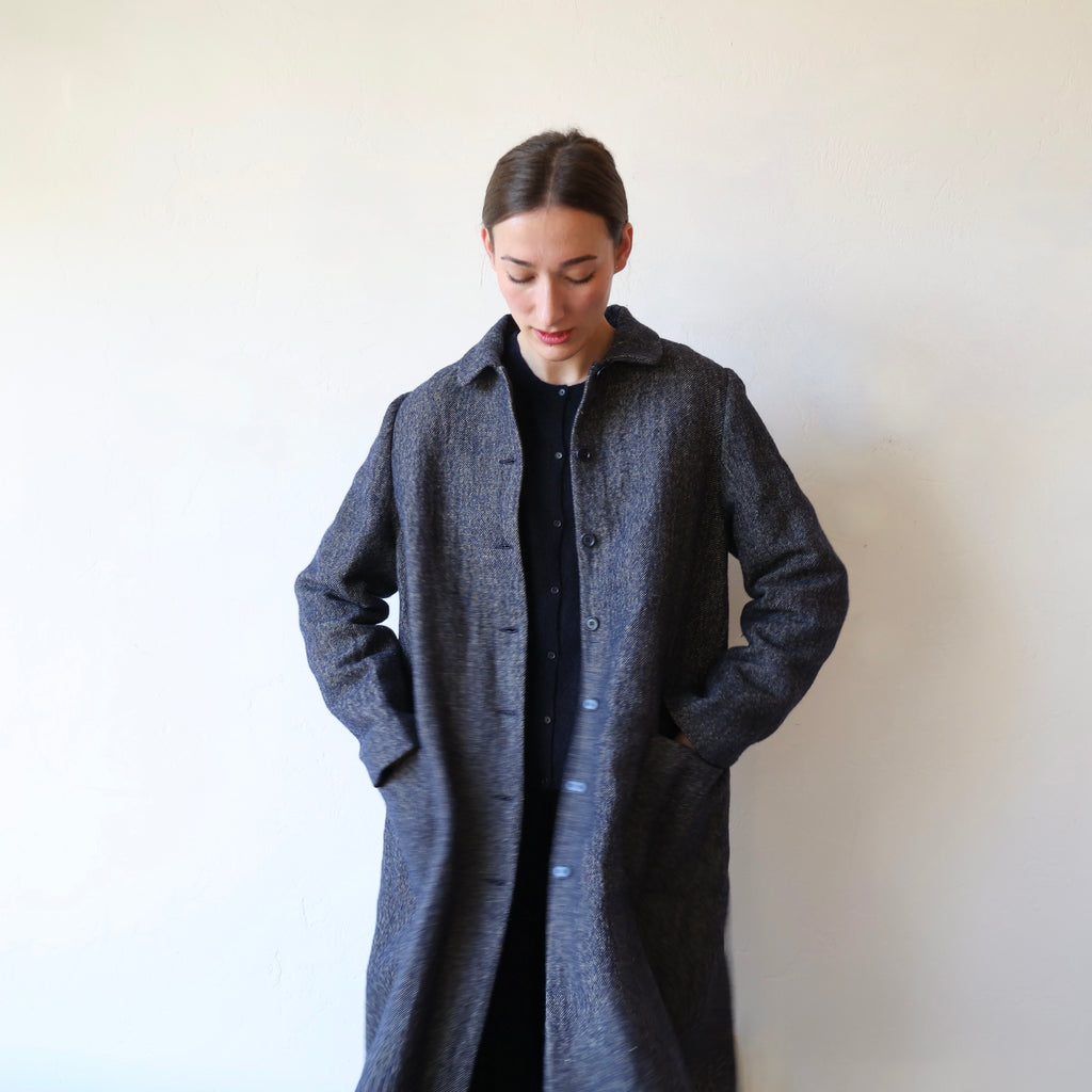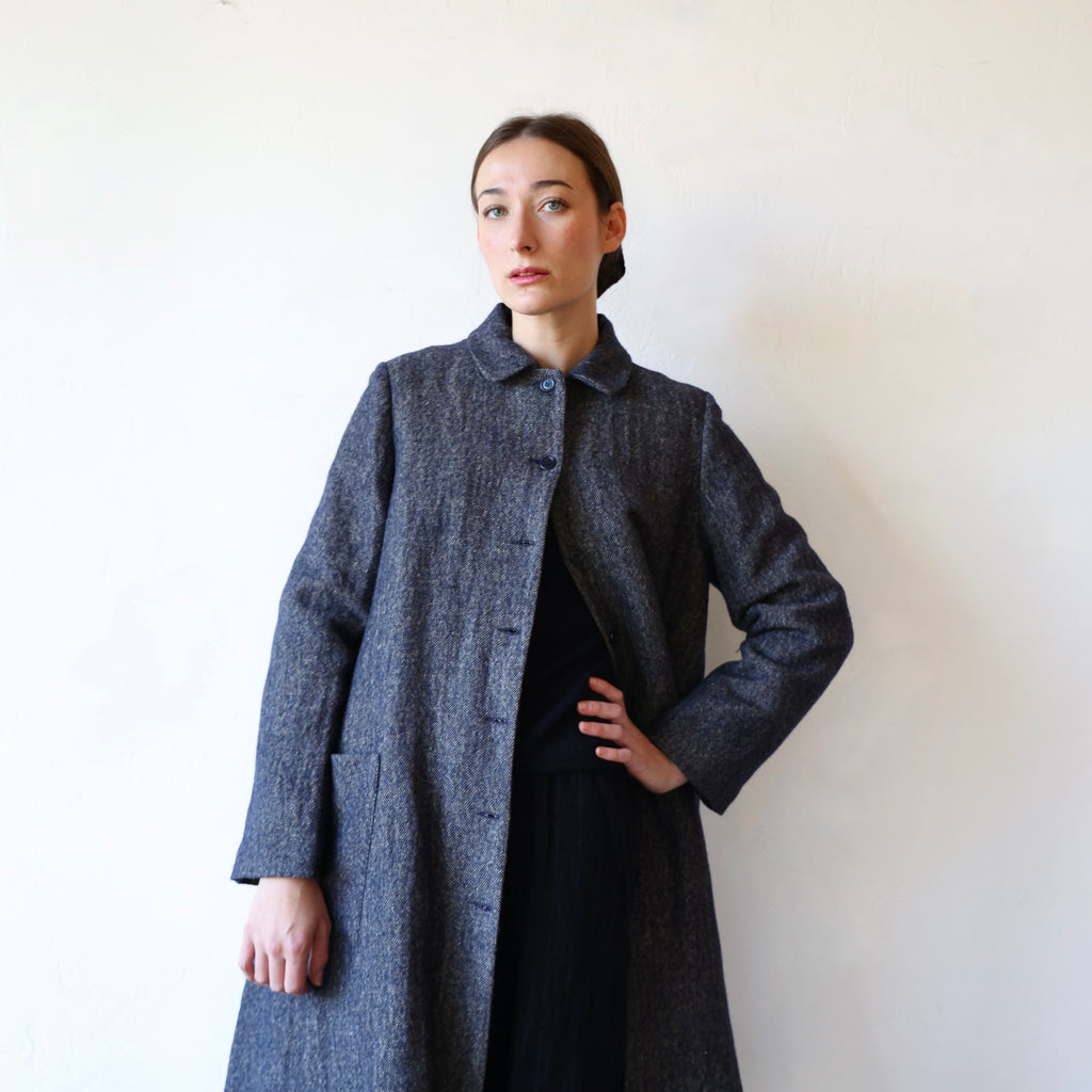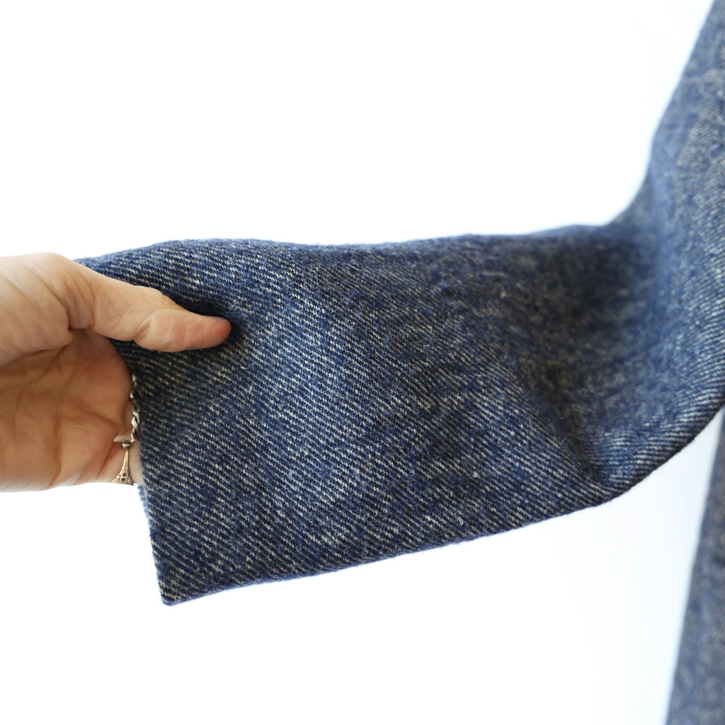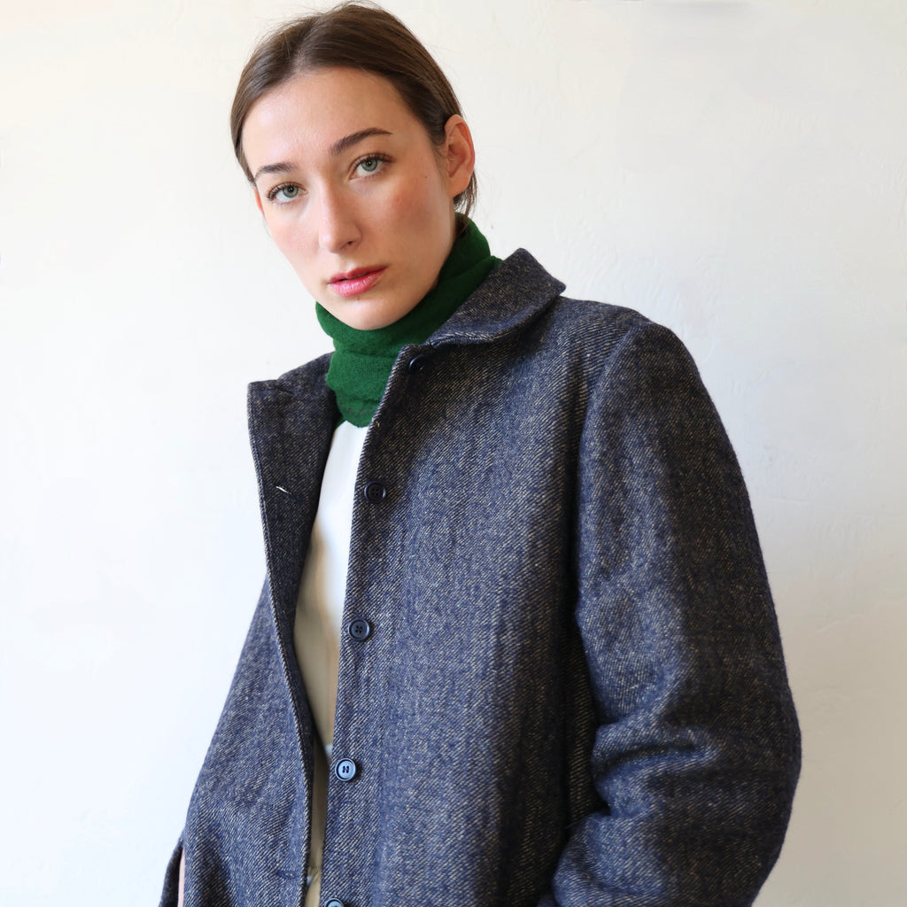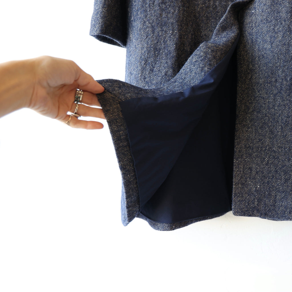 A gorgeous coat, made of a blue/cream variegated hemp & wool blend. The combination of the cream and navy gives it a really wonderful organic feel. It has a beautiful fit and a sophisticated feel while also being an easy, every day piece! This has a slightly rounded collar, buttons down the front, and a center back seam with a vent. There are two front patch pockets... so handy for your keys, phone, you name it! It's lined with a solid navy light cotton. It's also fun to wear this with the sleeves folded up to show the lining a bit. This is quite the beauty, and this hemp/wool combination feels so special and unique.