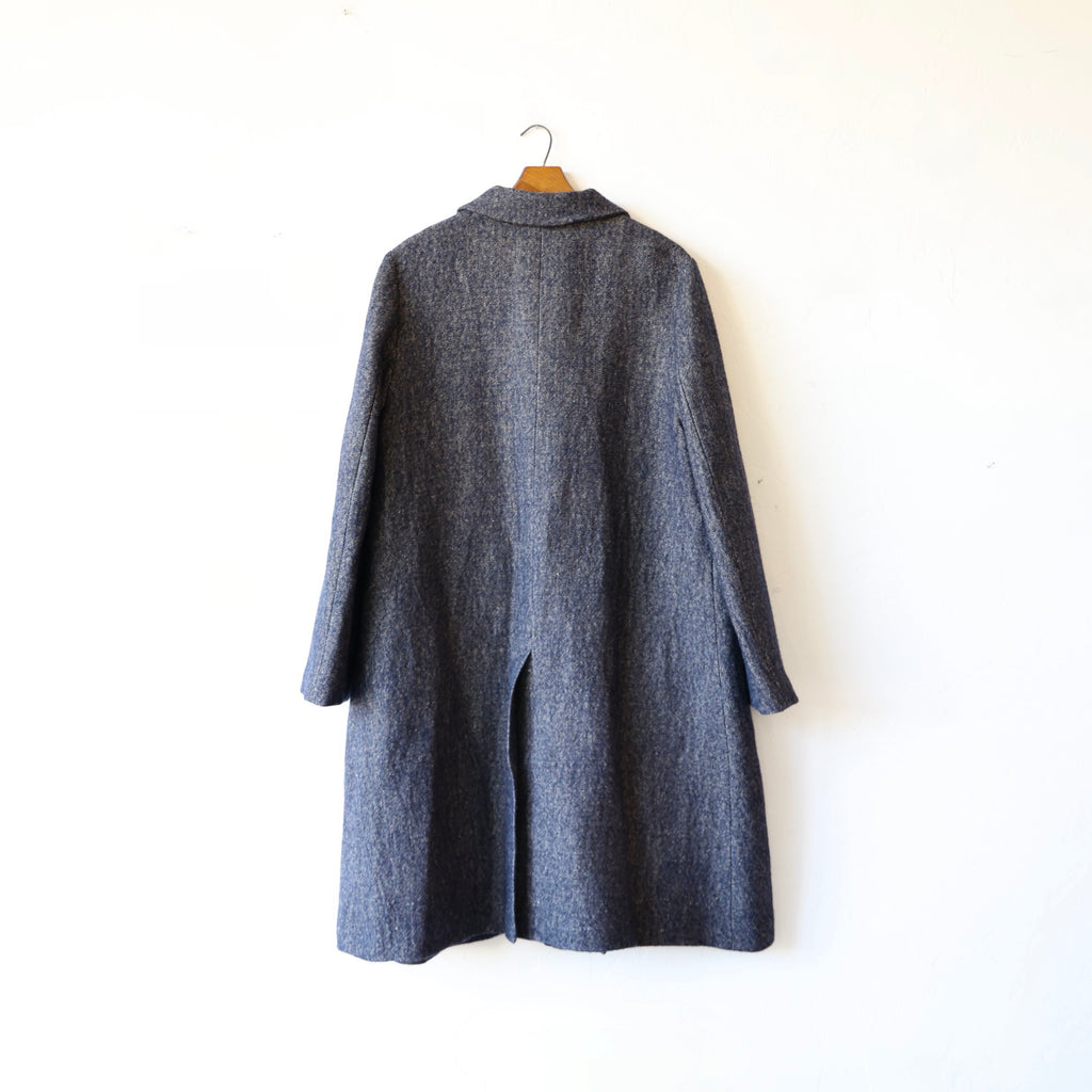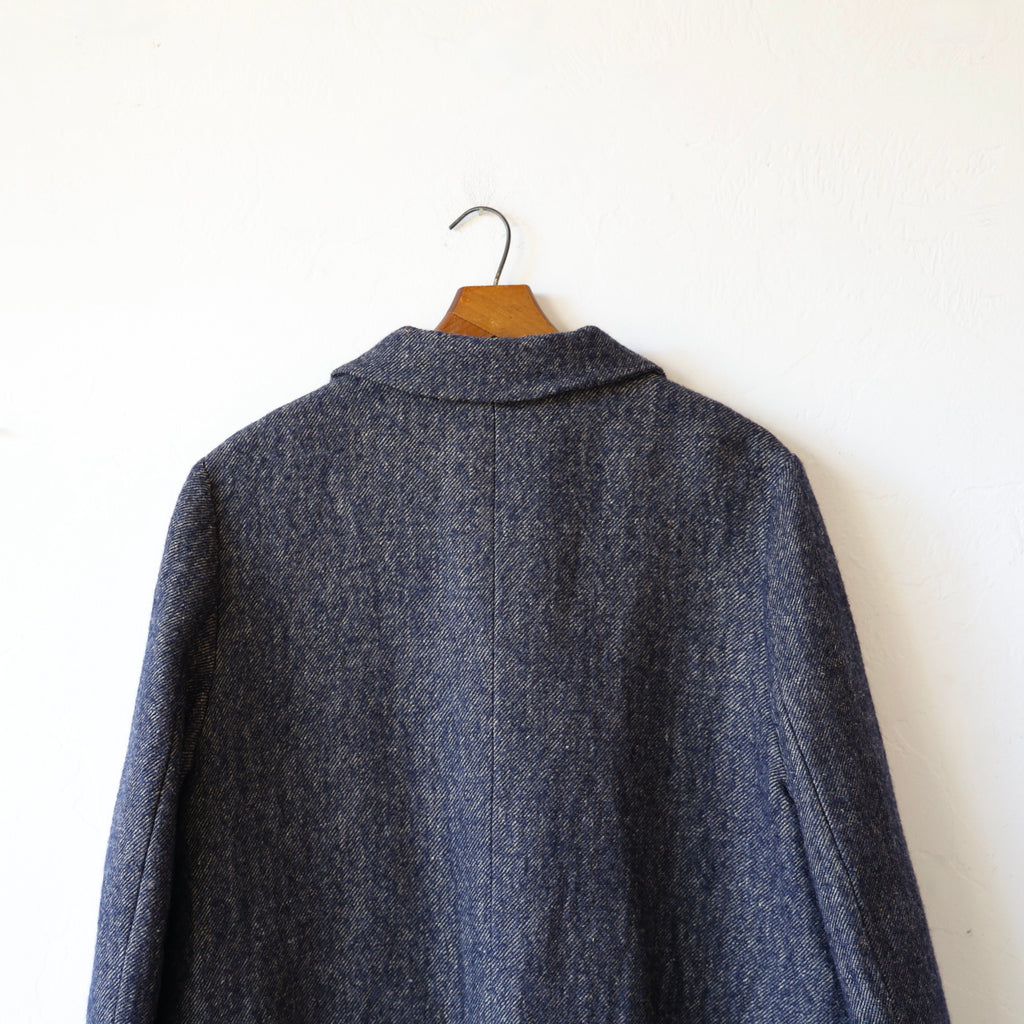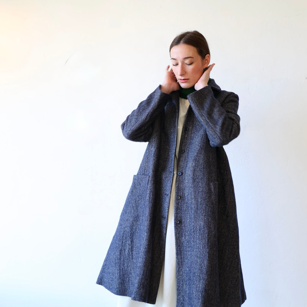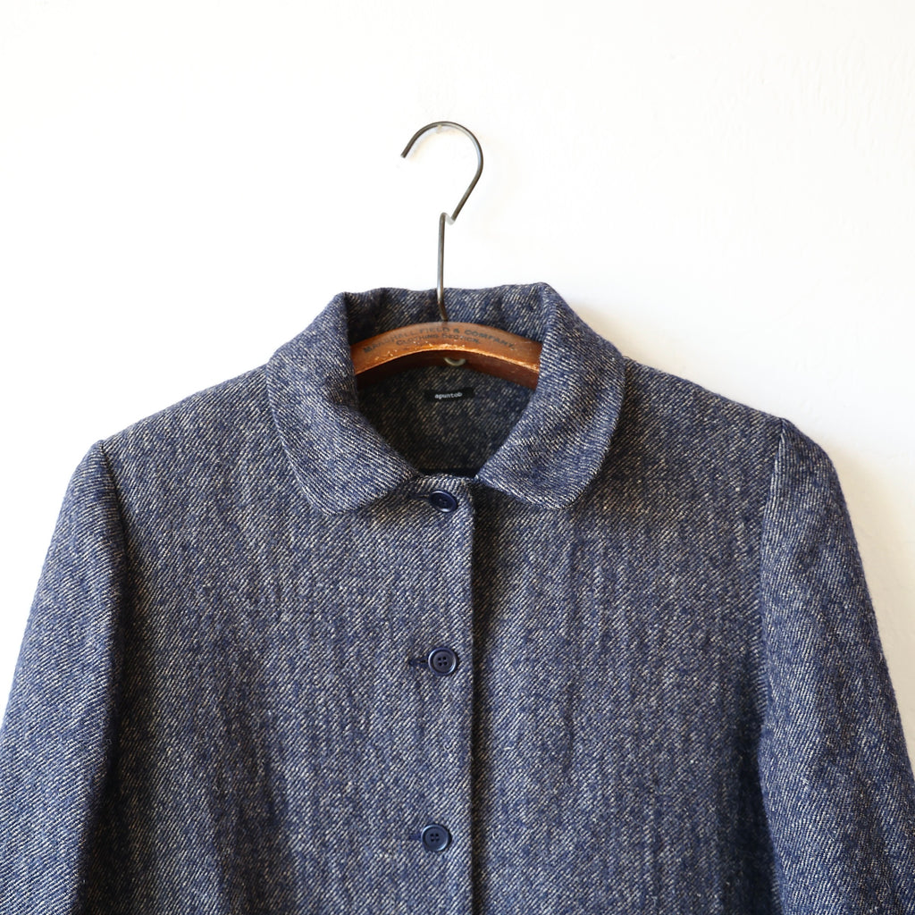 A gorgeous coat, made of a blue/cream variegated hemp & wool blend. The combination of the cream and navy gives it a really wonderful organic feel. It has a beautiful fit and a sophisticated feel while also being an easy, every day piece! This has a slightly rounded collar, buttons down the front, and a center back seam with a vent. There are two front patch pockets... so handy for your keys, phone, you name it! It's lined with a solid navy light cotton. It's also fun to wear this with the sleeves folded up to show the lining a bit. This is quite the beauty, and this hemp/wool combination feels so special and unique.