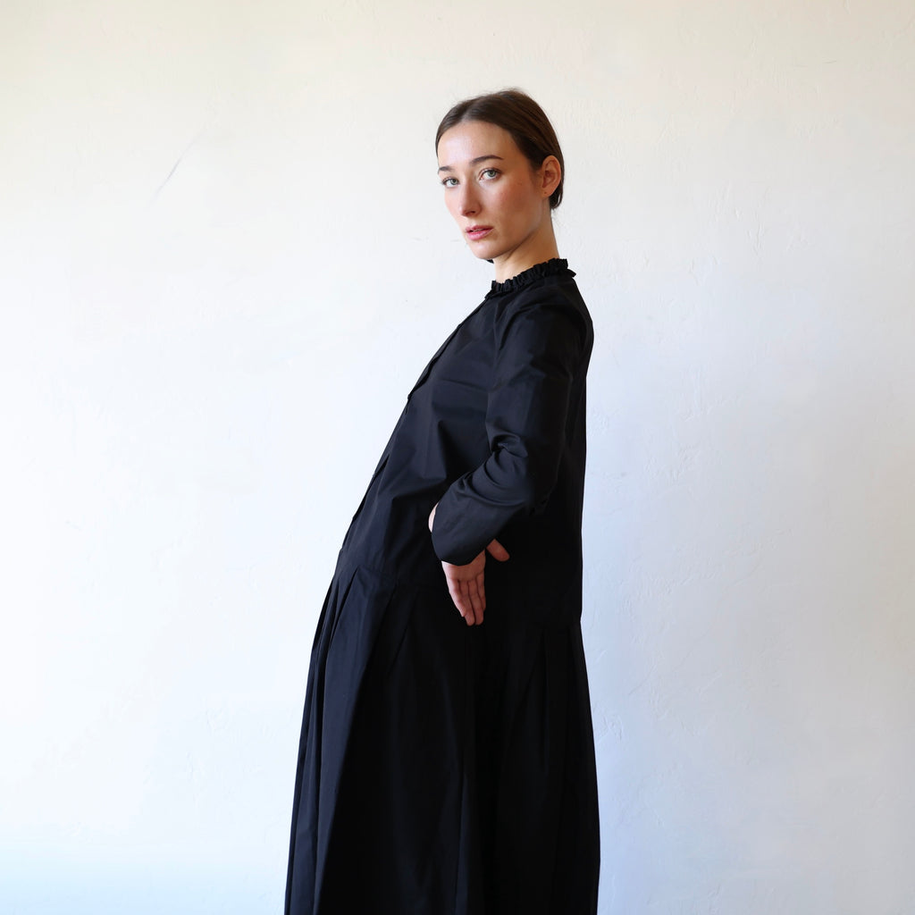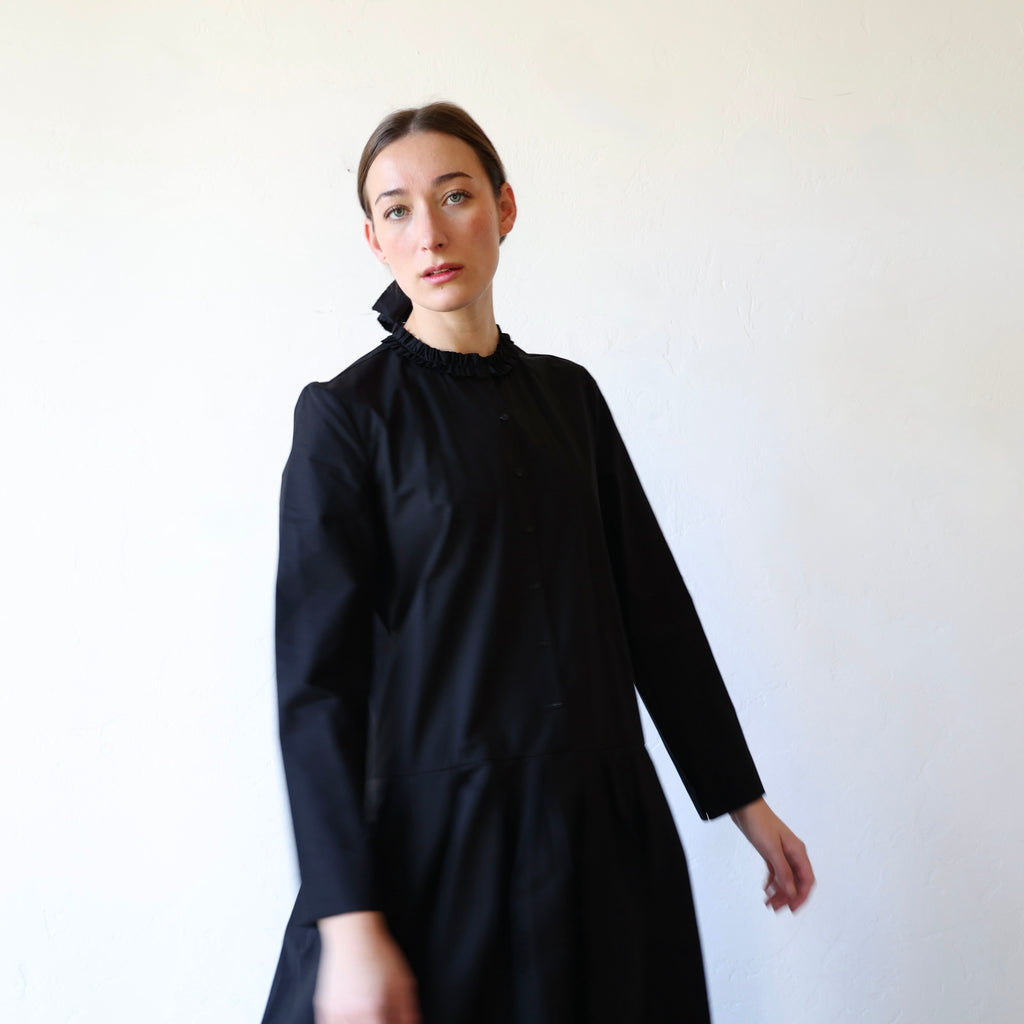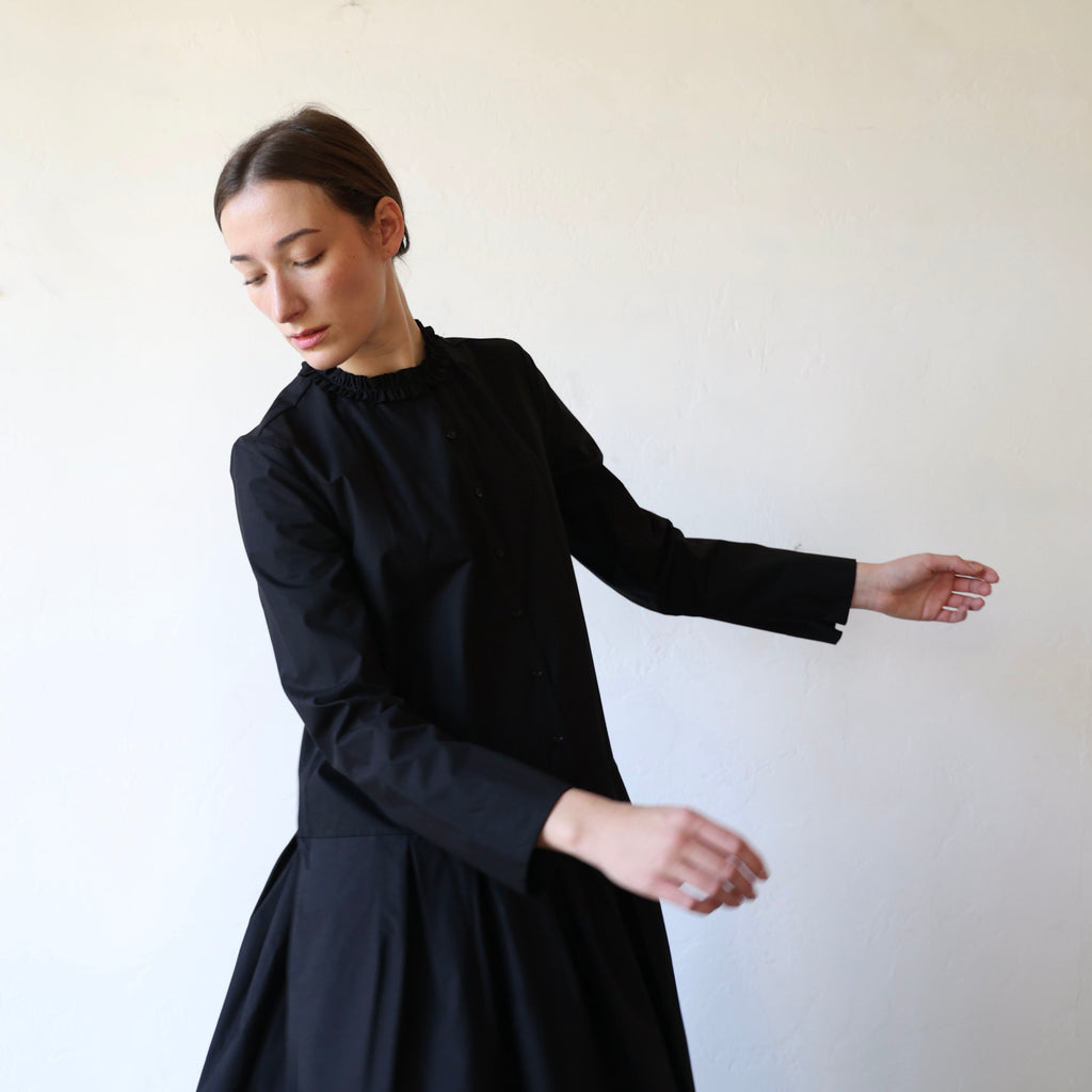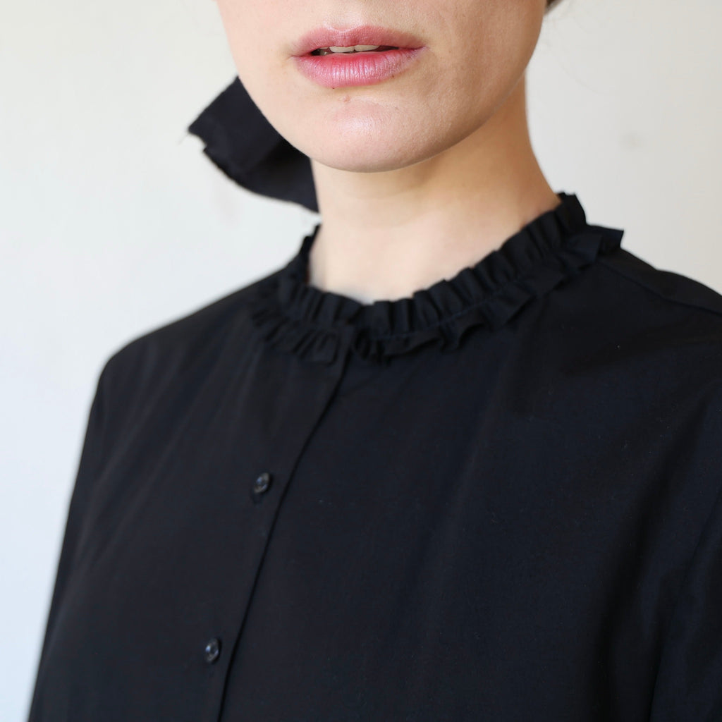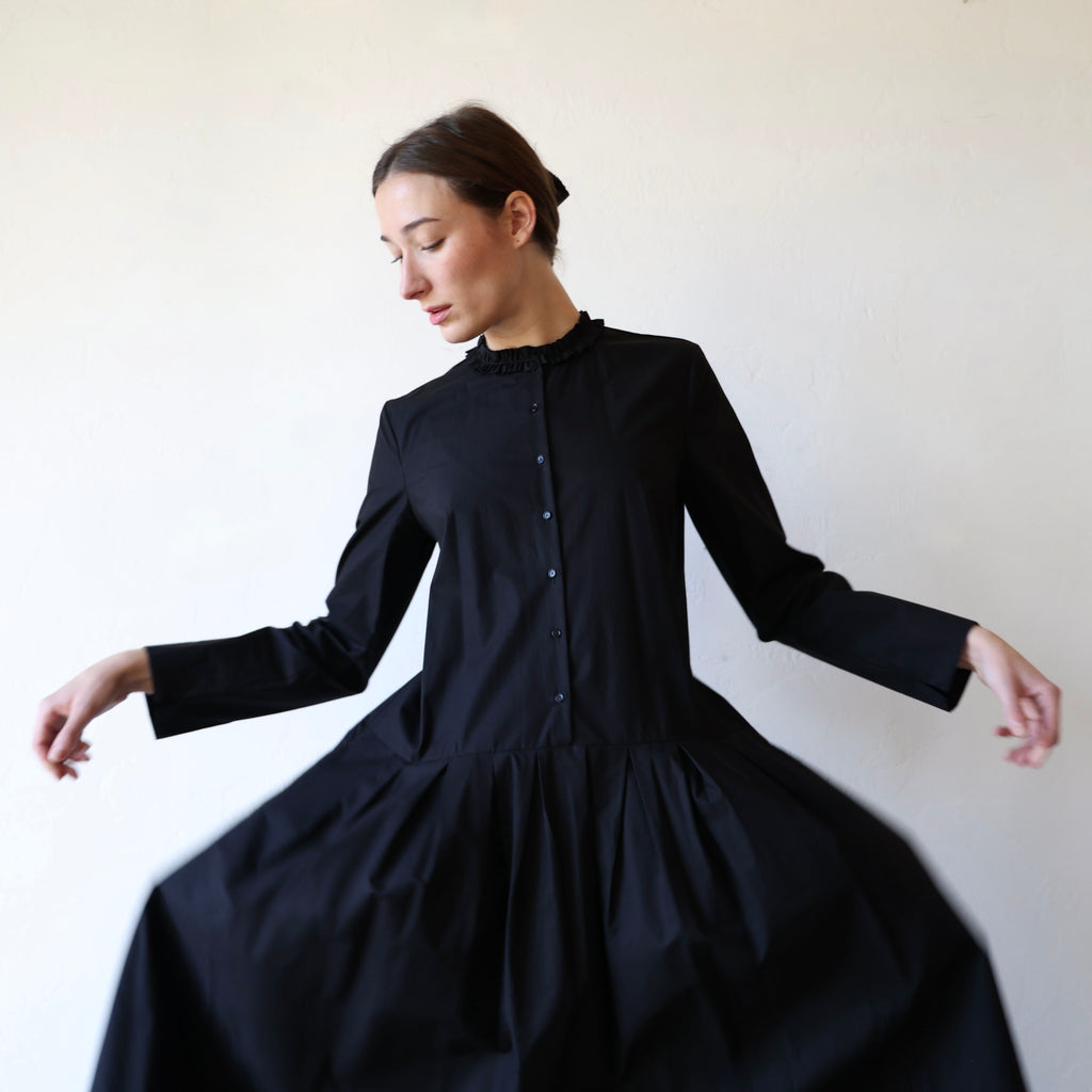 A stunning dress with a small raw edge ruffle around the neckline. This is made of a crisp, sturdy poplin. It has a wonderful long length with buttons down the top half. The waistline has strategically placed pleating - giving it a flattering shape. It has side seam pockets. The sleeves are full length with a small slit at the cuffs, making them easy to fold up. This looks great with the Le Monde Beryl black patent mary janes as well as the Repetto black patent jazz shoes.