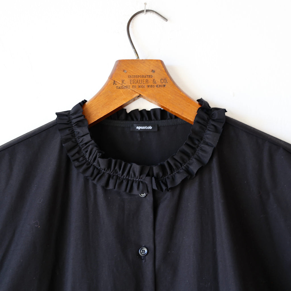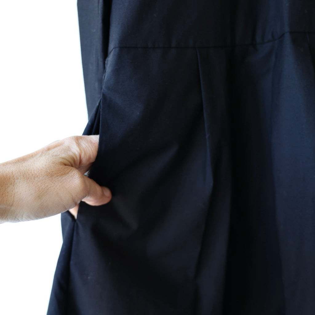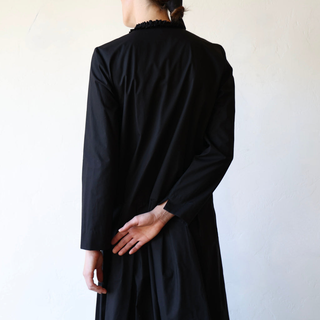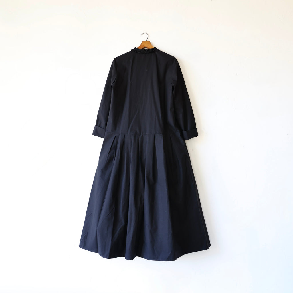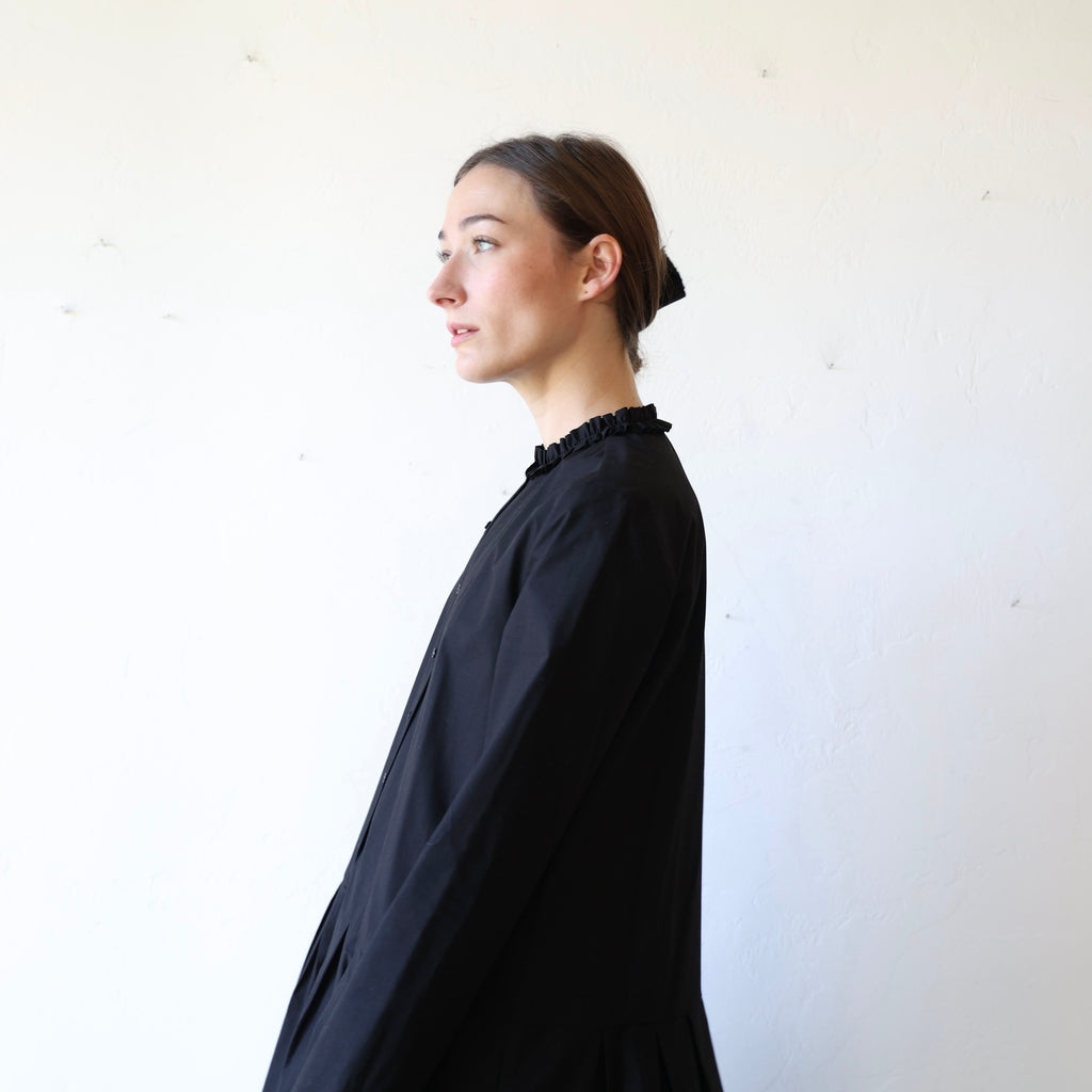 A stunning dress with a small raw edge ruffle around the neckline. This is made of a crisp, sturdy poplin. It has a wonderful long length with buttons down the top half. The waistline has strategically placed pleating - giving it a flattering shape. It has side seam pockets. The sleeves are full length with a small slit at the cuffs, making them easy to fold up. This looks great with the Le Monde Beryl black patent mary janes as well as the Repetto black patent jazz shoes.