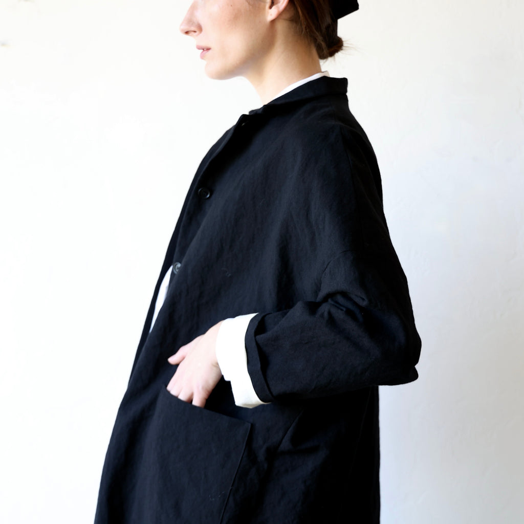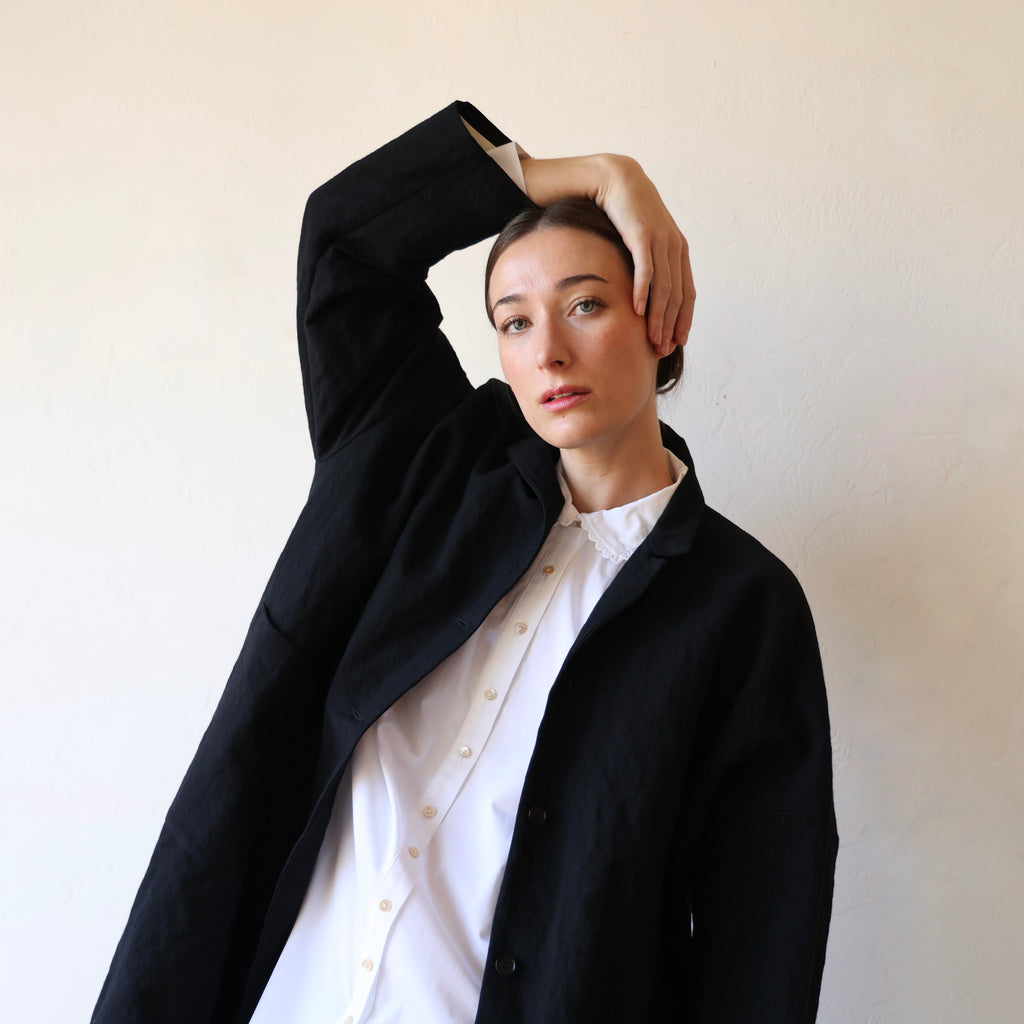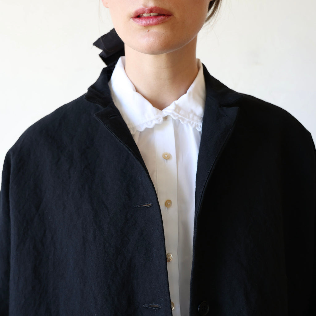 A beautiful, classic coat. This is made of a gorgeous black herringbone weave of fleece wool and cotton mixed with a hint of metal fiber. The metal fiber gives the coat the most wonderful texture and structure. It looks and feels exquisite. This has a lovely small notched stand collar, buttons down the front and two front patch pockets. It has a roomy fit with drop shoulders. It has a light cream cotton lilning, which is so great in contrast with the black. It's fun to wear it with the sleeves folded up to show the contrasting lining. A timeless, gorgeous piece.