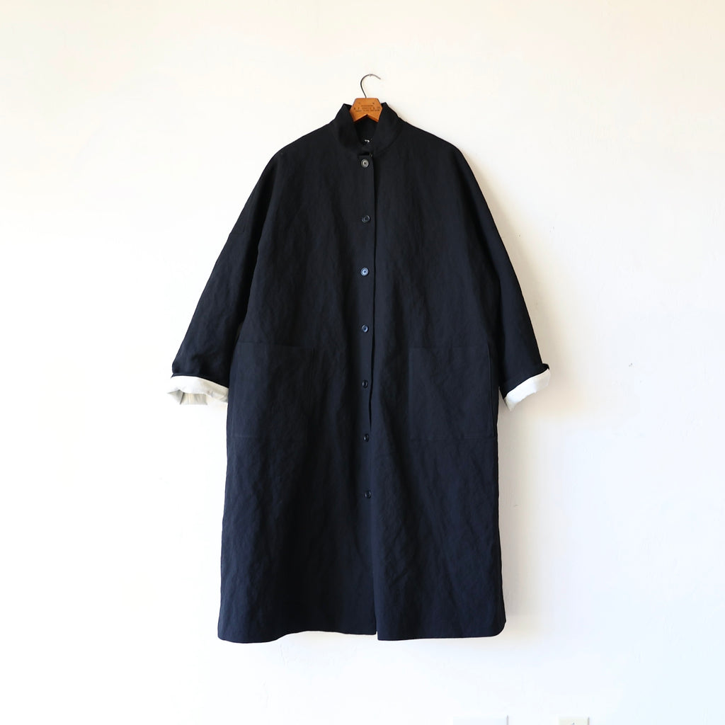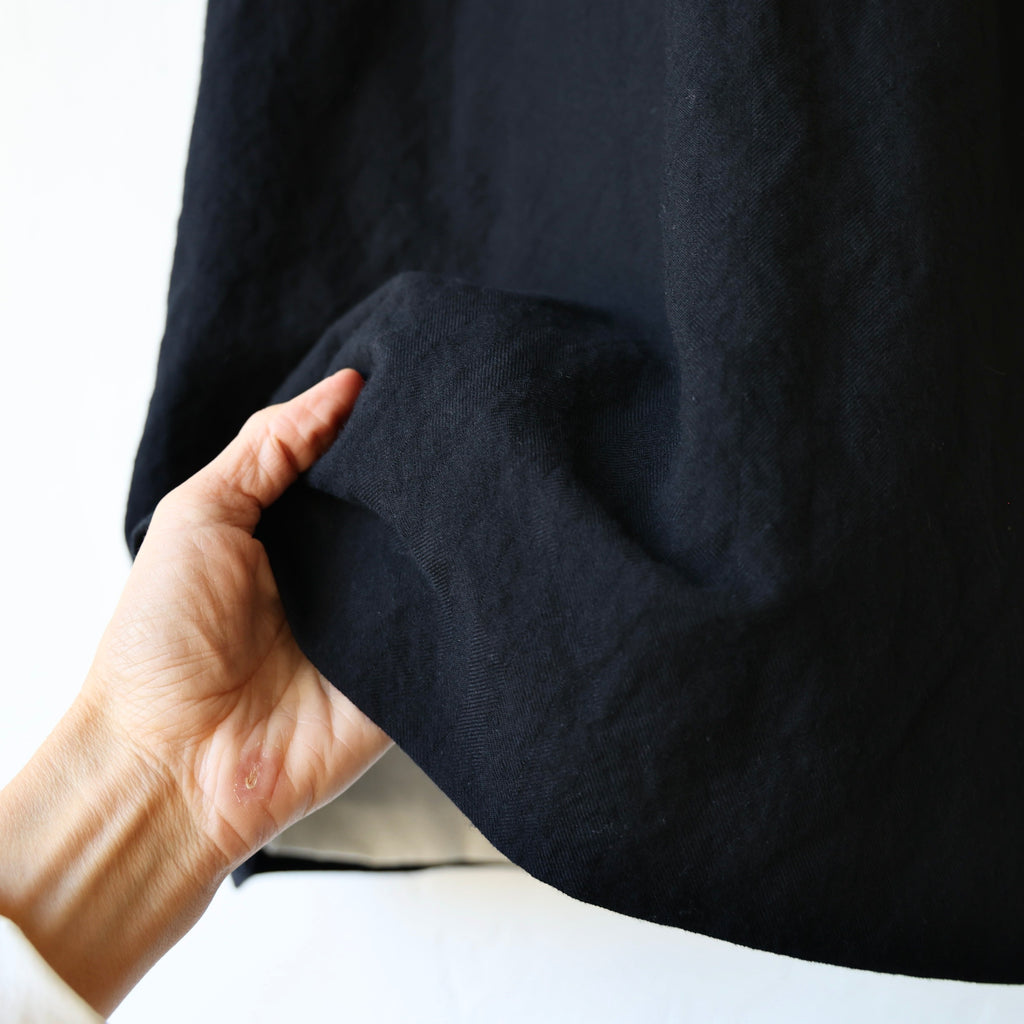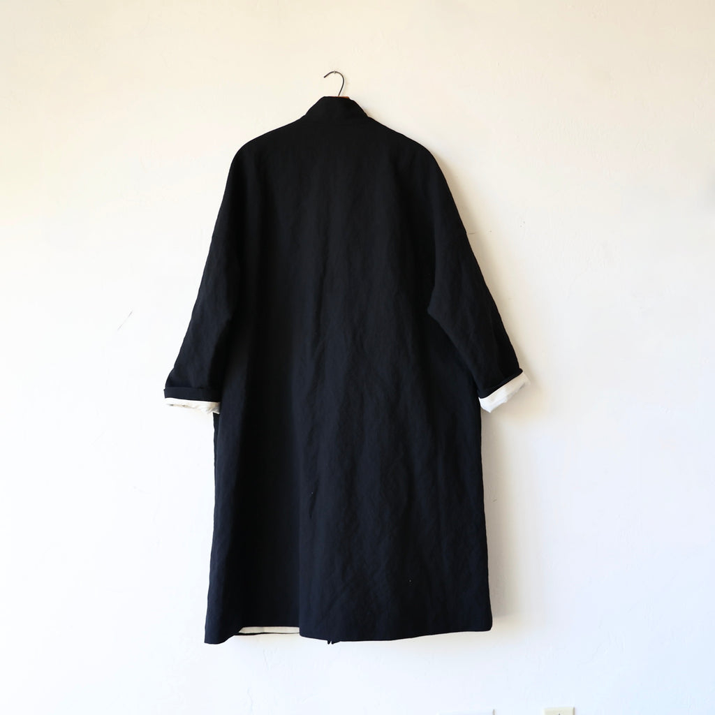 A beautiful, classic coat. This is made of a gorgeous black herringbone weave of fleece wool and cotton mixed with a hint of metal fiber. The metal fiber gives the coat the most wonderful texture and structure. It looks and feels exquisite. This has a lovely small notched stand collar, buttons down the front and two front patch pockets. It has a roomy fit with drop shoulders. It has a light cream cotton lilning, which is so great in contrast with the black. It's fun to wear it with the sleeves folded up to show the contrasting lining. A timeless, gorgeous piece.