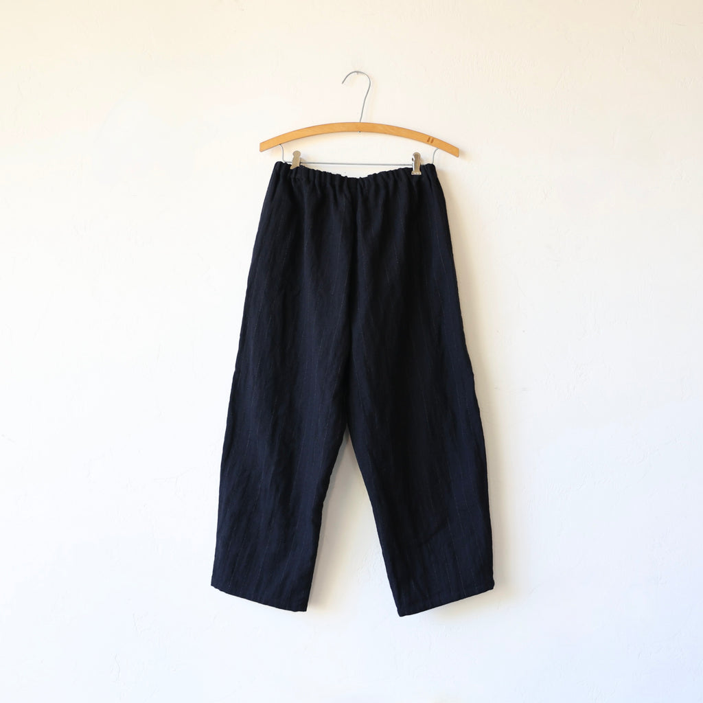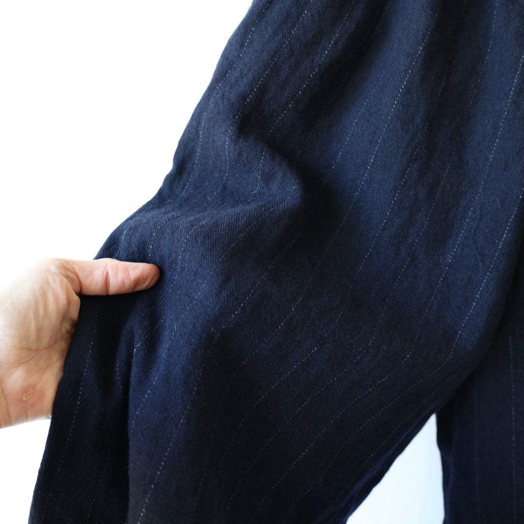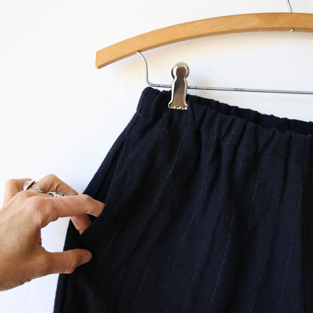 These are wonderful trousers made of a wool and cotton mix with a bit of metal thread which gives them their great texture and structure. The color is a great navy with a subtle woven pinstripe in ivory. They are incredibly comfortable and very flattering because of the cut of the leg which has a rounded shape. They have an elastic waist for easy wear and comfort. There are side seam pockets. This is one of Apuntob's classic trouser cuts that we love and typically carry each season in different colors and fabrics. These look great with the Apuntob navy jacket as well as the navy cardigan.
