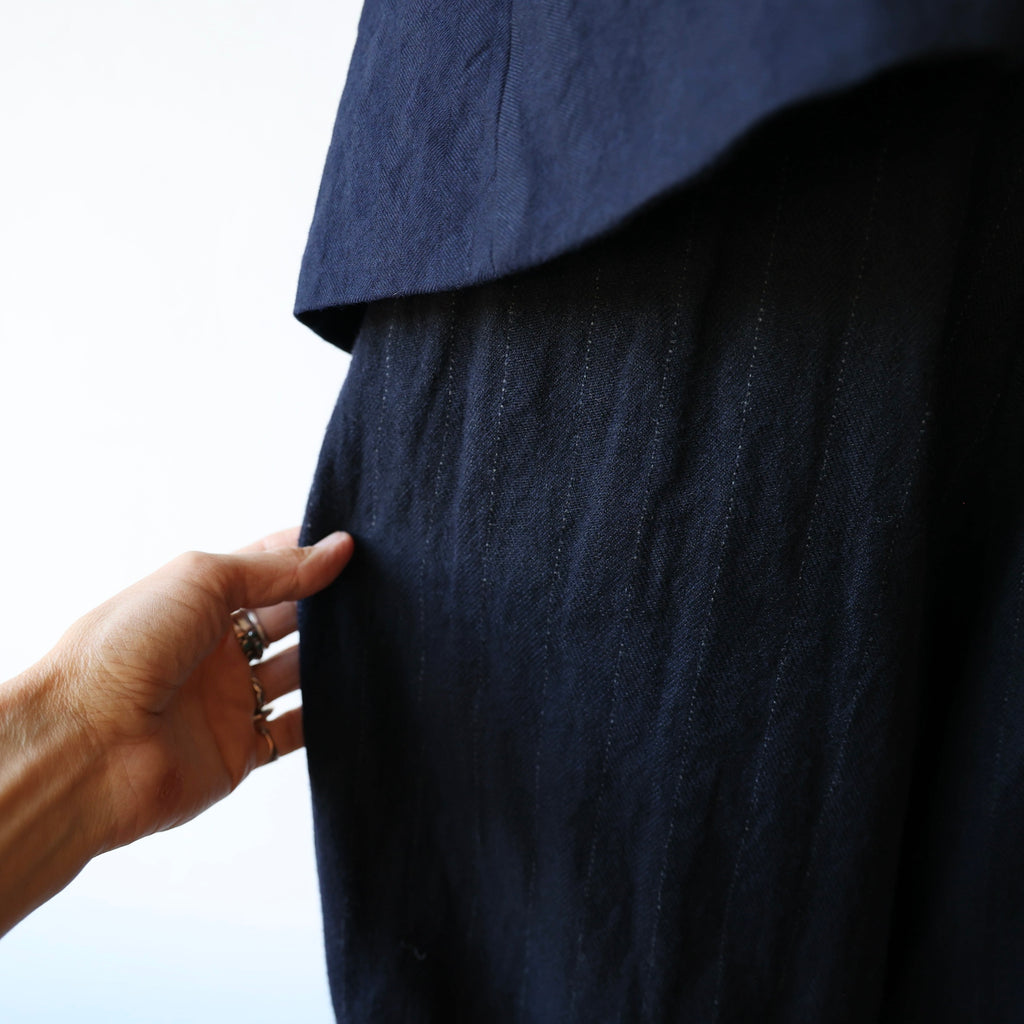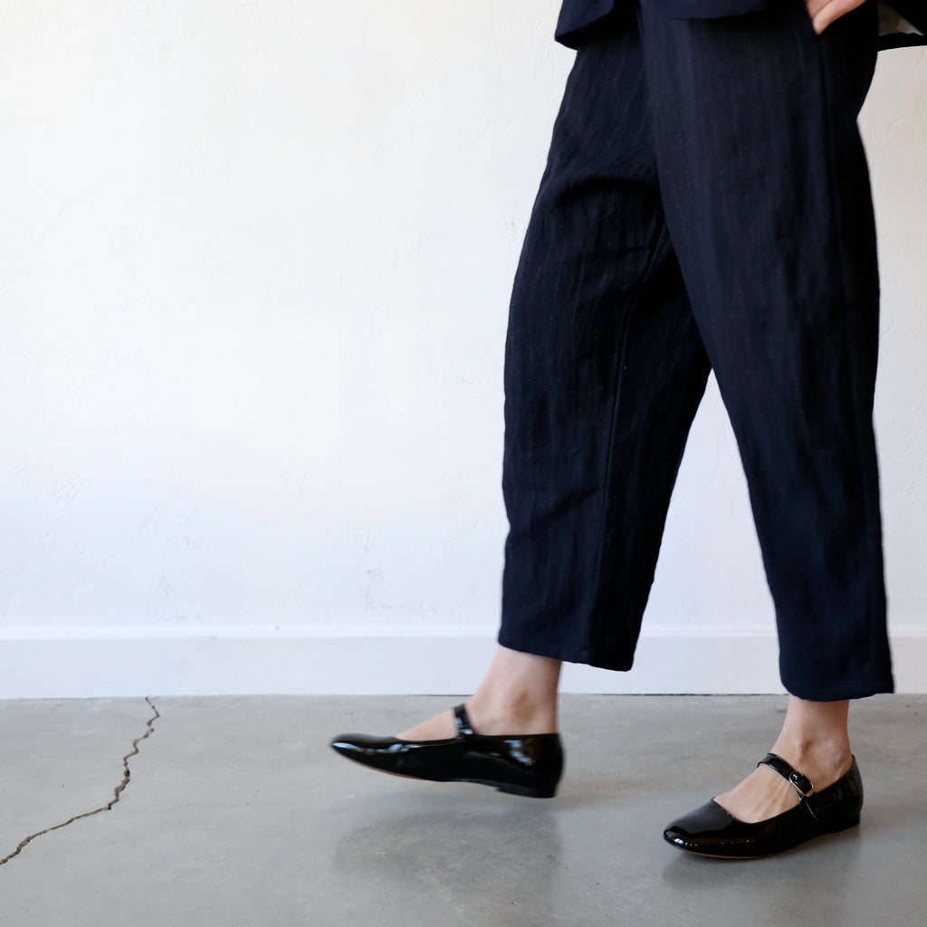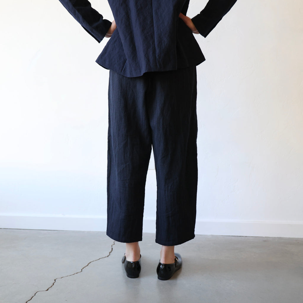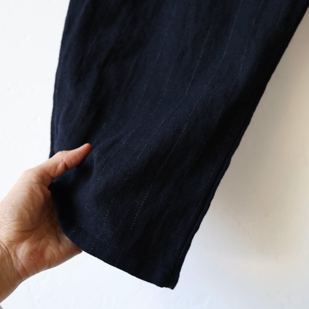 These are wonderful trousers made of a wool and cotton mix with a bit of metal thread which gives them their great texture and structure. The color is a great navy with a subtle woven pinstripe in ivory. They are incredibly comfortable and very flattering because of the cut of the leg which has a rounded shape. They have an elastic waist for easy wear and comfort. There are side seam pockets. This is one of Apuntob's classic trouser cuts that we love and typically carry each season in different colors and fabrics. These look great with the Apuntob navy jacket as well as the navy cardigan.