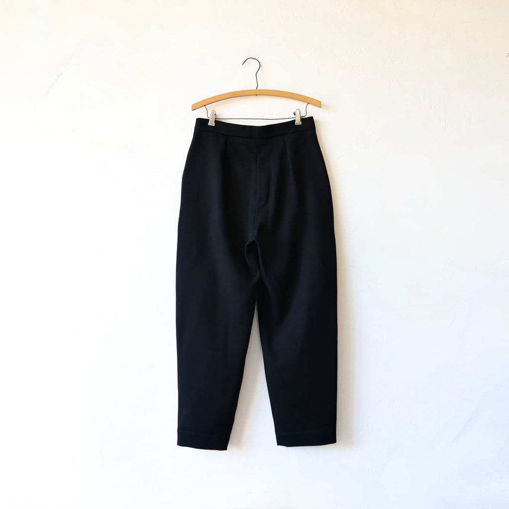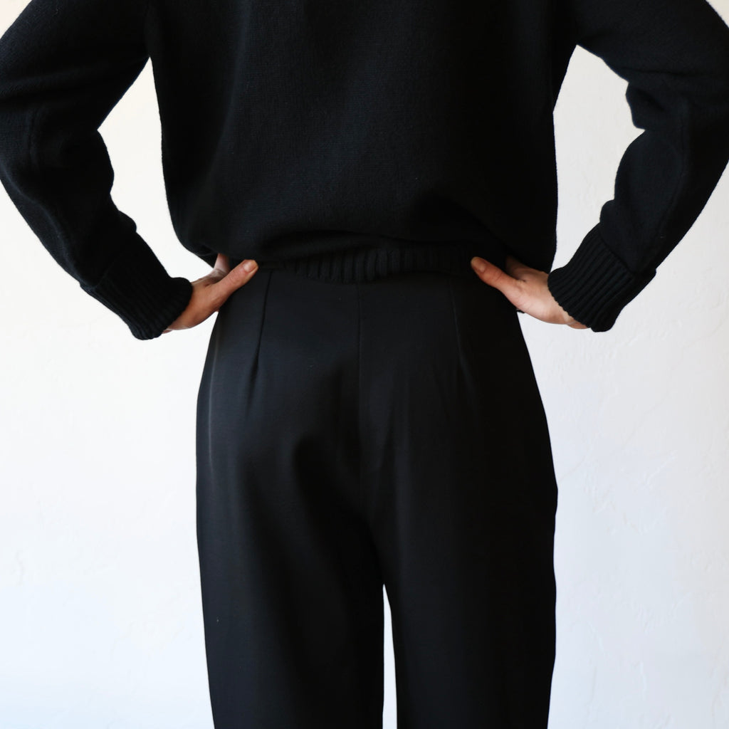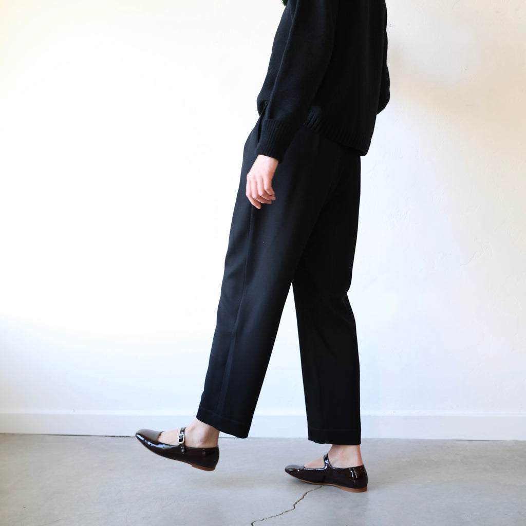 Beautiful pants made of a super fine Italian organic wool twill. They are very soft and almost slinky in touch and feel. They have a beautiful, classic fit with one pleat at each side of the front and darts at the back. They have side pockets, a zipper fly and a button closure. These are timeless and beautifully made. We show them with the Jud Glover Pullover in black and the Le Monde Beryl Mary Janes in Plum Patent.