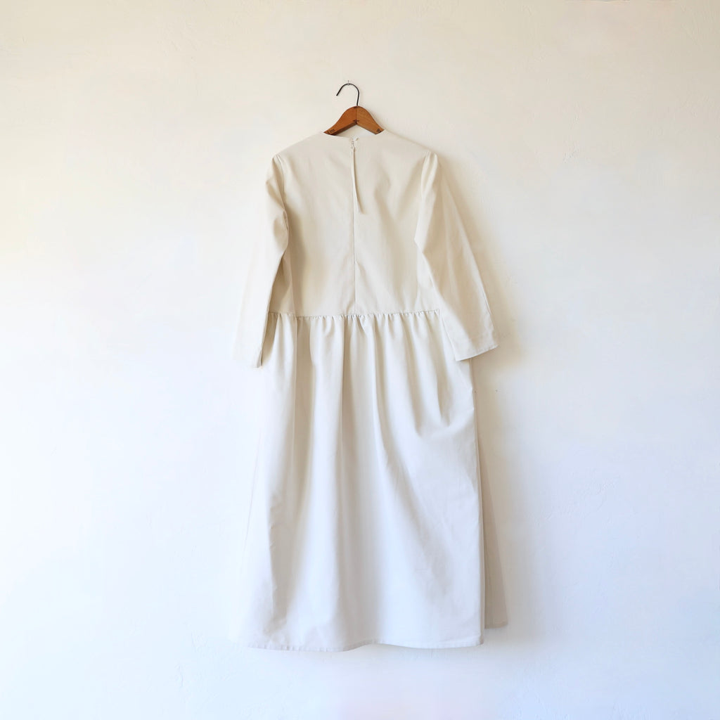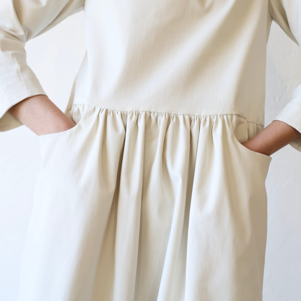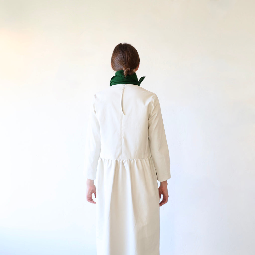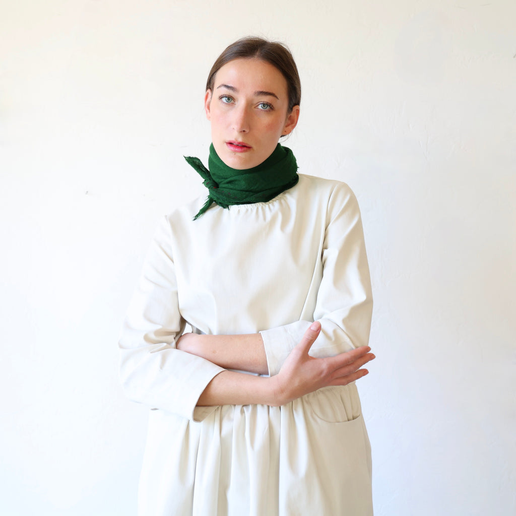A gorgeous dress made of an incredible cotton cashmere blend from one of the finest Italian heritage mills. This fabric has a great structure and is medium weight. It has the softest finish, luxurious to the touch. It has gathering at the front of the neckline, bracelet length sleeves with shaping darts at the bottom of the sleeve. The waistline has gathering a pockets worked in. It has a wonderful long length. The back has a zipper closure with a small button at the top. This is such a great dress for the winter months! We love this with a beautiful scarf and Repetto Jazz Shoes or Le Monde Beryl Mary Janes.