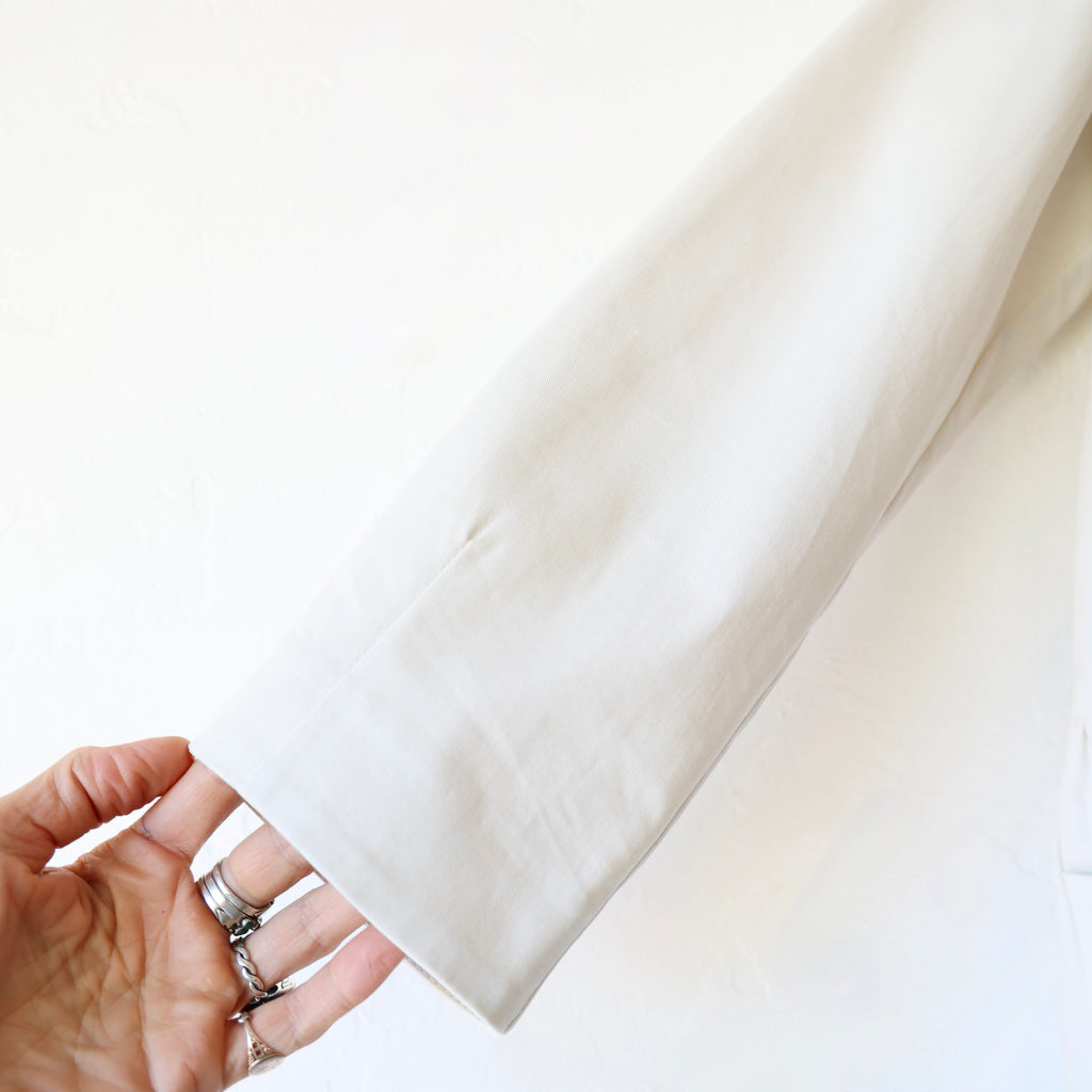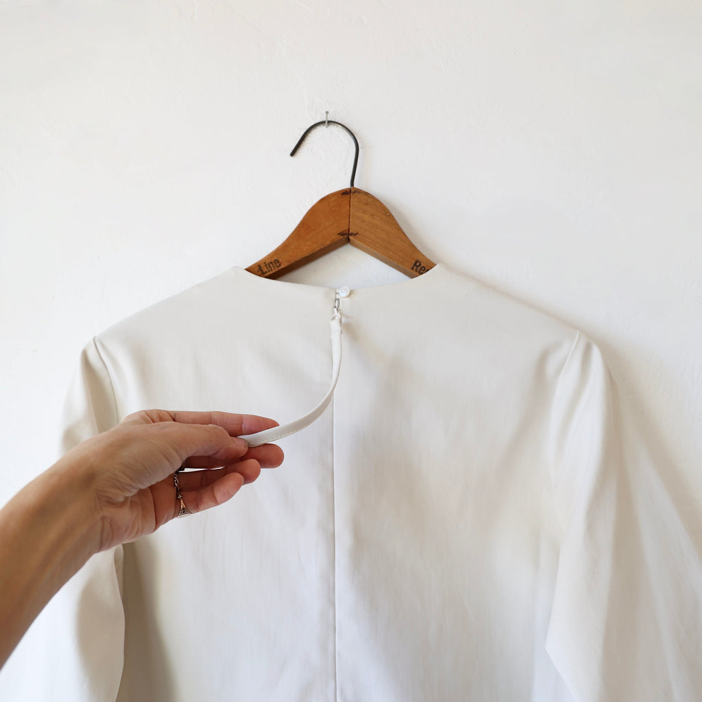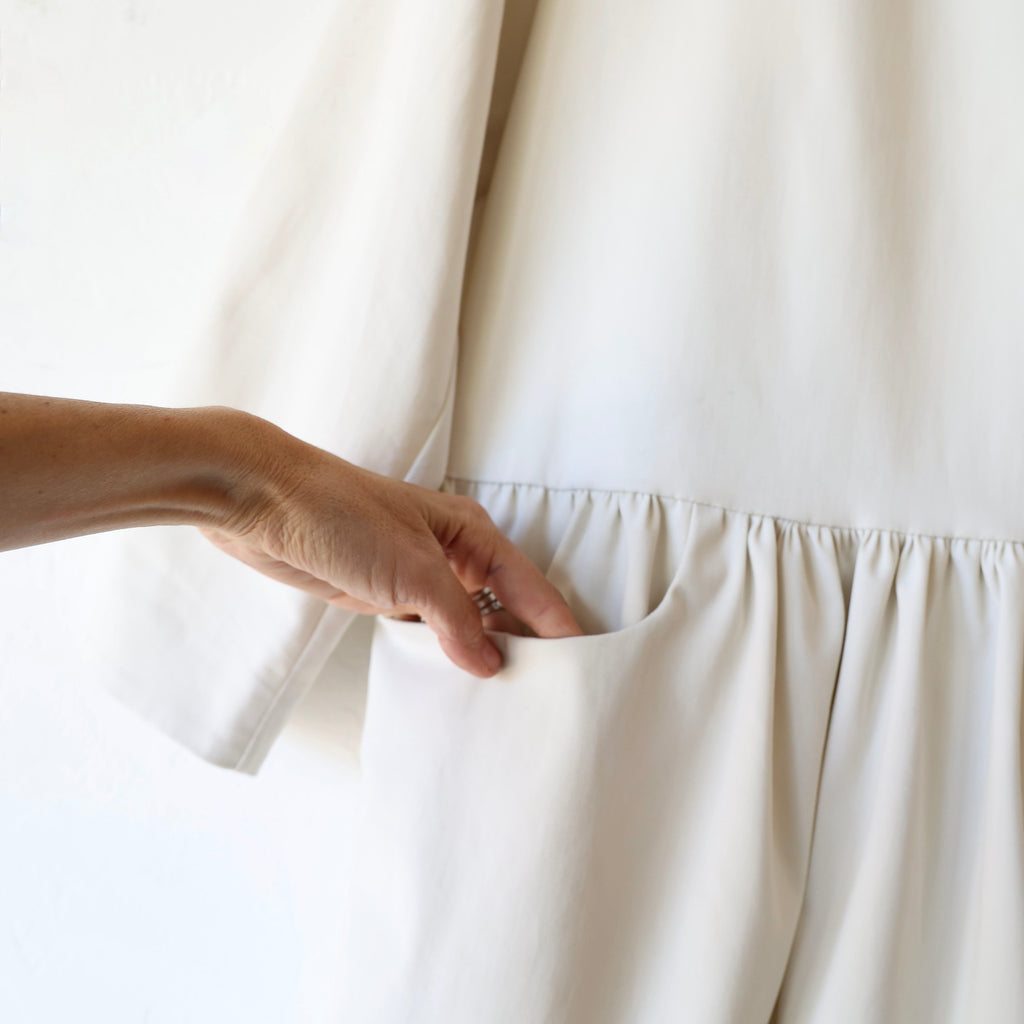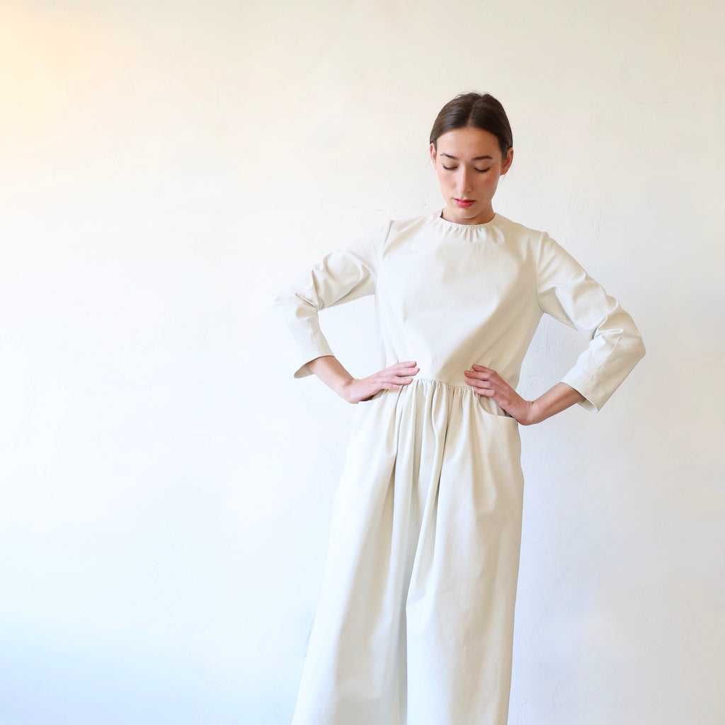 A gorgeous dress made of an incredible cotton cashmere blend from one of the finest Italian heritage mills. This fabric has a great structure and is medium weight. It has the softest finish, luxurious to the touch. It has gathering at the front of the neckline, bracelet length sleeves with shaping darts at the bottom of the sleeve. The waistline has gathering a pockets worked in. It has a wonderful long length. The back has a zipper closure with a small button at the top. This is such a great dress for the winter months! We love this with a beautiful scarf and Repetto Jazz Shoes or Le Monde Beryl Mary Janes.
