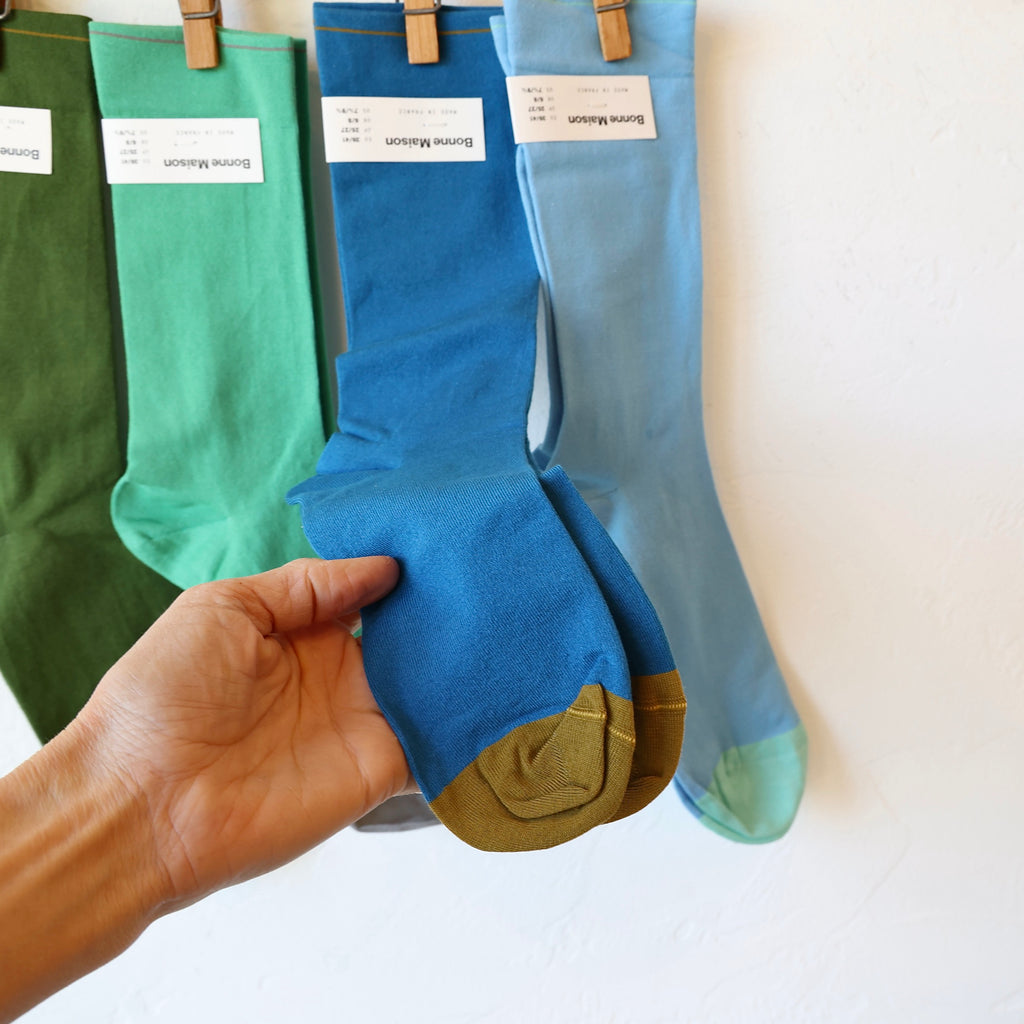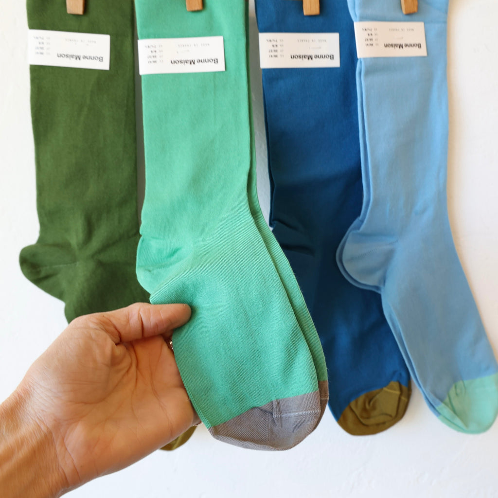 Bonne Maison socks are a favorite of ours. We love how nicely they fit the foot with a thickness that is perfectly substantial but thin at the same time. We wear them often with the Repetto ballet flats and jazz shoes - they are fine enough to wear with a close fitting shoe. On top of the quality, the colors are so fun - we carry different combinations each season. Here we list the cool colors, available in 4 options, listed from left to right in the first photo.