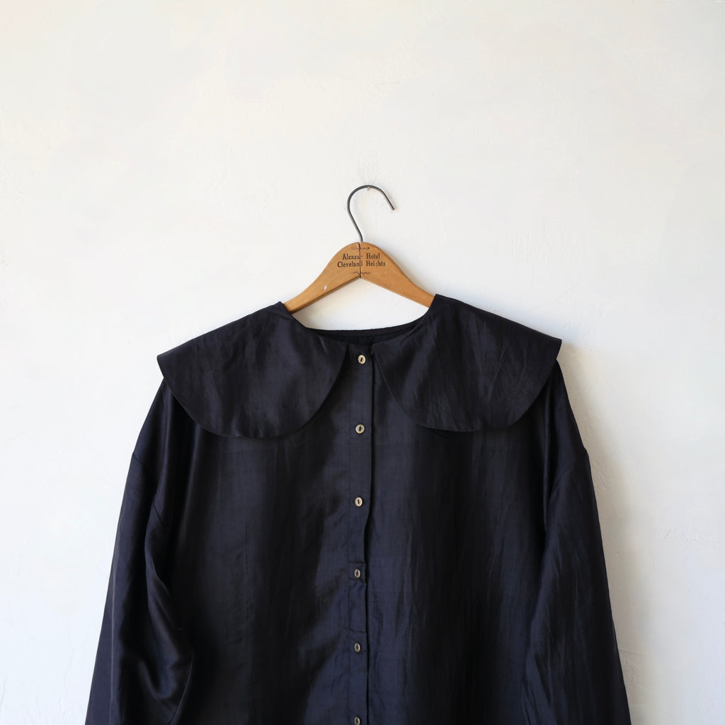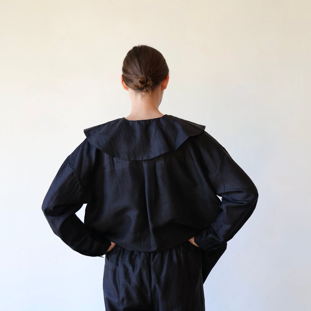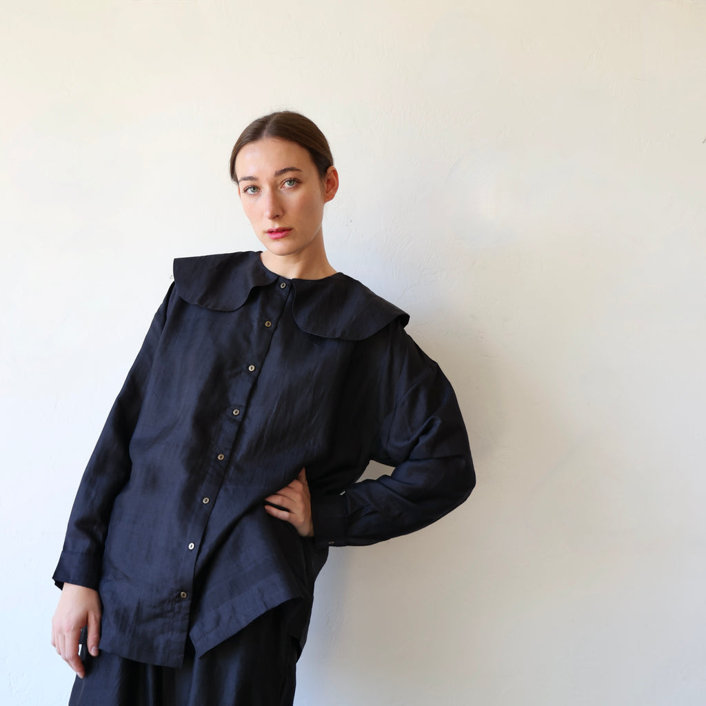 This is such a wonderful blouse with its big rounded collar and long length. This is made of Bunon's signature silk - it's light, flowy and so beautiful with it's slight, subdued sheen. It's easy to layer because the silk lays so nicely against the skin and is not bulky. It has shell buttons down the front an at the sleeve cuffs. It has a length that hits at the upper thigh. There are slits at each side and a box pleat at the back. It's a delightful piece. We love it with the Bunon Flutter Pants in black and it's also beautiful with denim.
