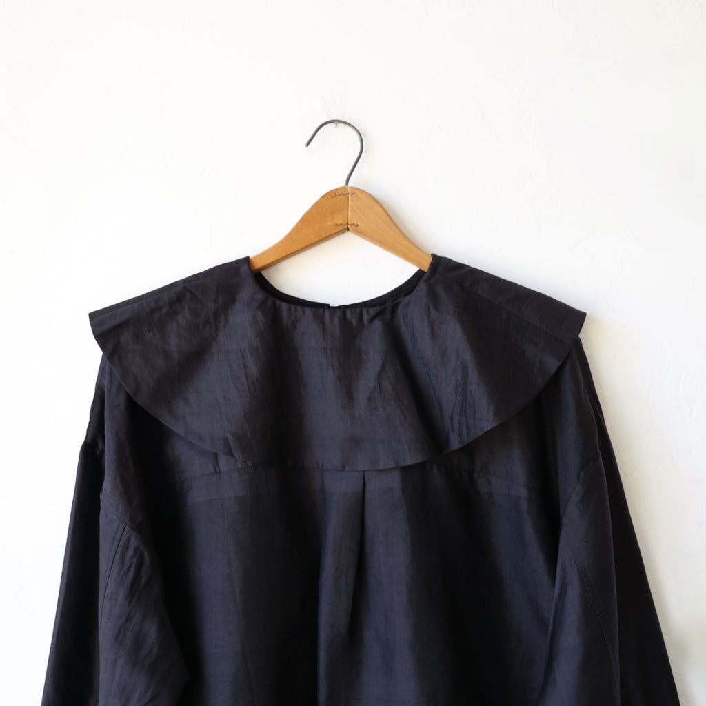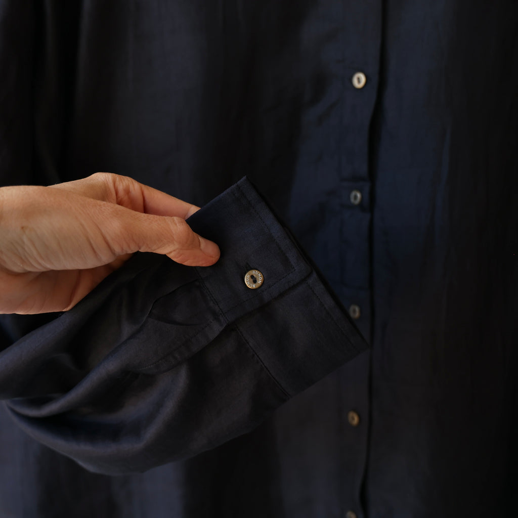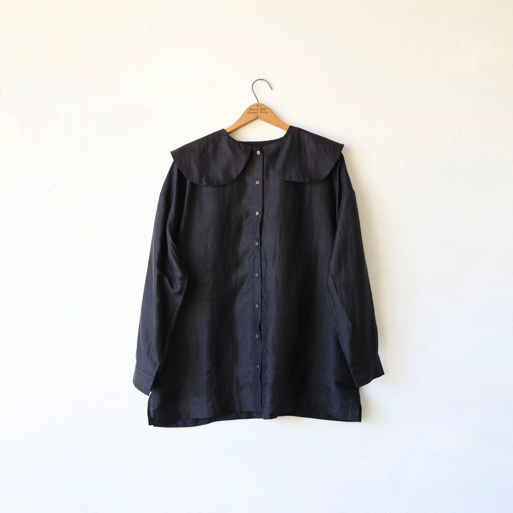 This is such a wonderful blouse with its big rounded collar and long length. This is made of Bunon's signature silk - it's light, flowy and so beautiful with it's slight, subdued sheen. It's easy to layer because the silk lays so nicely against the skin and is not bulky. It has shell buttons down the front an at the sleeve cuffs. It has a length that hits at the upper thigh. There are slits at each side and a box pleat at the back. It's a delightful piece. We love it with the Bunon Flutter Pants in black and it's also beautiful with denim.