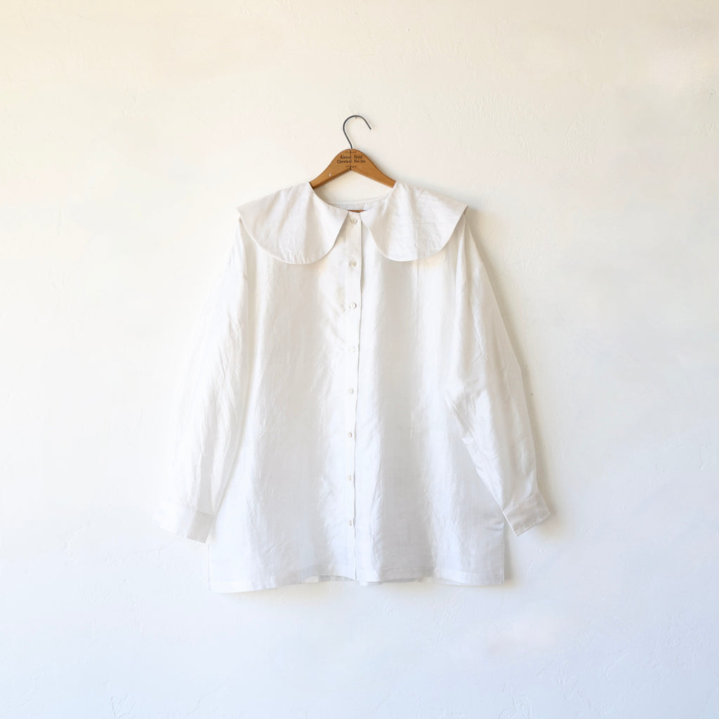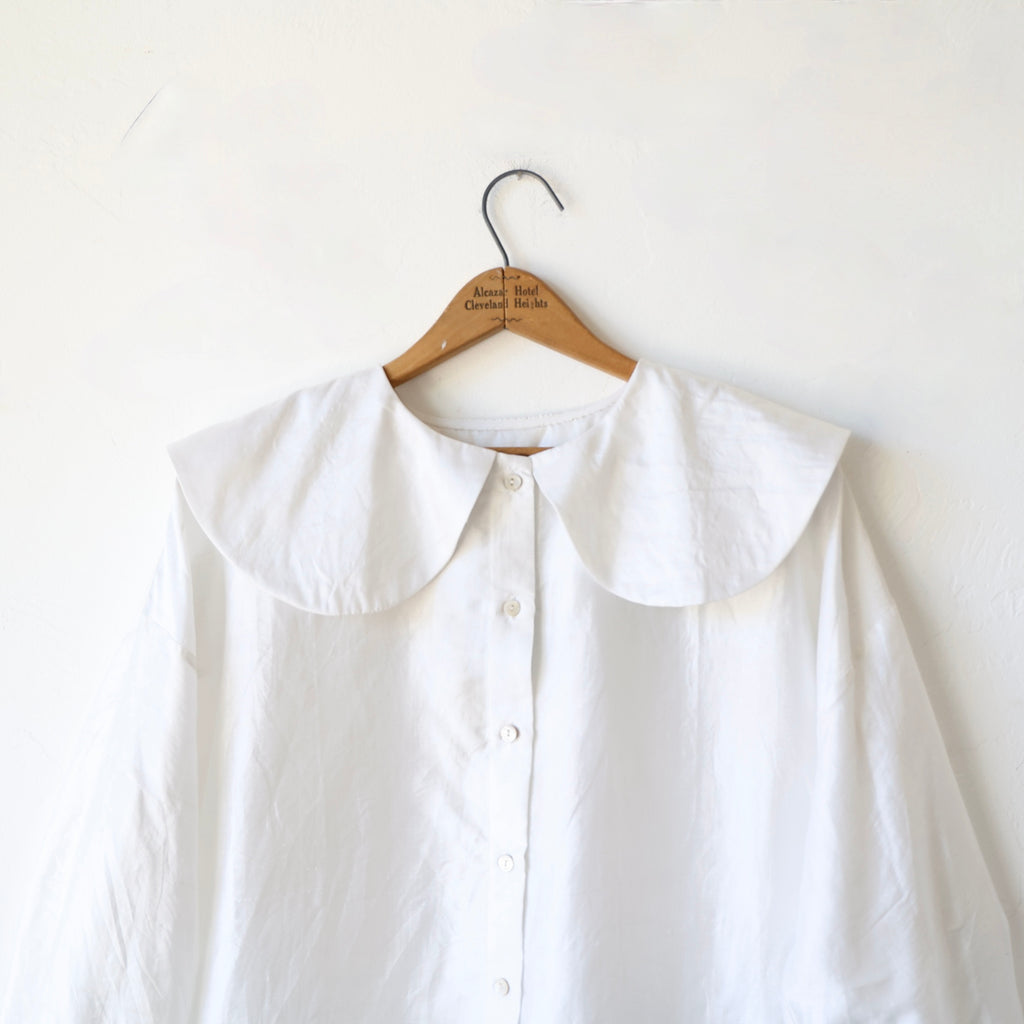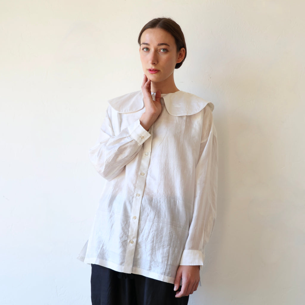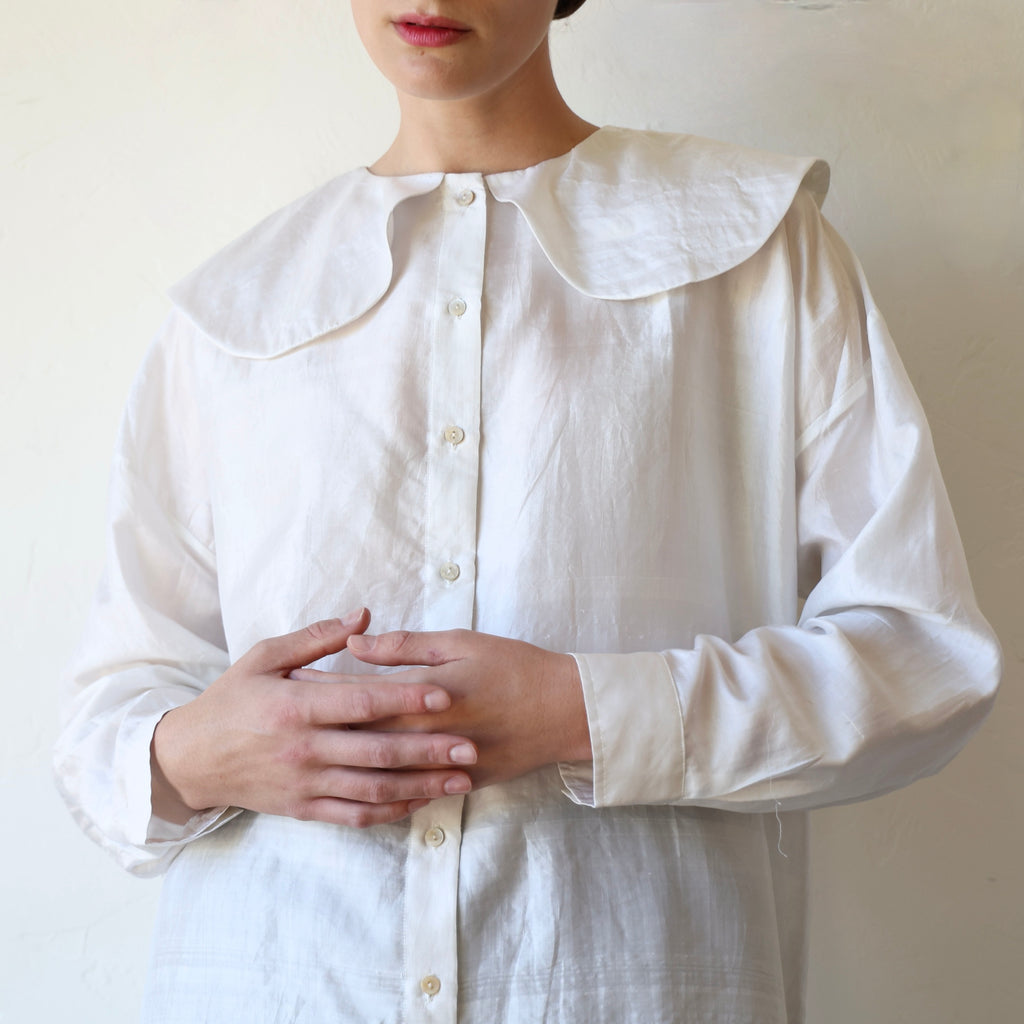 This is such a wonderful blouse with its big rounded collar and long length. This is made of Bunon's signature silk - it's light, flowy and so beautiful with it's slight, subdued sheen. It's easy to layer because the silk lays so nicely against the skin and is not bulky. It has shell buttons down the front an at the sleeve cuffs. It has a length that hits at the upper thigh. There are slits at each side and a box pleat at the back. It's a delightful piece. We love it with the Bunon Flutter Pants in black and it's also beautiful with denim.