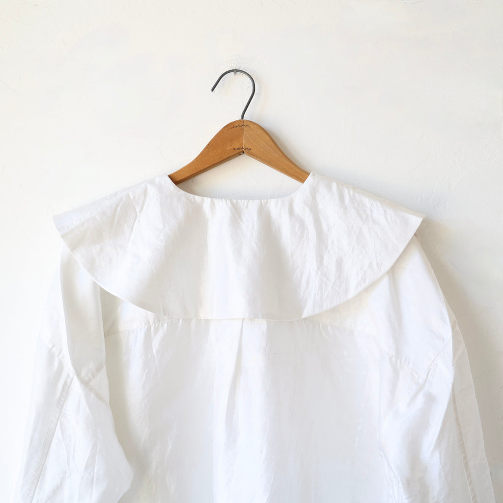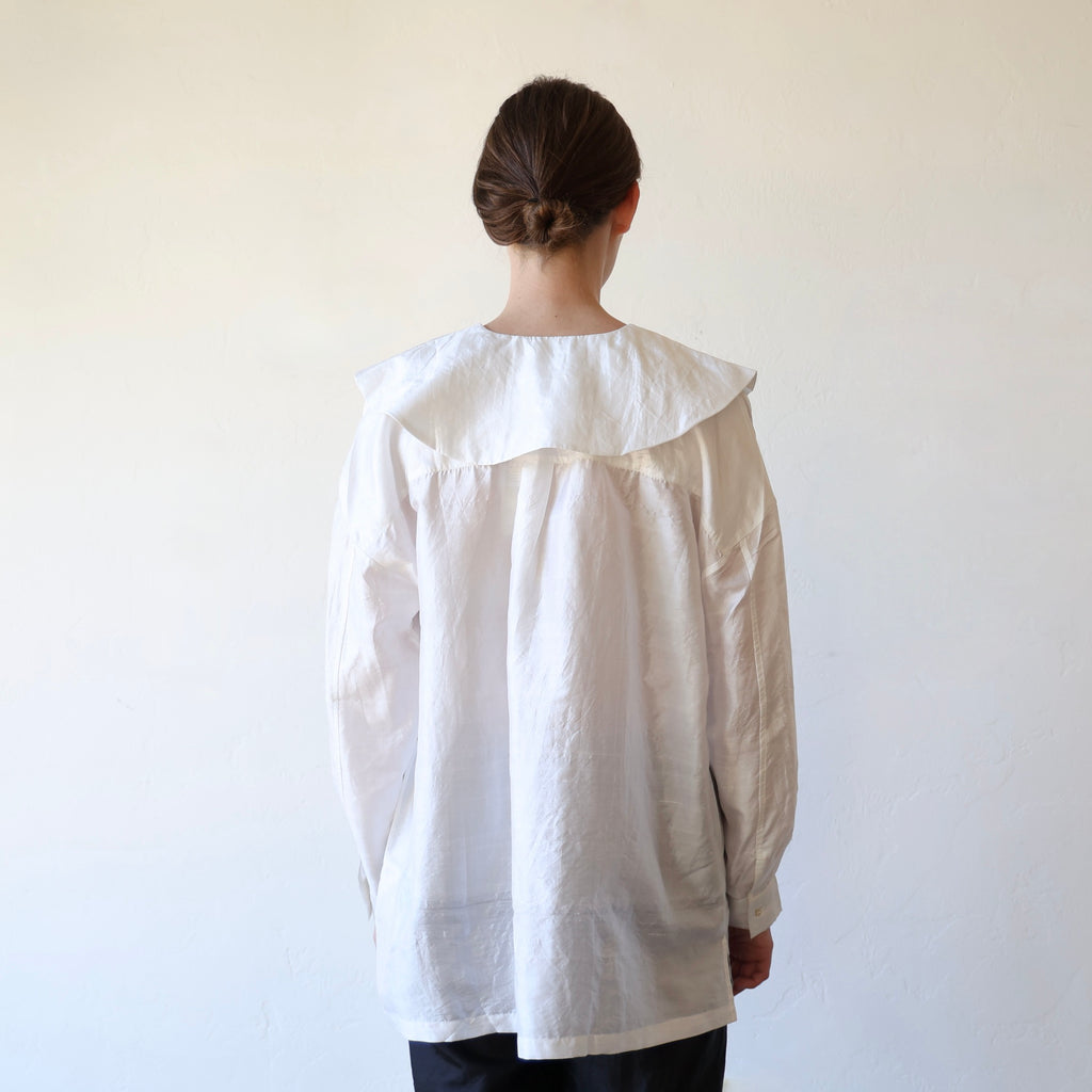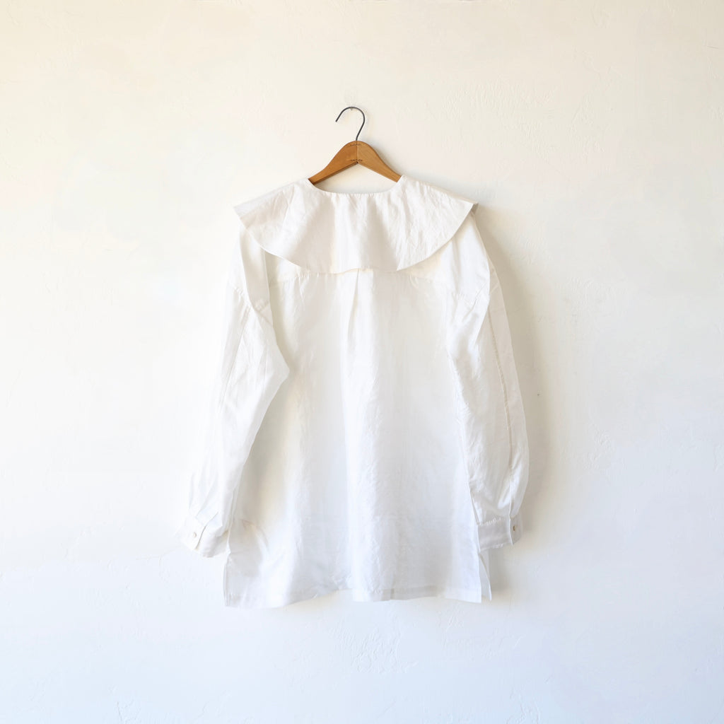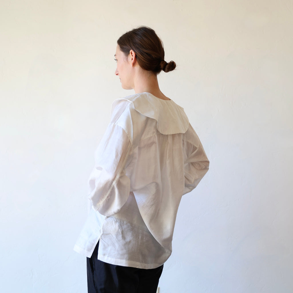 This is such a wonderful blouse with its big rounded collar and long length. This is made of Bunon's signature silk - it's light, flowy and so beautiful with it's slight, subdued sheen. It's easy to layer because the silk lays so nicely against the skin and is not bulky. It has shell buttons down the front an at the sleeve cuffs. It has a length that hits at the upper thigh. There are slits at each side and a box pleat at the back. It's a delightful piece. We love it with the Bunon Flutter Pants in black and it's also beautiful with denim.