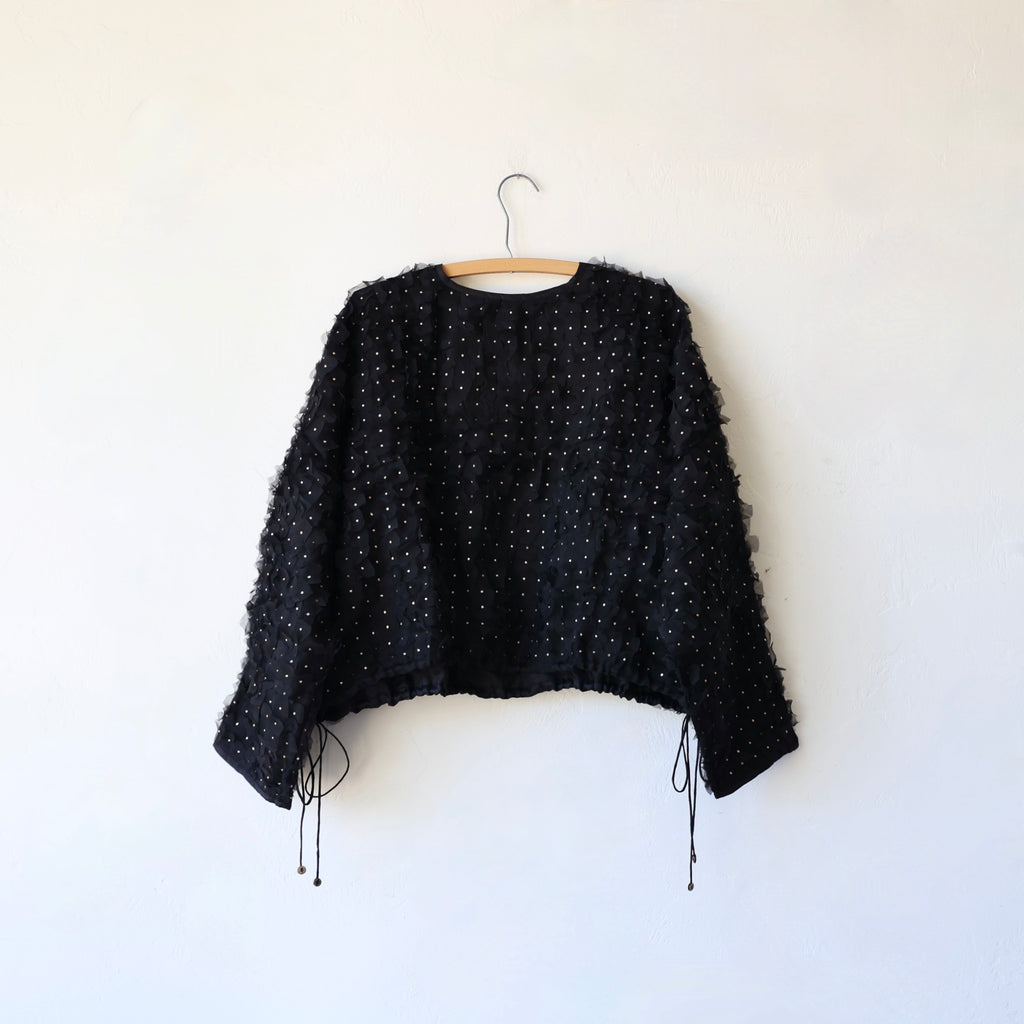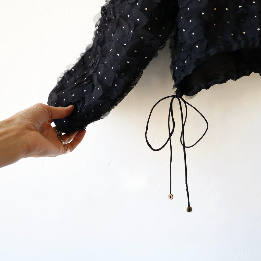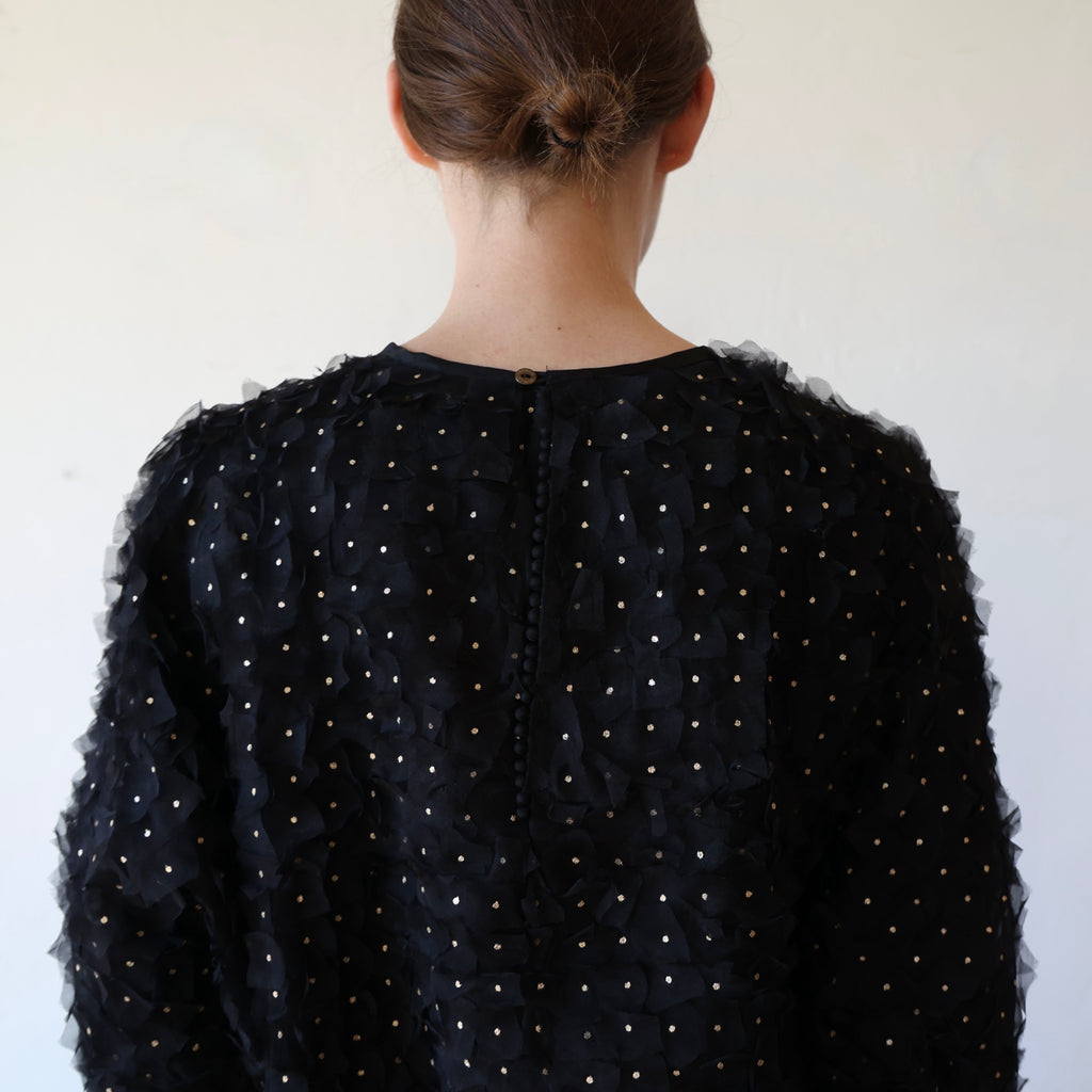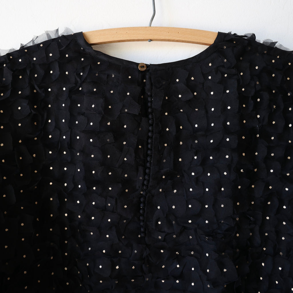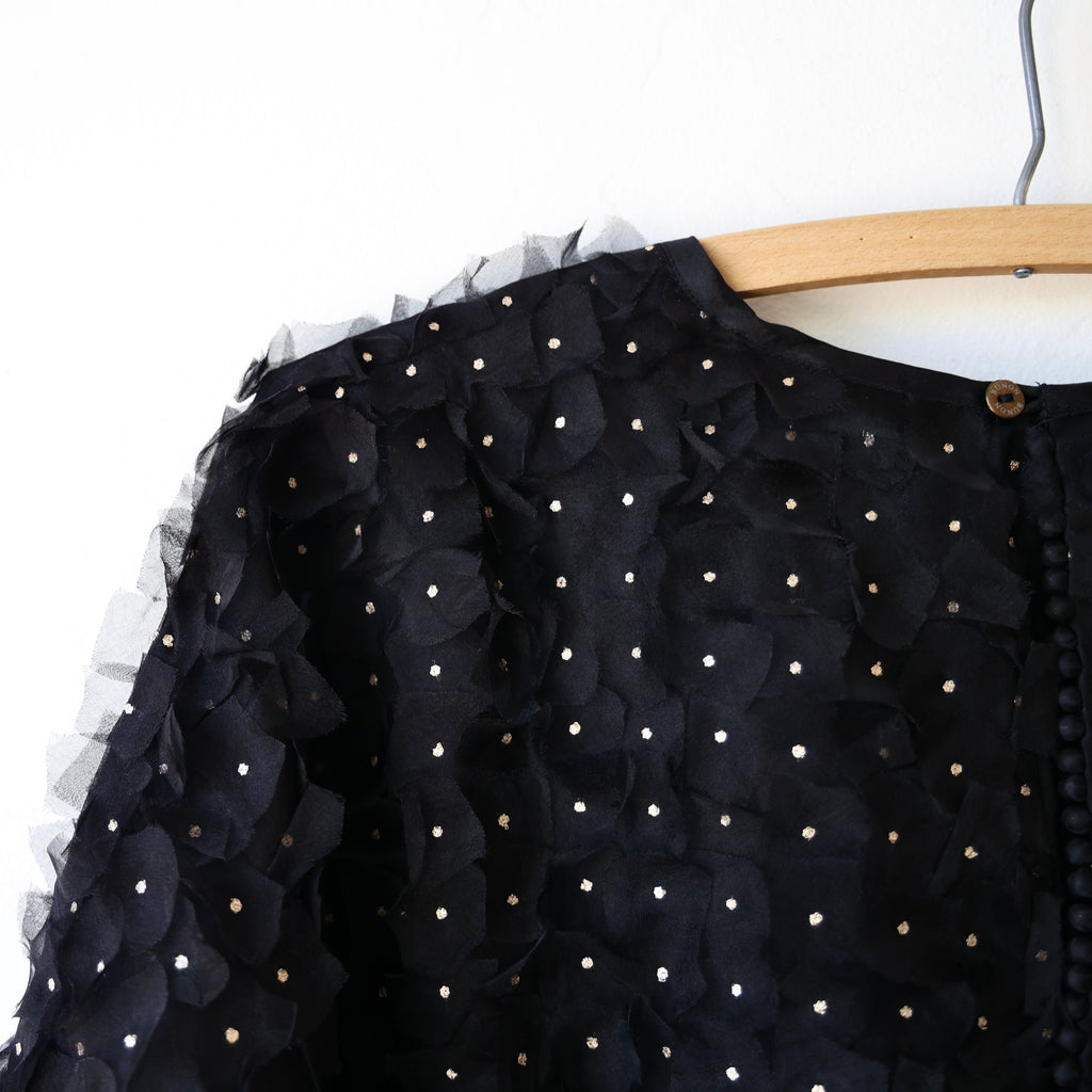 This is such a special blouse and so fun for the holiday season. This has small black silk organza flowers attached at the centers with gold thread. This leaves the petals free to create a wonderful texture across the whole blouse, front to back. The back has Bunon's signature decorative tiny covered ball detail along the closure. There is a one button closure at the top of the back. It also has a drawstring at the hem with beautiful silk ties at each side. So stunning and fun, this is such a great piece!