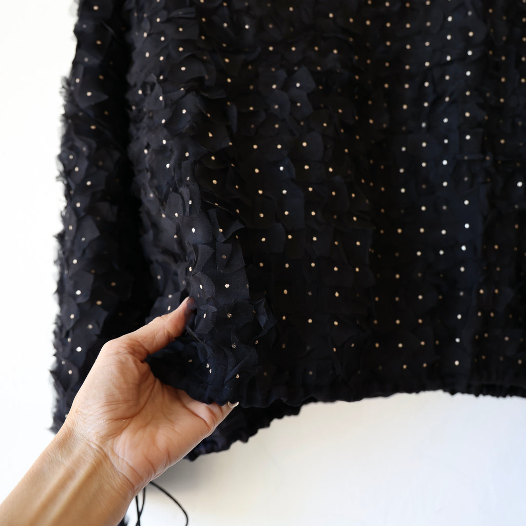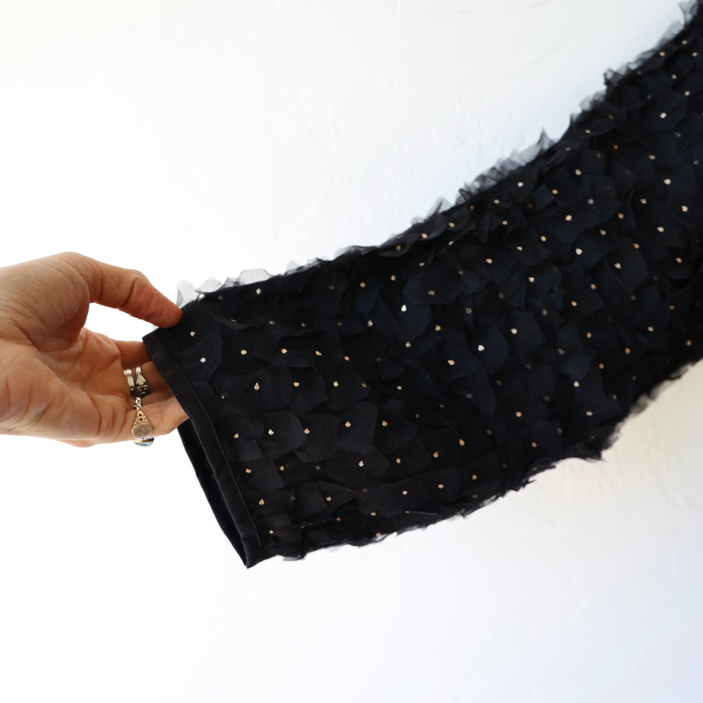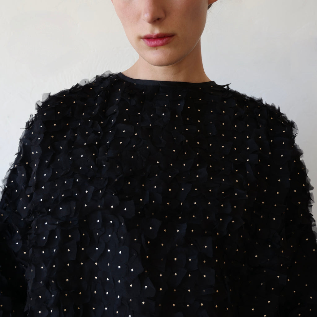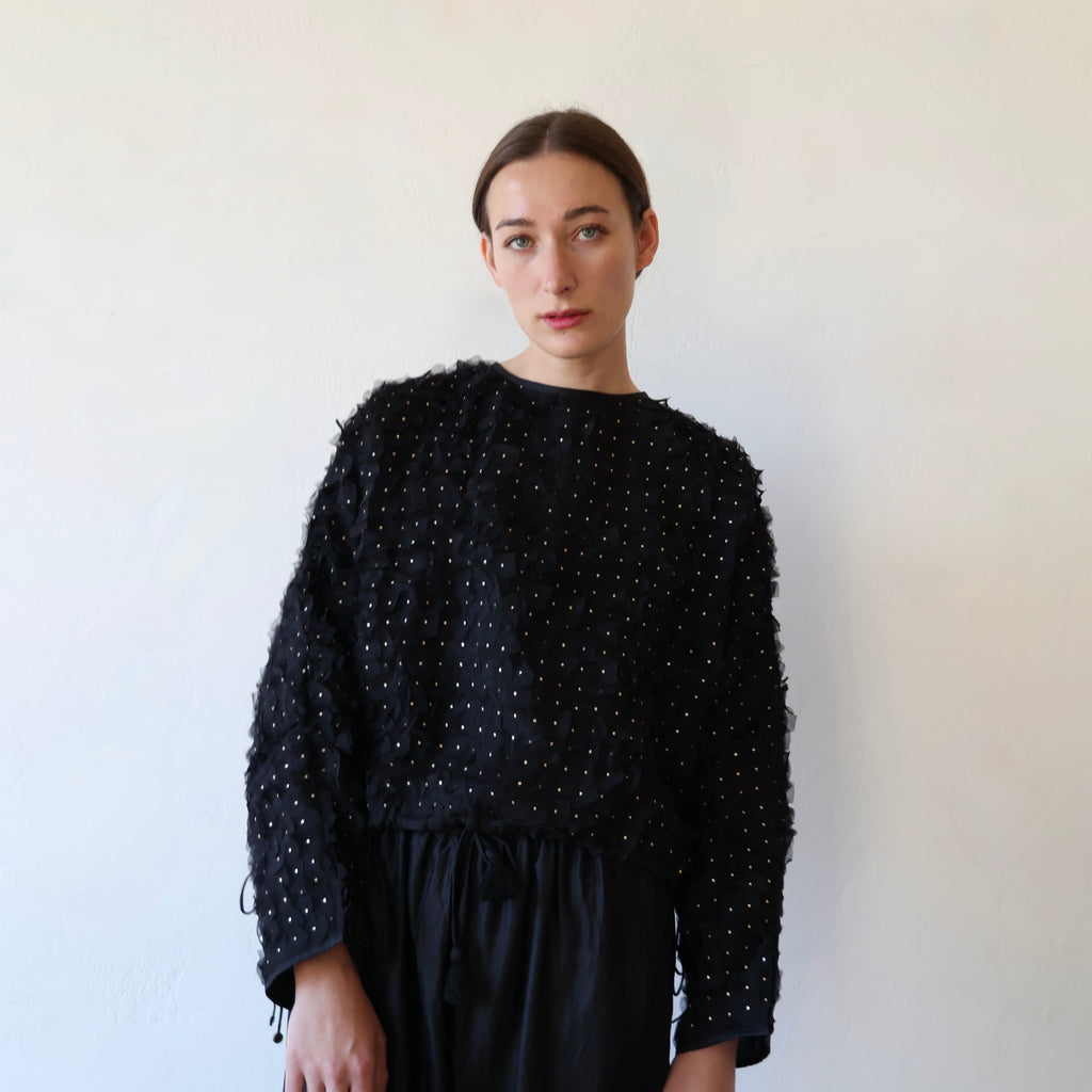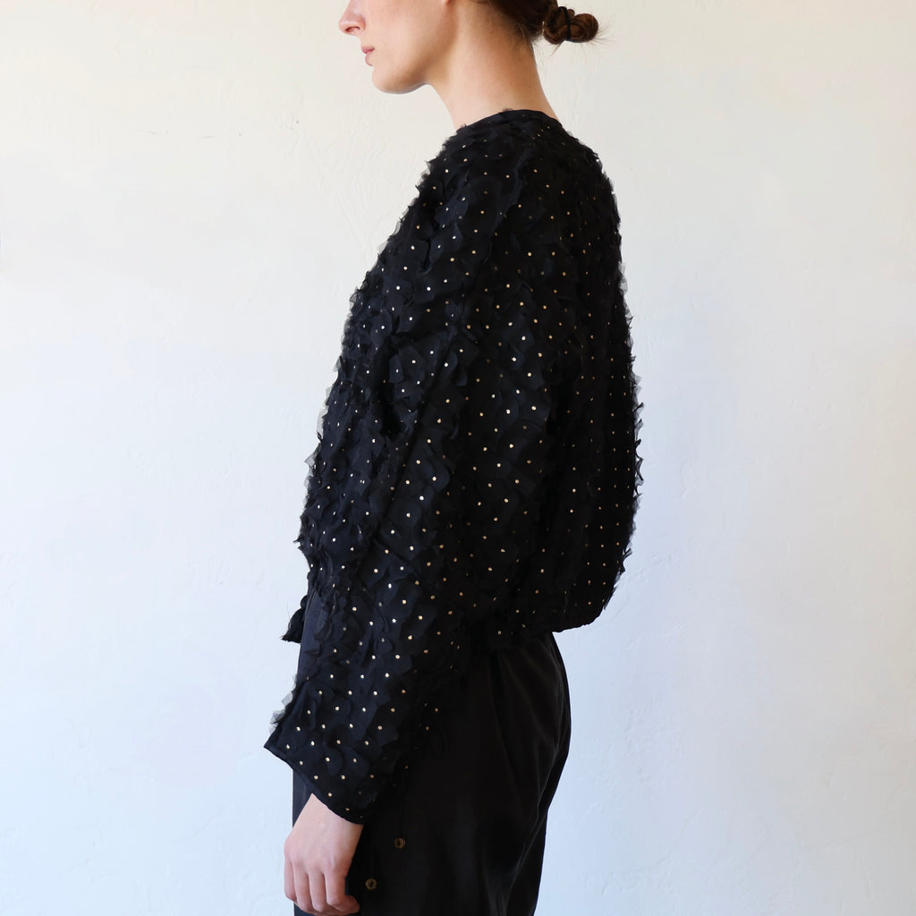 This is such a special blouse and so fun for the holiday season. This has small black silk organza flowers attached at the centers with gold thread. This leaves the petals free to create a wonderful texture across the whole blouse, front to back. The back has Bunon's signature decorative tiny covered ball detail along the closure. There is a one button closure at the top of the back. It also has a drawstring at the hem with beautiful silk ties at each side. So stunning and fun, this is such a great piece!