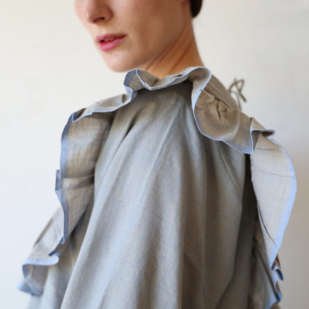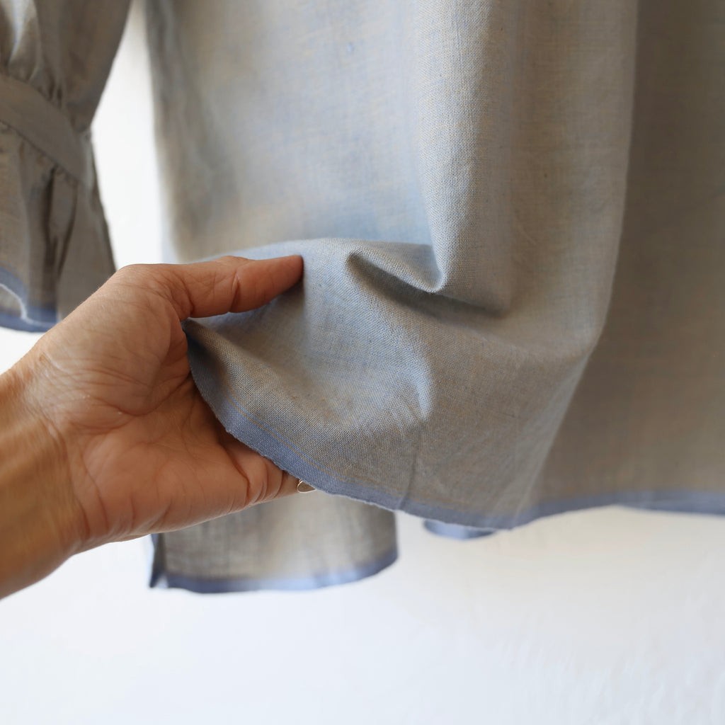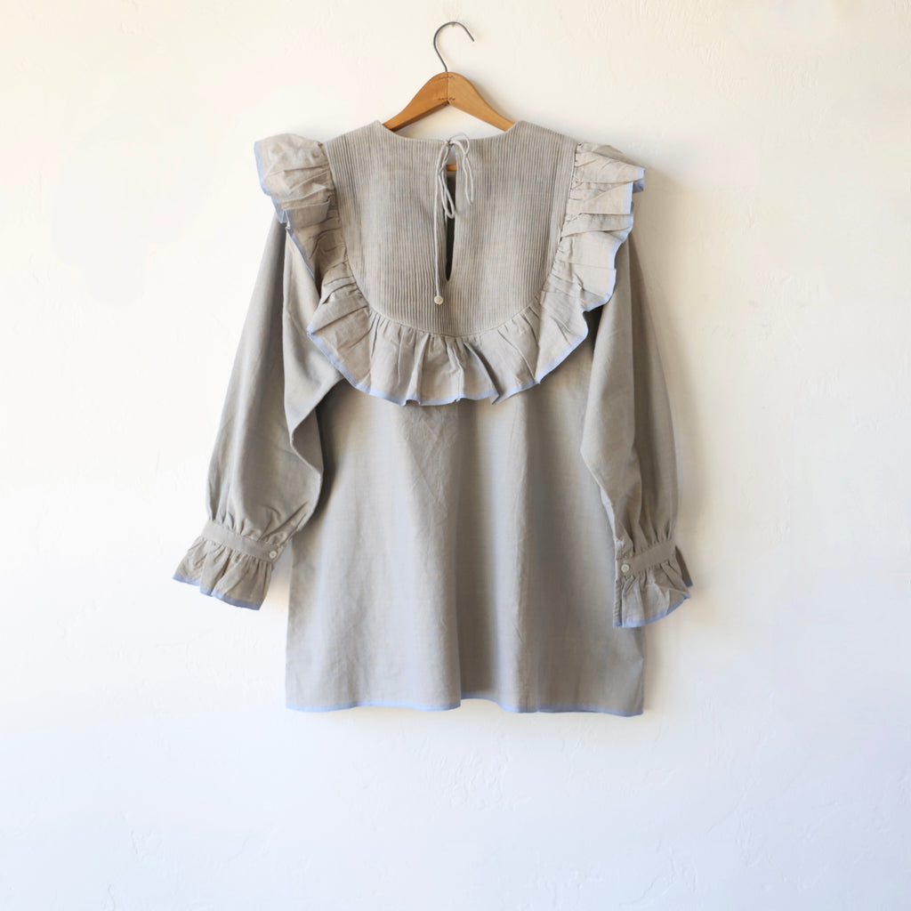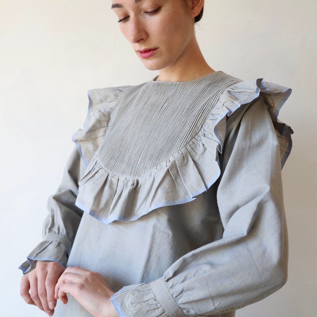 A stunning blouse made of a beautiful handwoven cotton. This has tiny pin tucks down the top of the front and back, lined with a medium size ruffle. The cuffs also have this fun ruffle. We love the slight variation of color at the edge of the ruffles... it's adds the perfect touch of detail. The back has a lovely tie closure. This looks really beautiful with the Runaway Bicycle Kent Pants in burgundy. We also love it with dark denim.