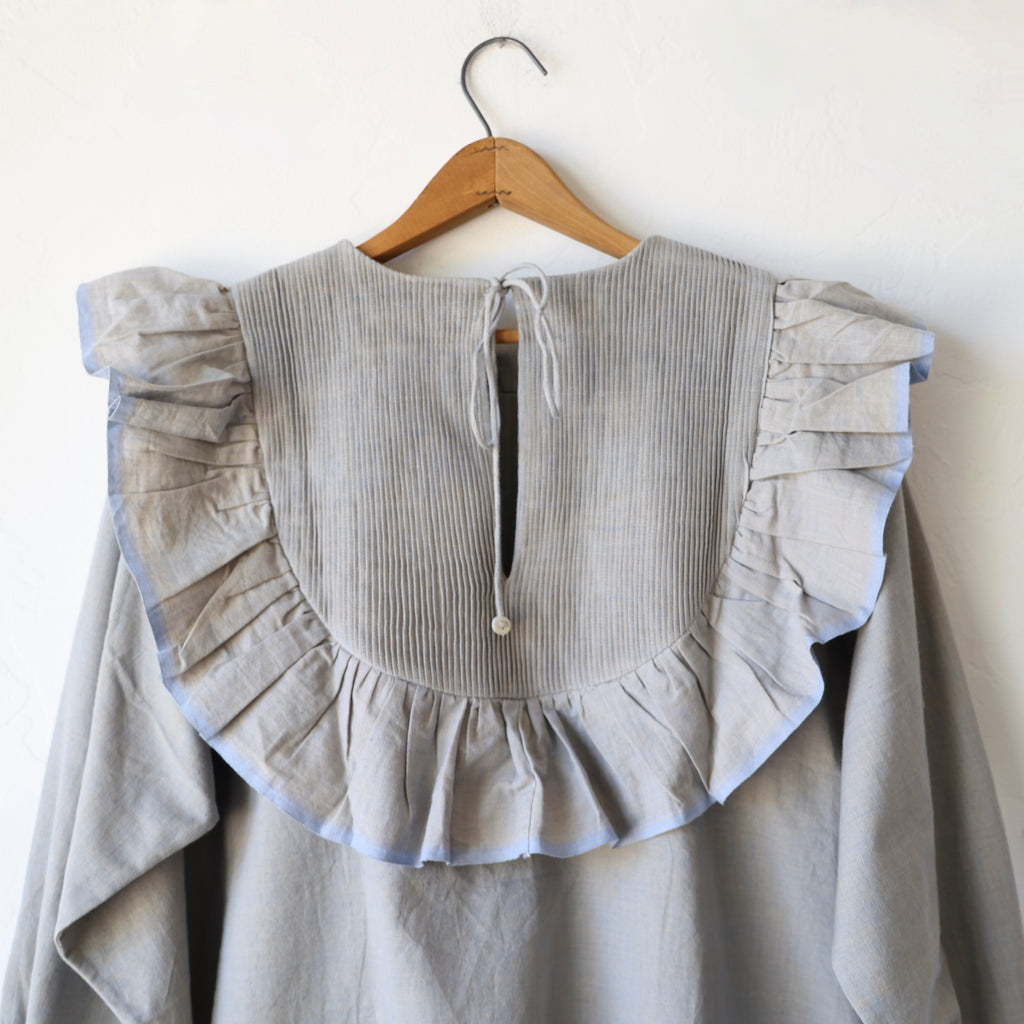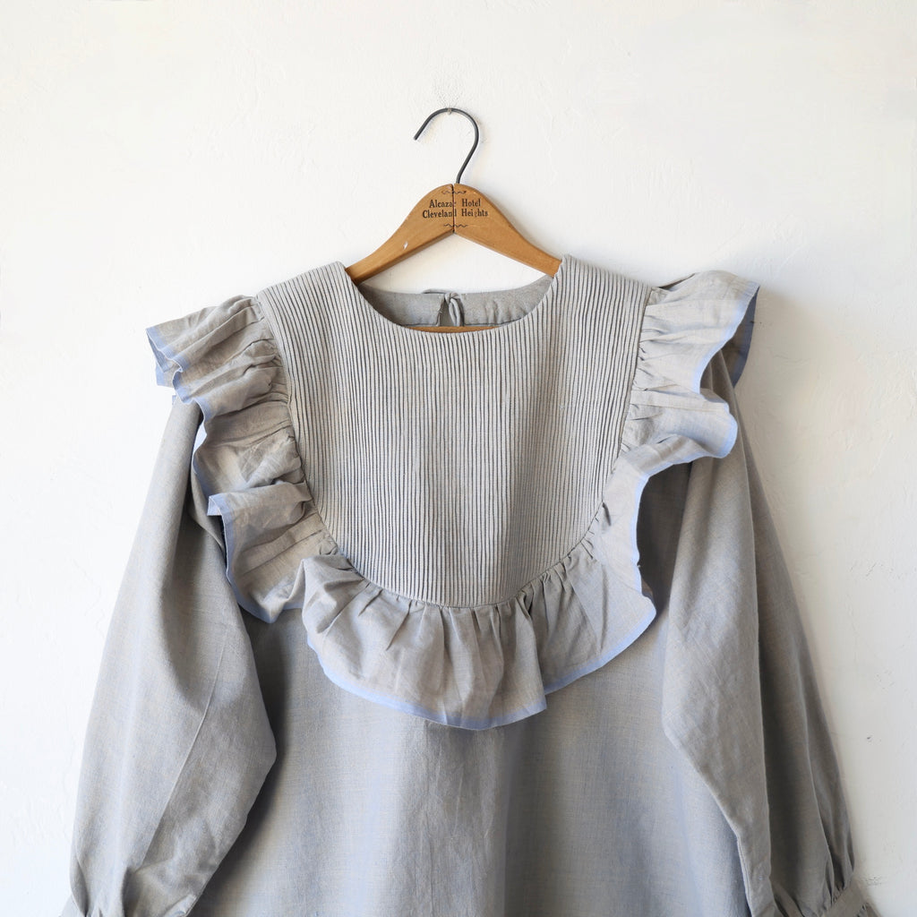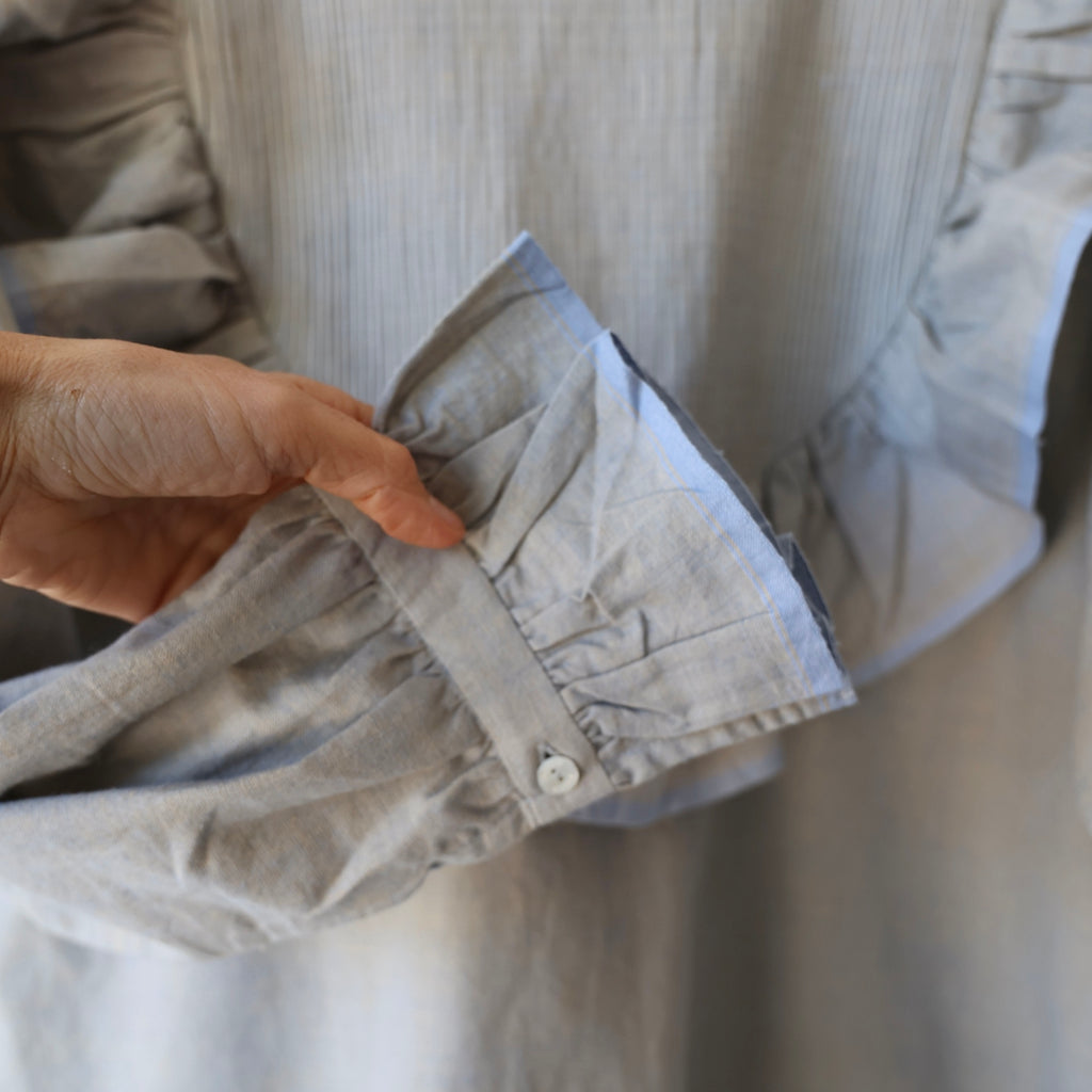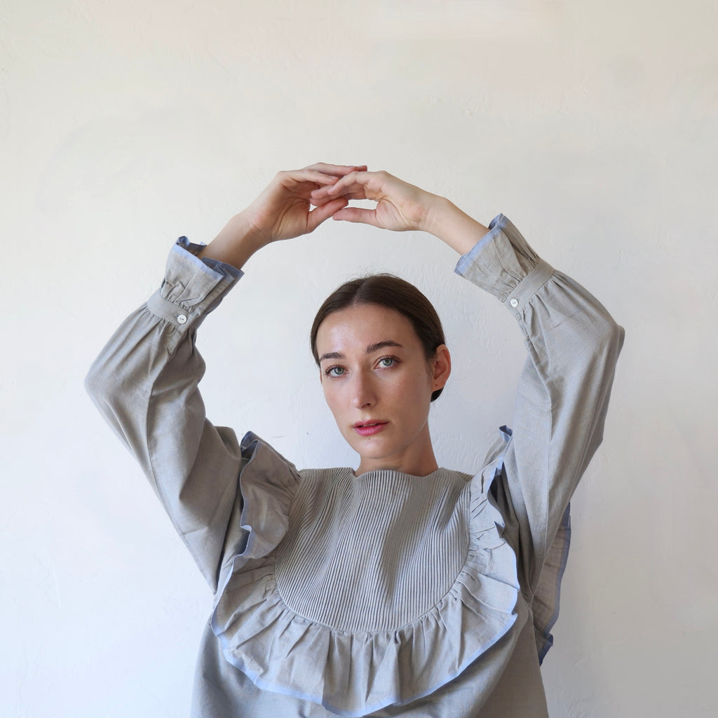 A stunning blouse made of a beautiful handwoven cotton. This has tiny pin tucks down the top of the front and back, lined with a medium size ruffle. The cuffs also have this fun ruffle. We love the slight variation of color at the edge of the ruffles... it's adds the perfect touch of detail. The back has a lovely tie closure. This looks really beautiful with the Runaway Bicycle Kent Pants in burgundy. We also love it with dark denim.
