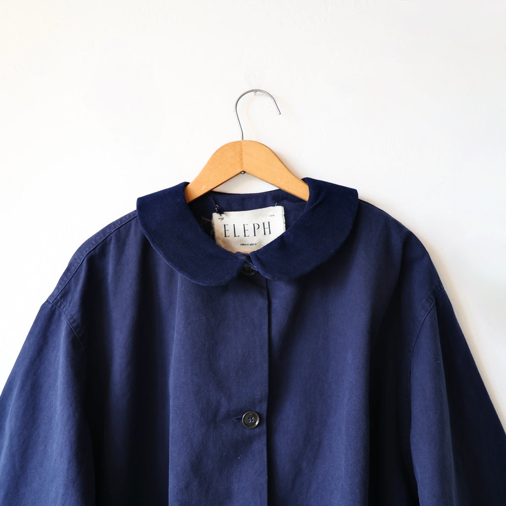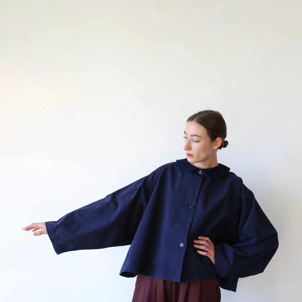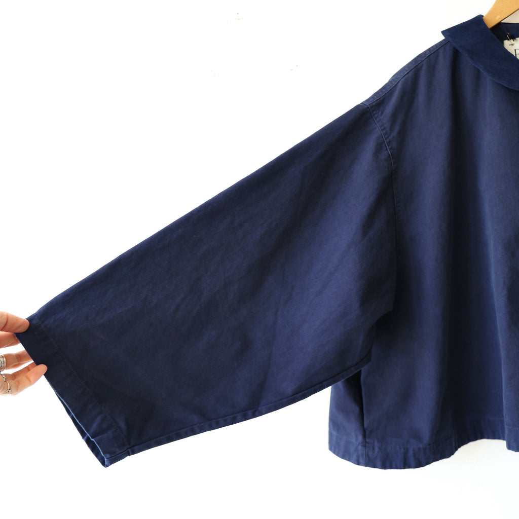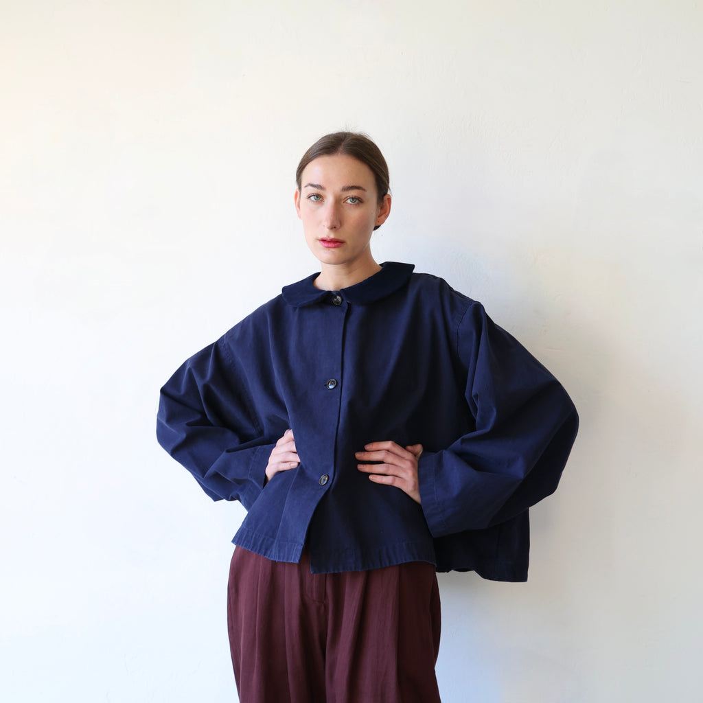 This is such a wonderful jacket. It has an oversized fit in the body and sleeves, creating a fun silhouette. It's made of a vintage washed cotton with a peter pan collar made of corduroy. It has brown buttons down the front. The sleeves are easy to roll. We love the exaggerated shape of this jacket - it's super comfortable and easy to wear.