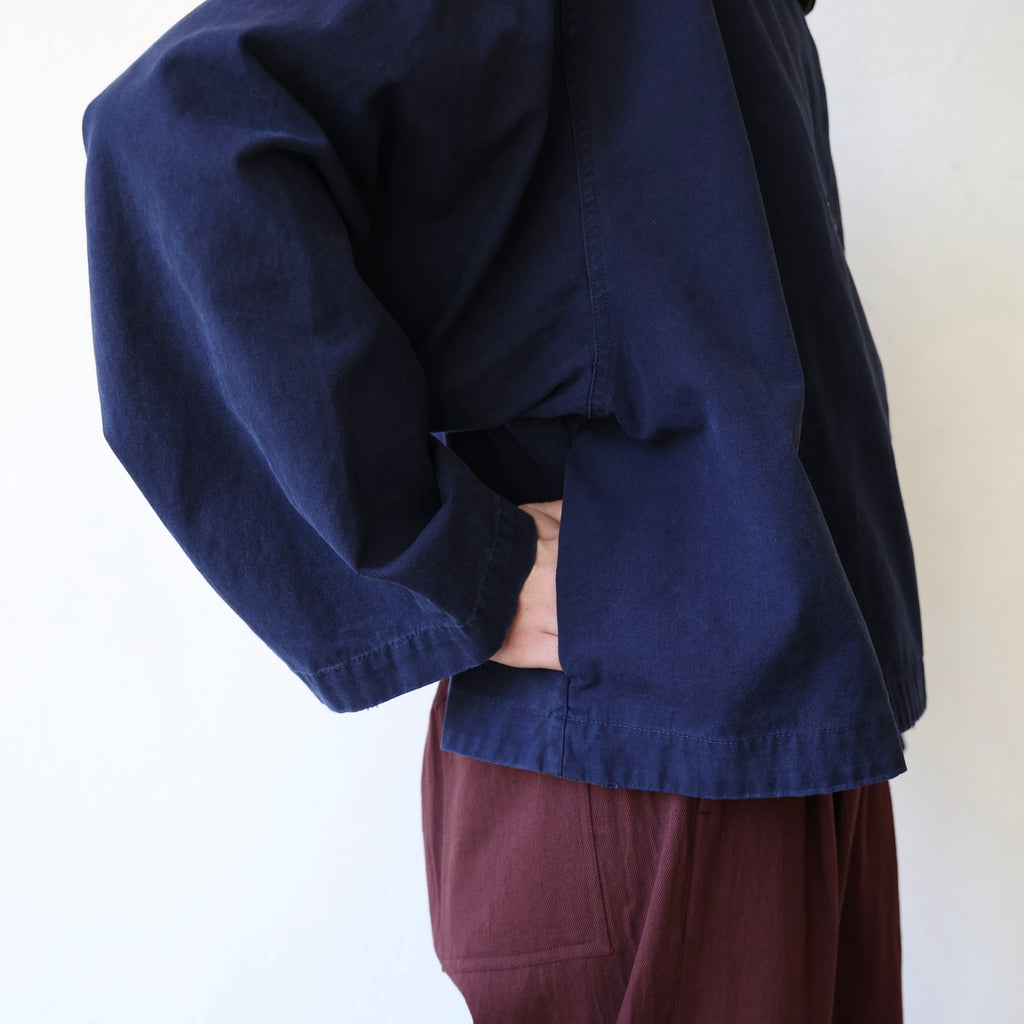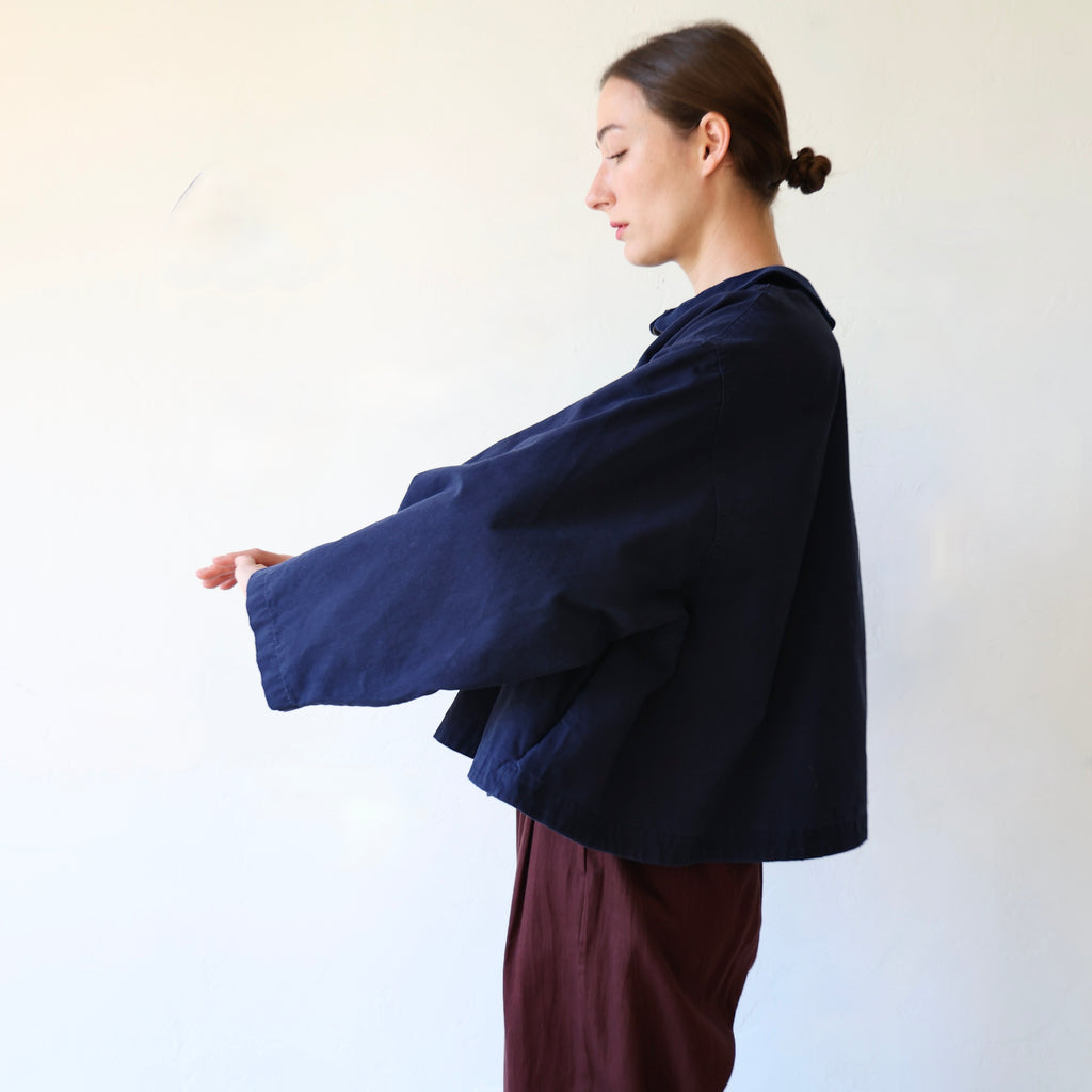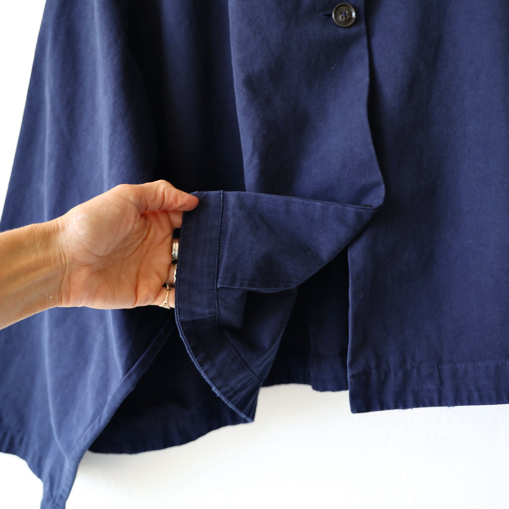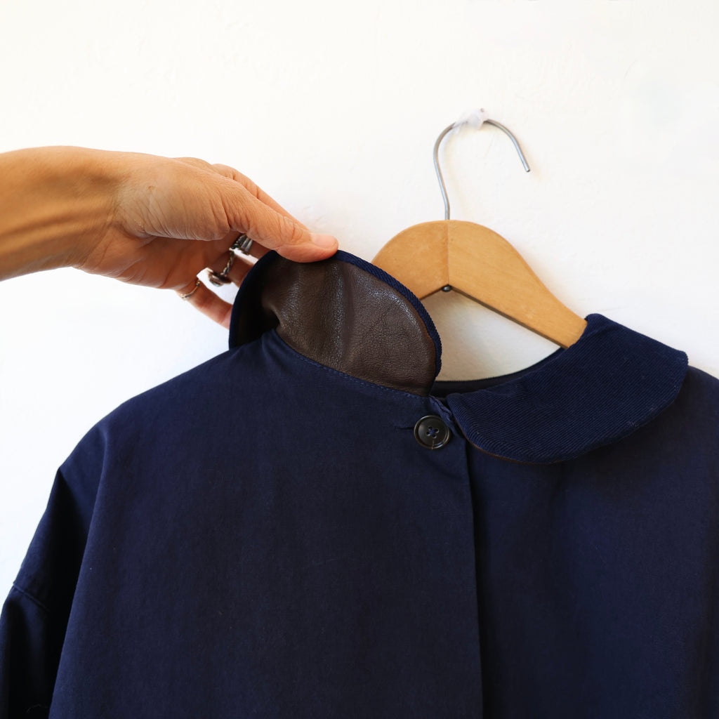 This is such a wonderful jacket. It has an oversized fit in the body and sleeves, creating a fun silhouette. It's made of a vintage washed cotton with a peter pan collar made of corduroy. It has brown buttons down the front. The sleeves are easy to roll. We love the exaggerated shape of this jacket - it's super comfortable and easy to wear.