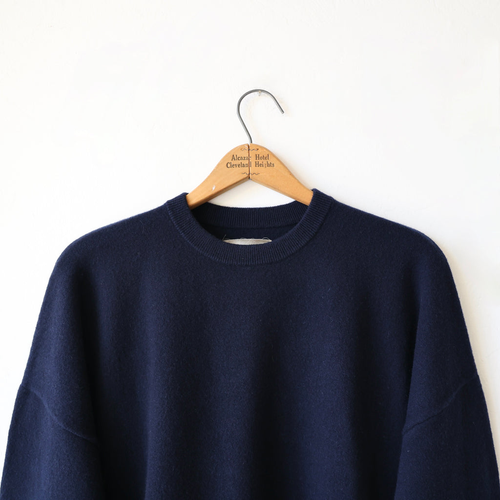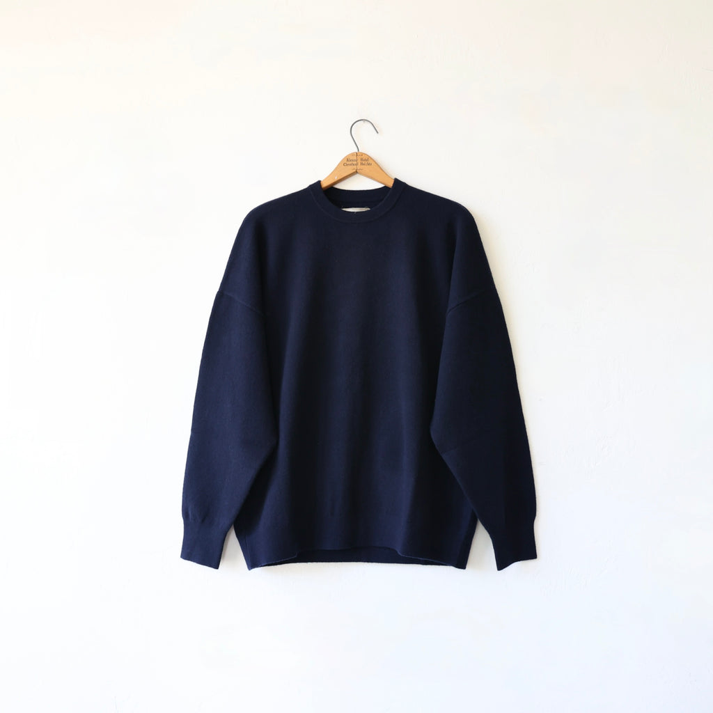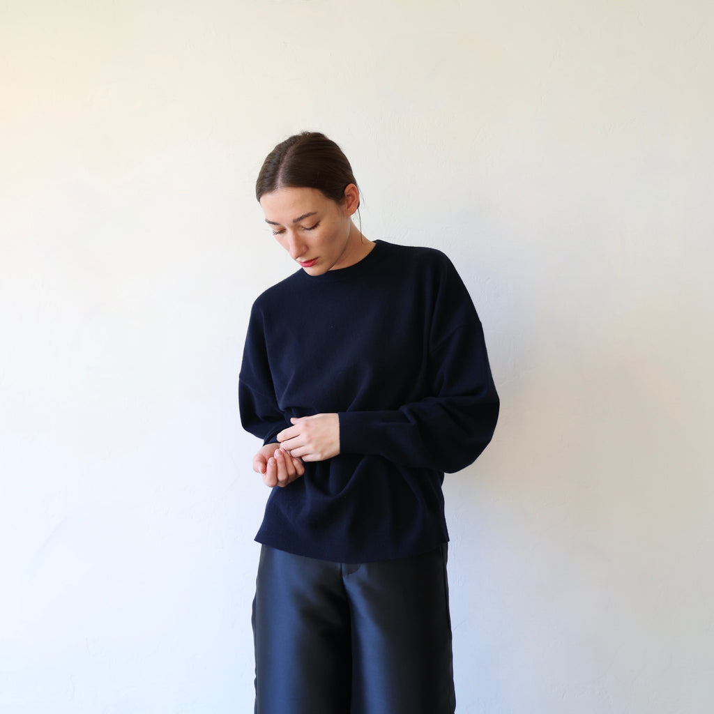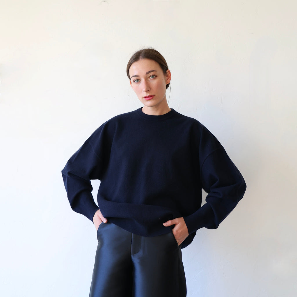 A beautiful stretch cashmere sweater with a great fit! It has a crewneck and ribbing along the cuffs and hem. It's made of a medium to heavy weight cashmere - it's very warm and cozy. This is a great piece for everyday use and we also love the idea of dressing it up with a beautiful pair of earrings and trousers. We show it with the Eleph Sweet Bow Trousers - a beautiful combination! It's also great layered with a white shirt underneath - a nice option is the A'Court Portobello shirt in snow.