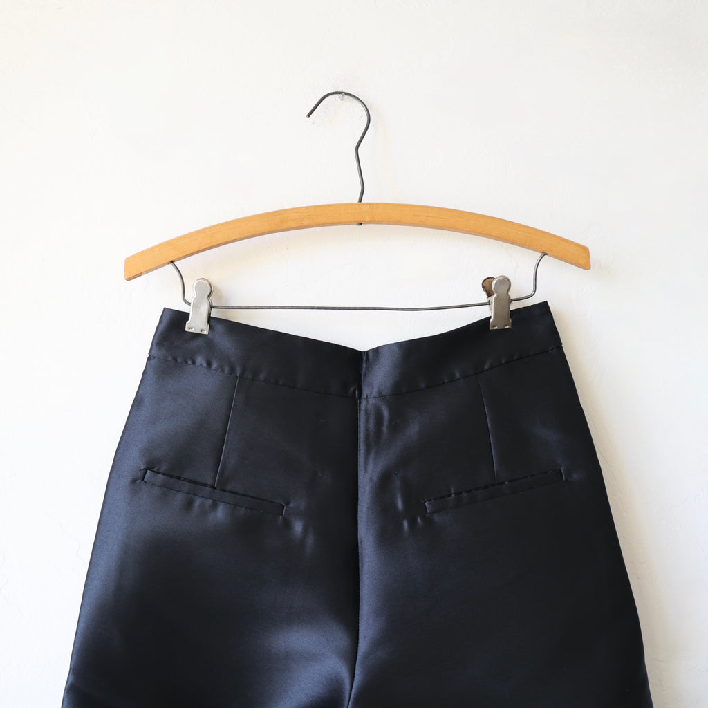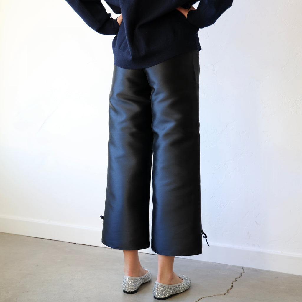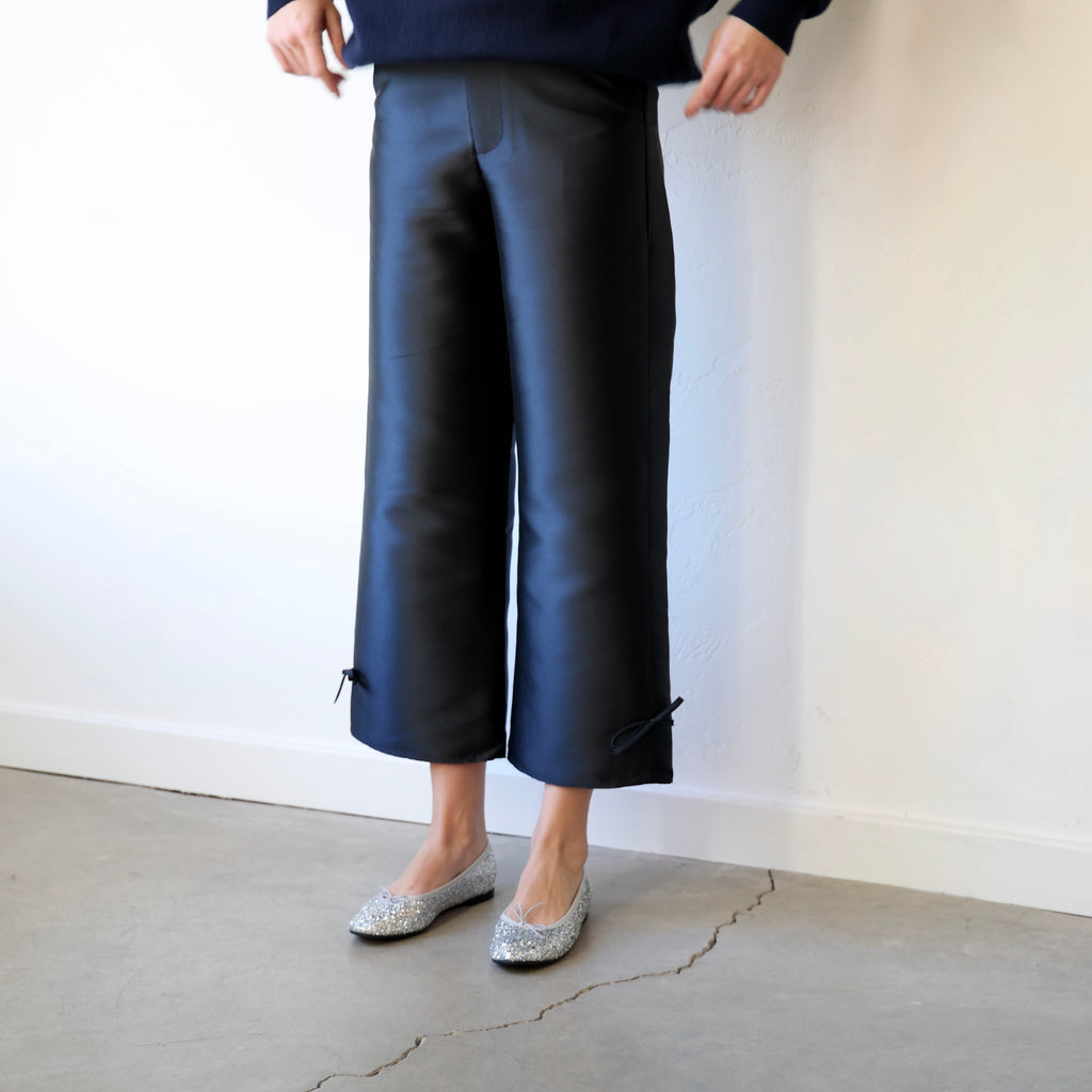 These are such a beautiful pair of pants! They have a sheen that feels fun and a bit fancy. They have a front zipper fly, side pockets and welt pockets at the back. The leg has a straight cut and they have a cropped fit. At the bottom of the leg on each side is a tiny bow. We show them with the Biggie Sweater by Eleph, and the silver sparkle Repettos - a fun combination!