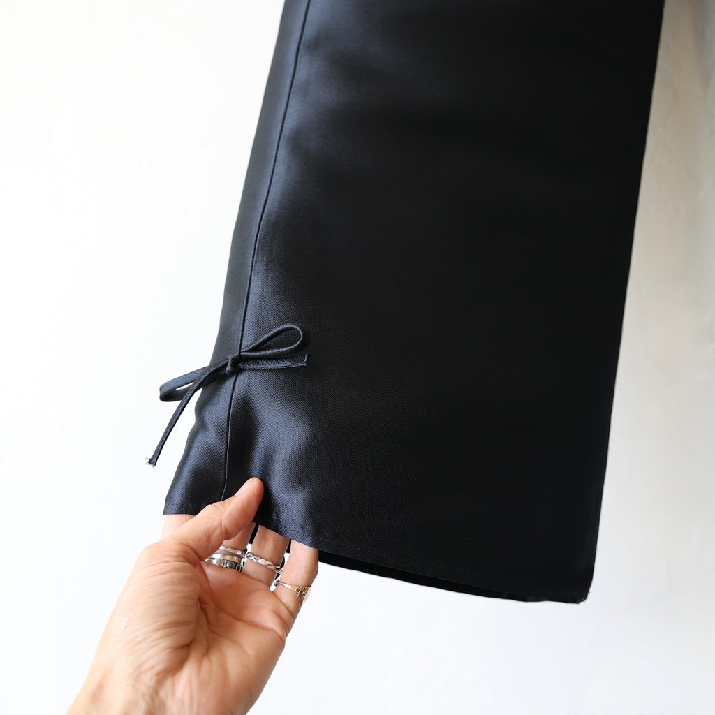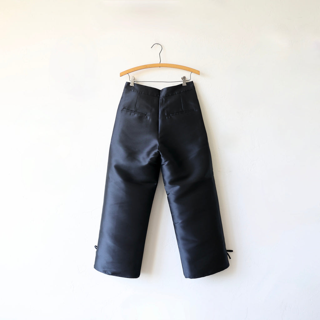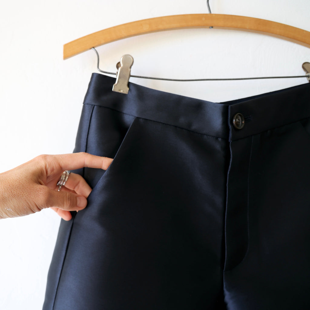 These are such a beautiful pair of pants! They have a sheen that feels fun and a bit fancy. They have a front zipper fly, side pockets and welt pockets at the back. The leg has a straight cut and they have a cropped fit. At the bottom of the leg on each side is a tiny bow. We show them with the Biggie Sweater by Eleph, and the silver sparkle Repettos - a fun combination!
